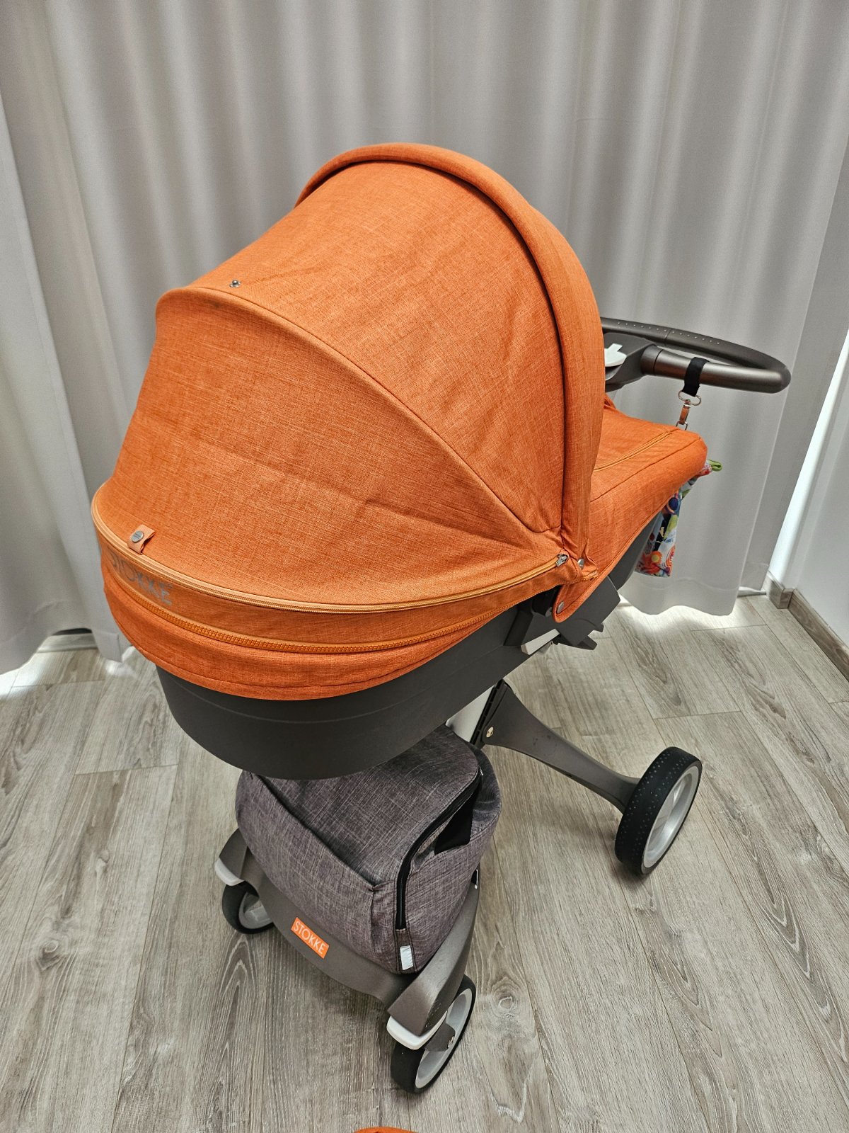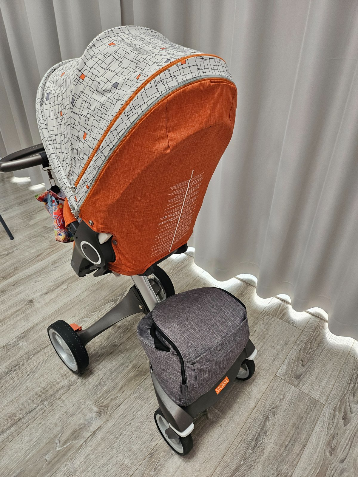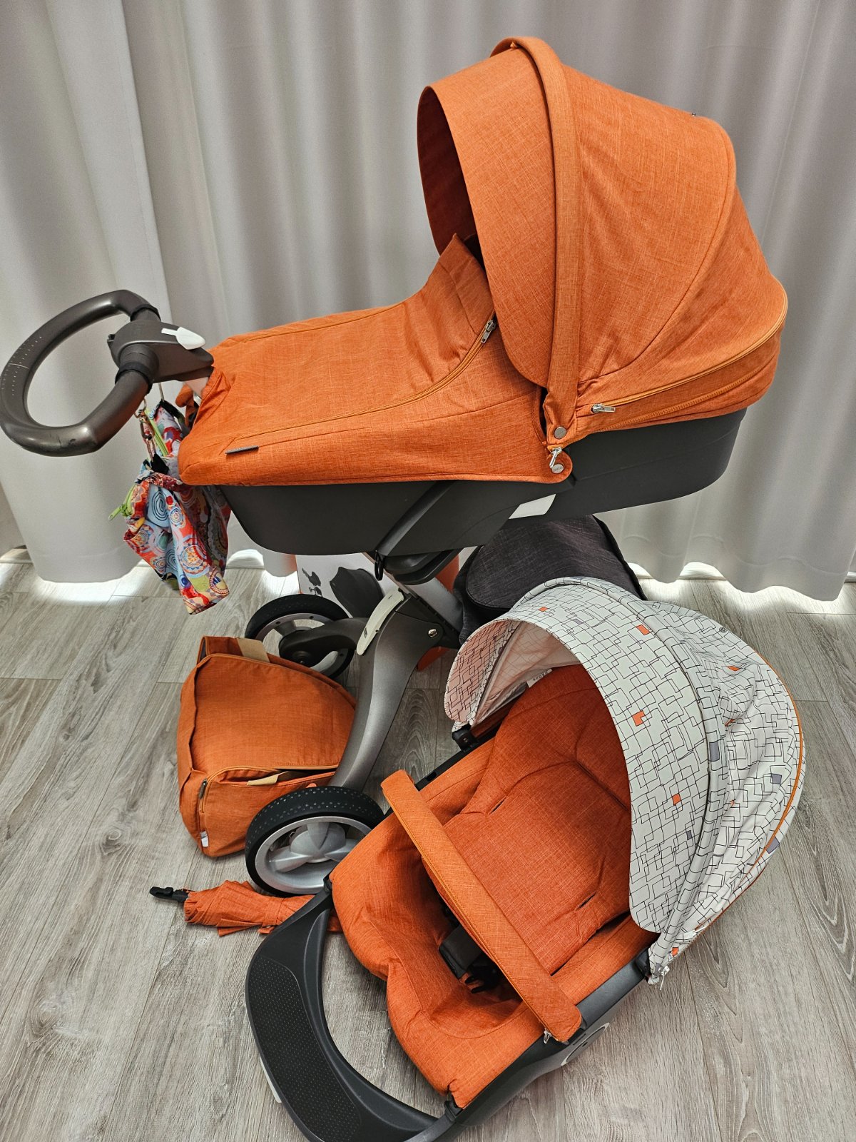Predám kočík stokke xplory V5 v kompletnej výbave. Kočík sa skladá z vaničky, športovej časti, zimný set, rukávnik, fusak stokke, tenký jarný fusak v čiernej farbe, style kit, slnečník, 2x sieťka proti hmyzu, 2x pláštenka proti dažďu, 2x zadná taška v farbe orange melange a gray melange, držiak na pohár, deka stokke, skate pre druhe dieťa.