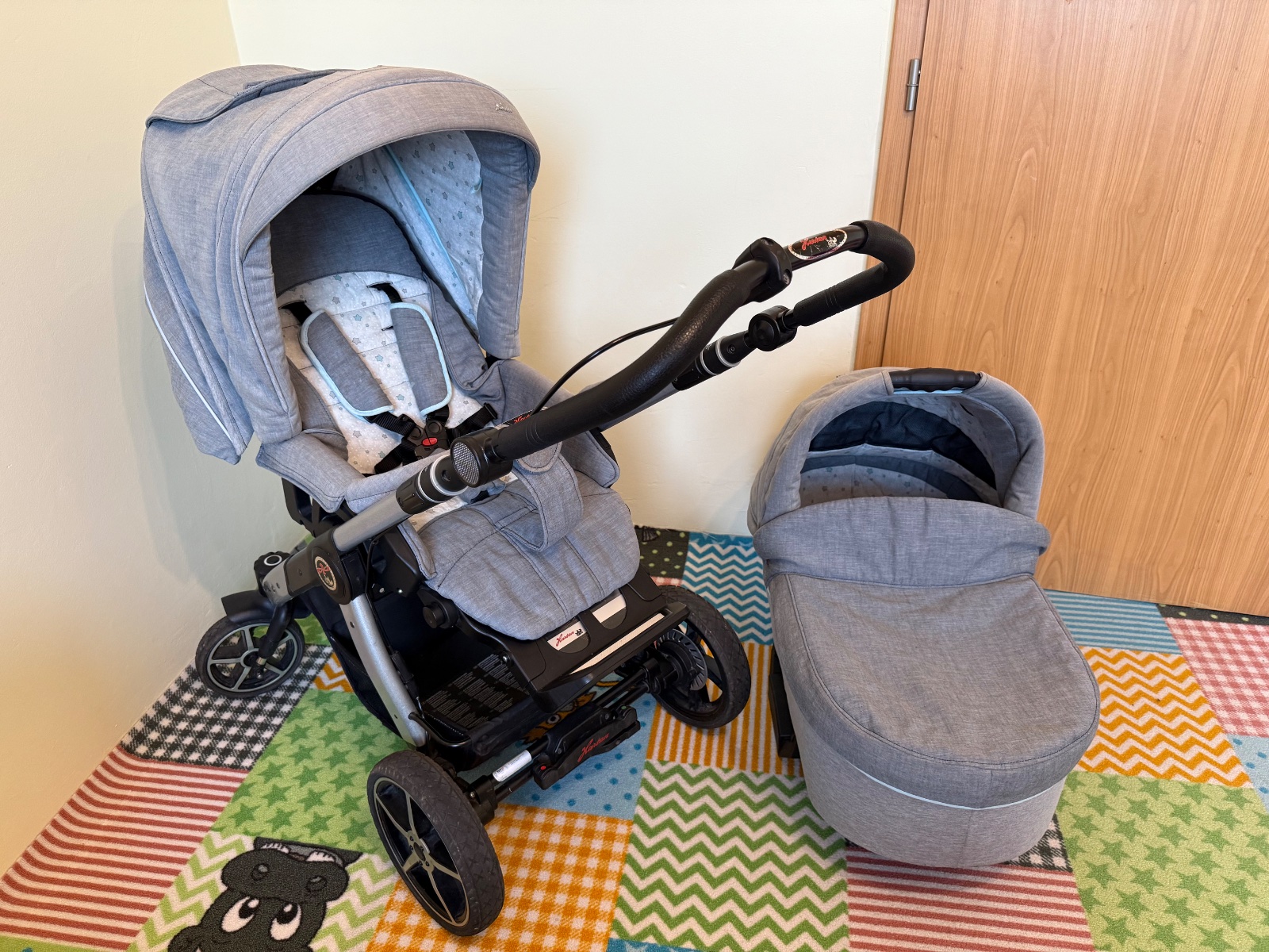 Športová verzia je polohovateľná zo sedu do úplného rovného ľahu (nie korýtko). Dá sa upevniť na podvozok v smere/protismere jazdy. Opierka rúk s prateľným poťahom. Opierka nôh polohovateľná, nastaviteľná aj dĺžka. 5-bodové bezpečnostné zapínanie, veľká polohovateľná strieška s okienkom a možnosťou ventilácie so sieťkou. Nánožník a nastaviteľný slnečník S. Oliver. Veľká vanička s nastaviteľnou strieškou so slnečným štítom, originálny matrac s kokosovými vláknami. Celý poťah kočíka je prateľný. Predné menšie otočné kolieska sú aretovateľné, dajú sa zafixovať v smere jazdy. Dajú sa vymeniť za veľké terénne pevné kolieska (v cene). Koženná rúčka kočíka je výškovo nastaviteľná (5polôh). Raincover na športovú verziu a vaničku v cene. Poťahy na kolieska, adaptér na vajíčko a sieťka proti hmyzu v cene. Plne funkčný, bežné známky používania (hlavne škrabance). Chýba 1 háčik na spodu košíka na veci. Zložiteľný do auta. Dohoda možná. Len osobný odber v BA-Dúbravka.