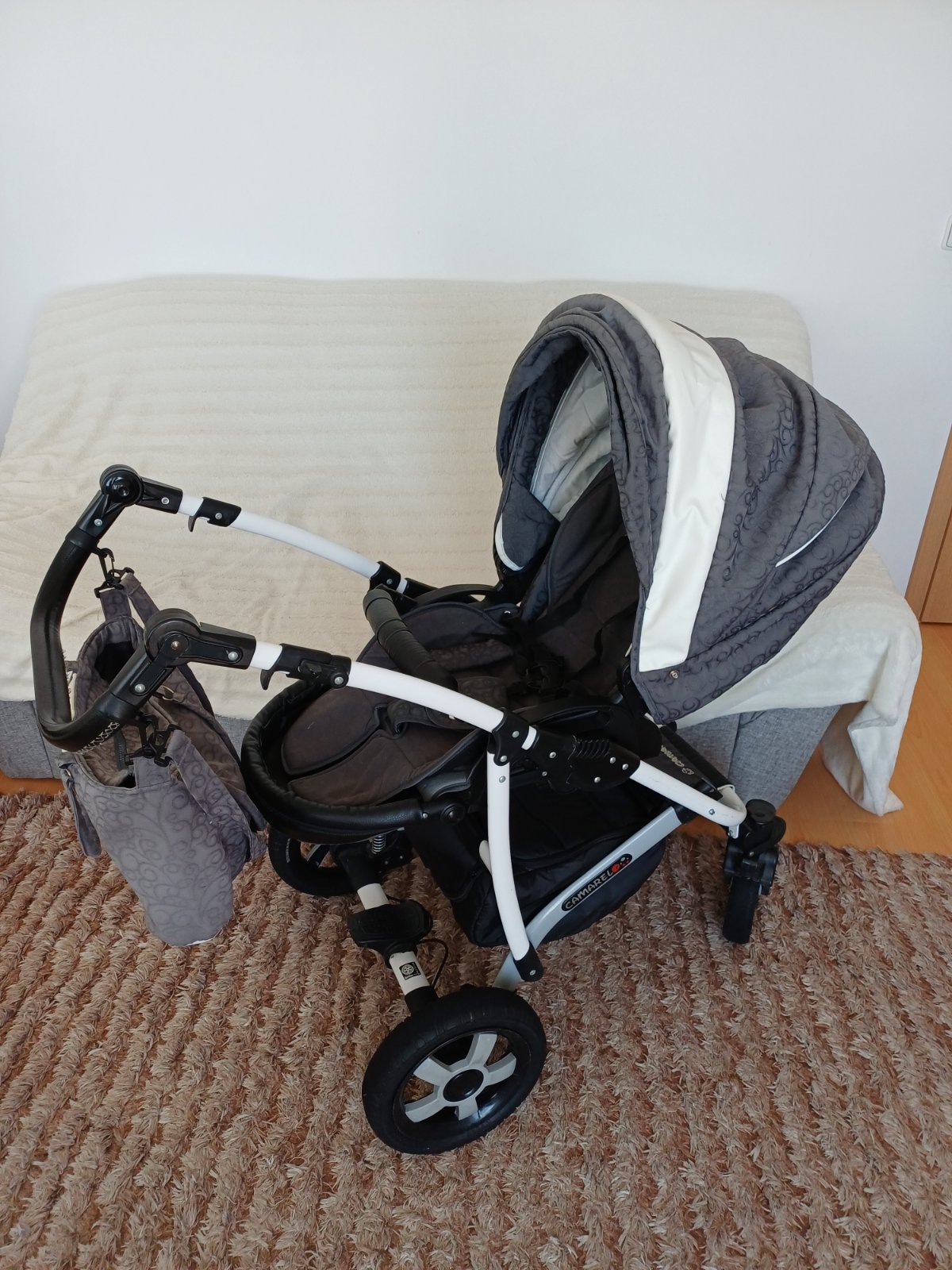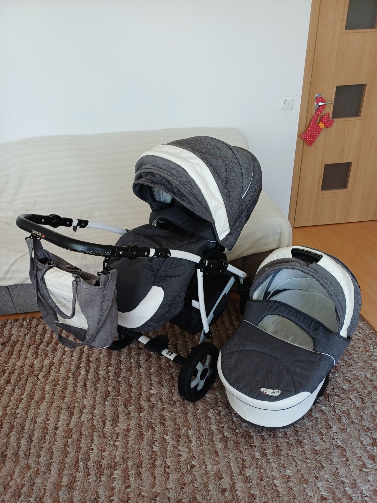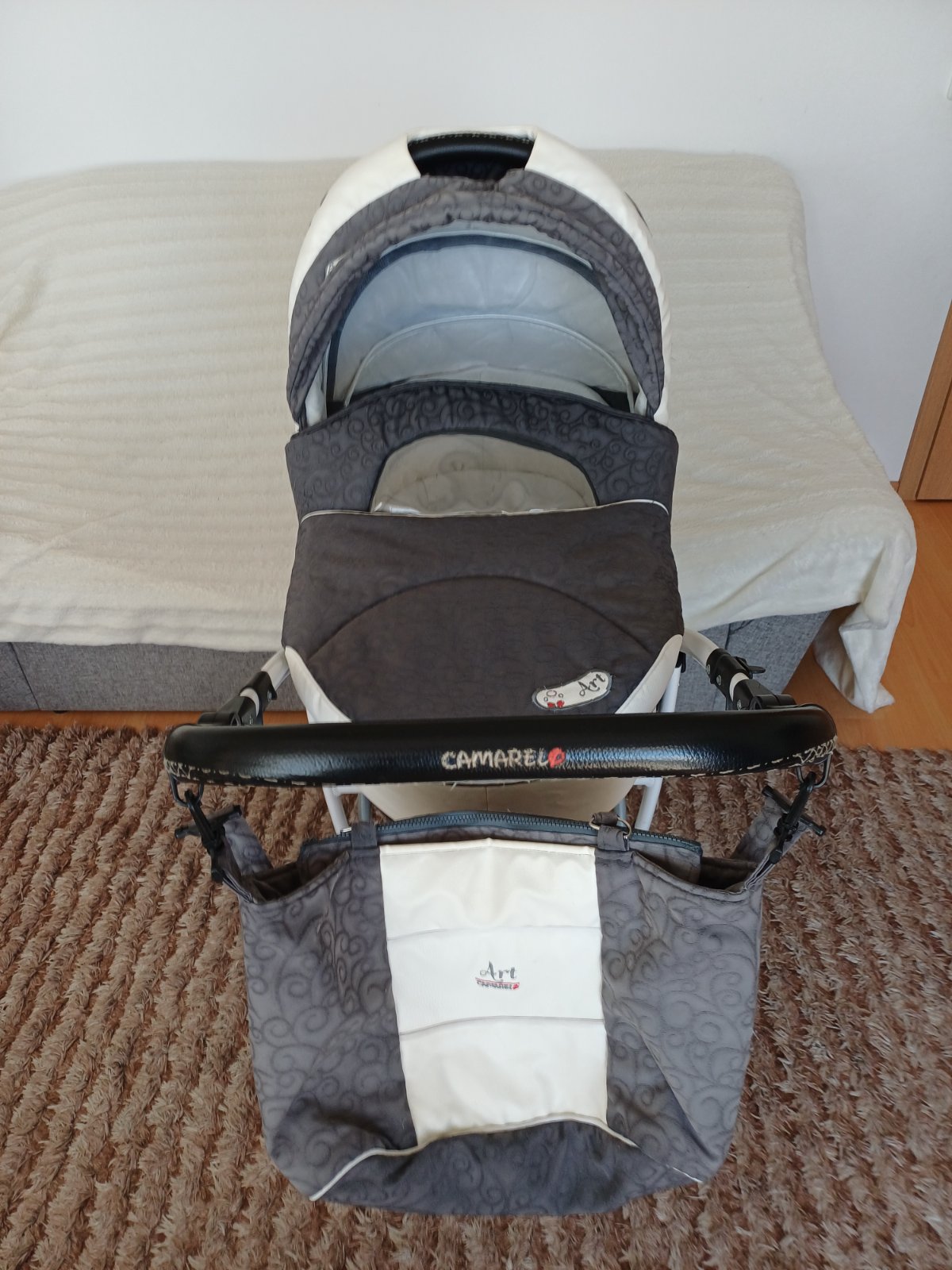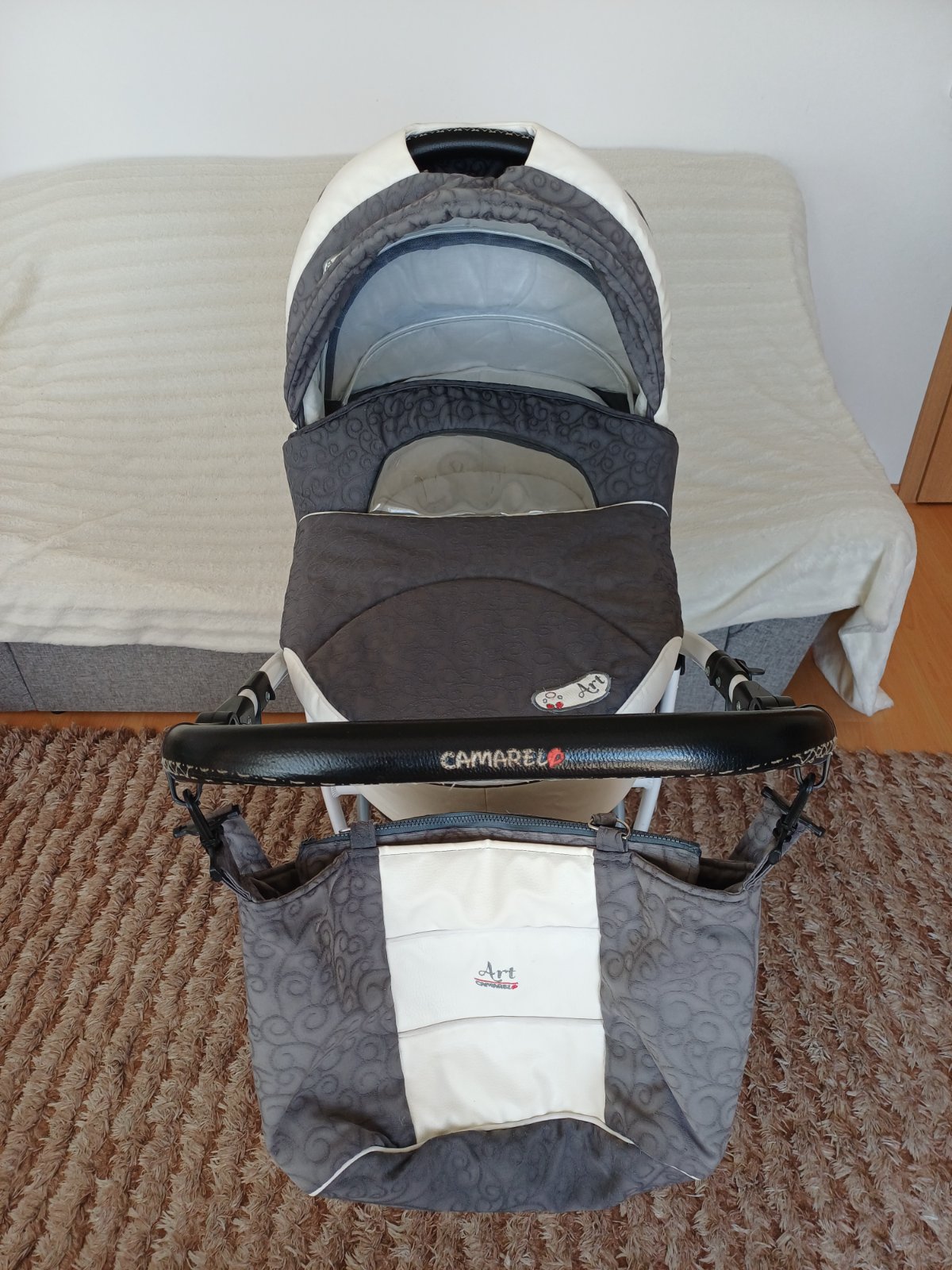 Predám detský kočík 2v1 kombinovaný Camarelo Art Limited. V dobrom stave, nezničený, funkčný, pneumatiky majú známky opotrebenia viď foto. Predné otočné kolesá, kolesá sú fúkateľné, brzda, nastaviteľné madlo. Príslušenstvo: taška na madlo, uložný priestor pod kočíkom, pláštenka a kryt na hlboký aj športový kočík.