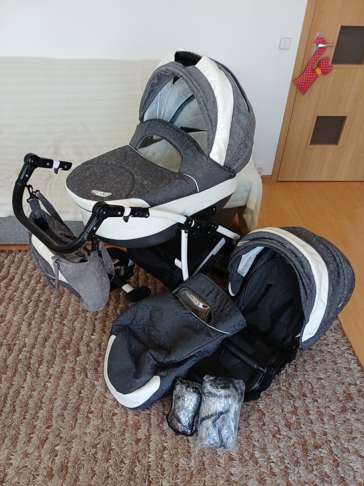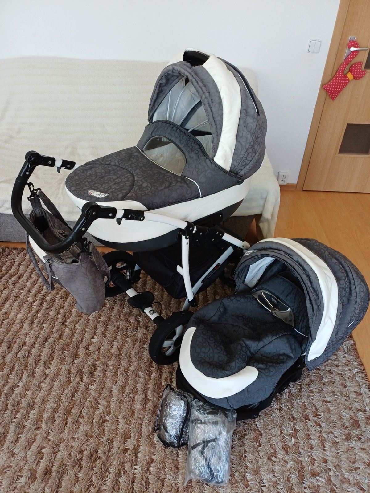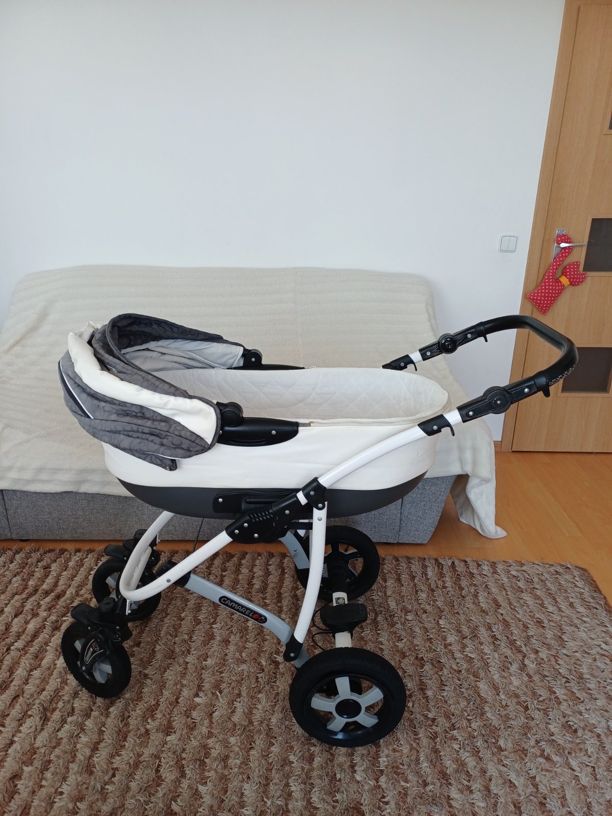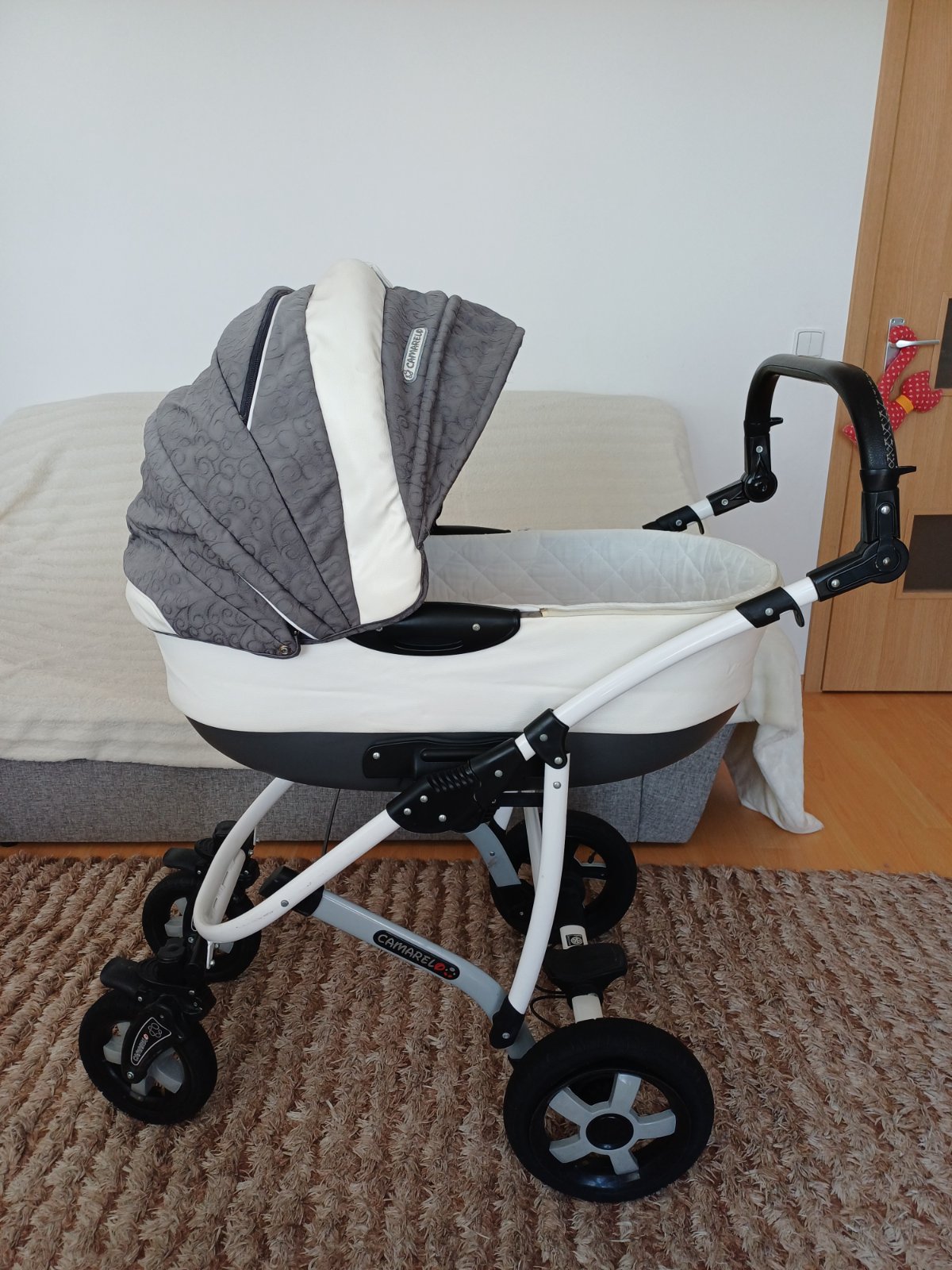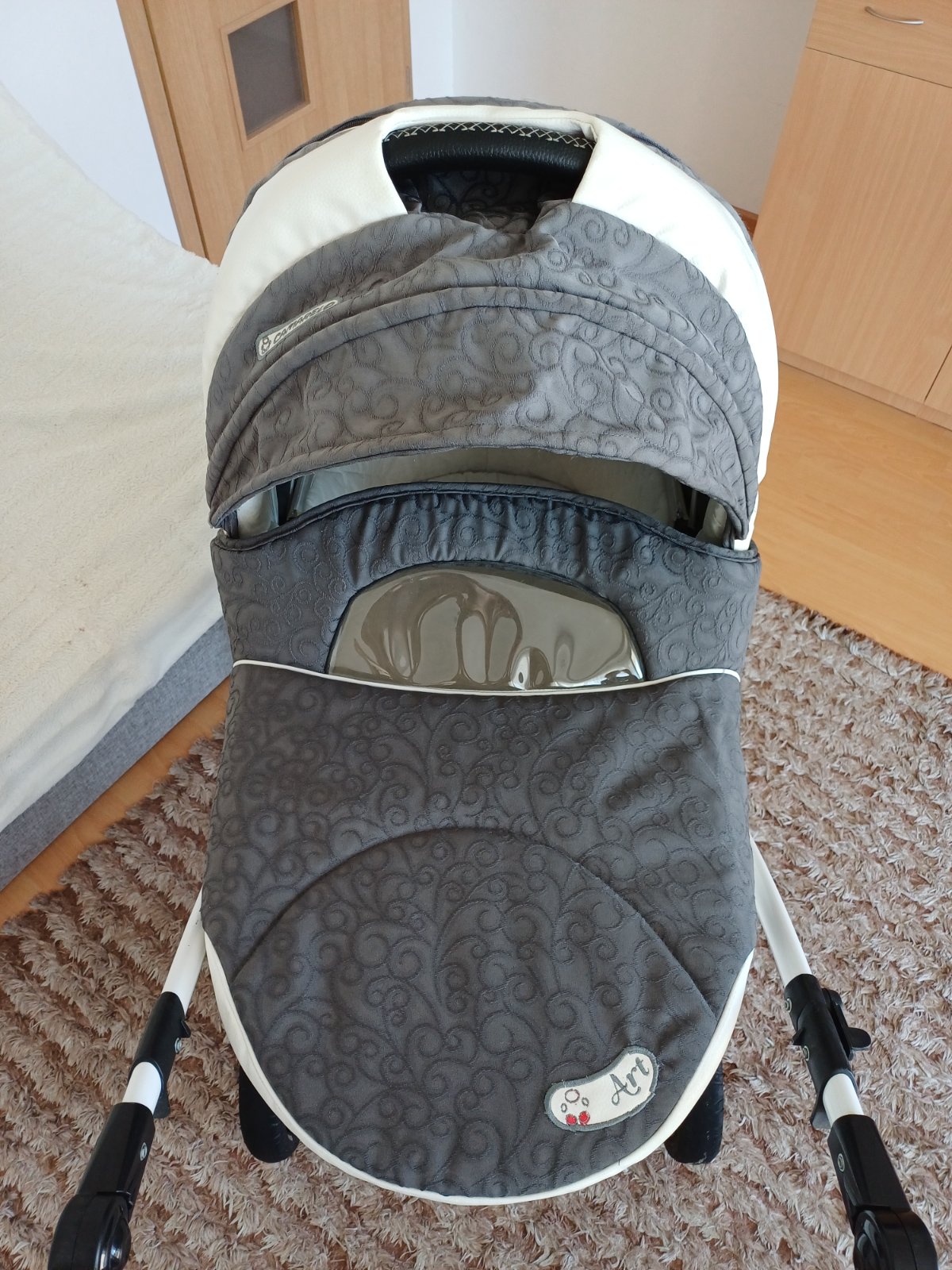 Predám detský kočík 2v1 kombinovaný Camarelo Art Limited. V dobrom stave, nezničený, funkčný, pneumatiky majú známky opotrebenia viď foto. Predné otočné kolesá, kolesá sú fúkateľné, brzda, nastaviteľné madlo. Príslušenstvo: taška na madlo, uložný priestor pod kočíkom, pláštenka a kryt na hlboký aj športový kočík.