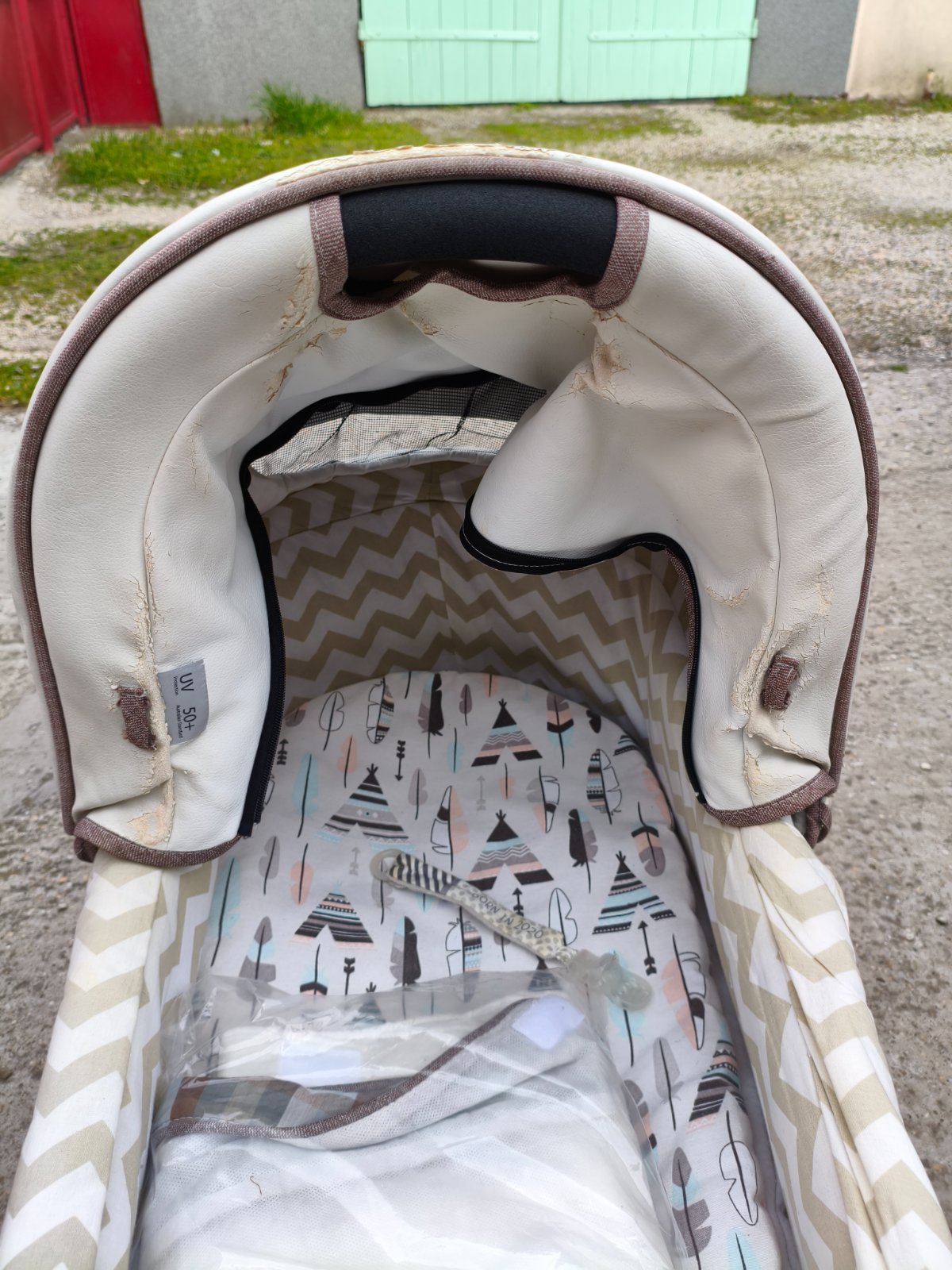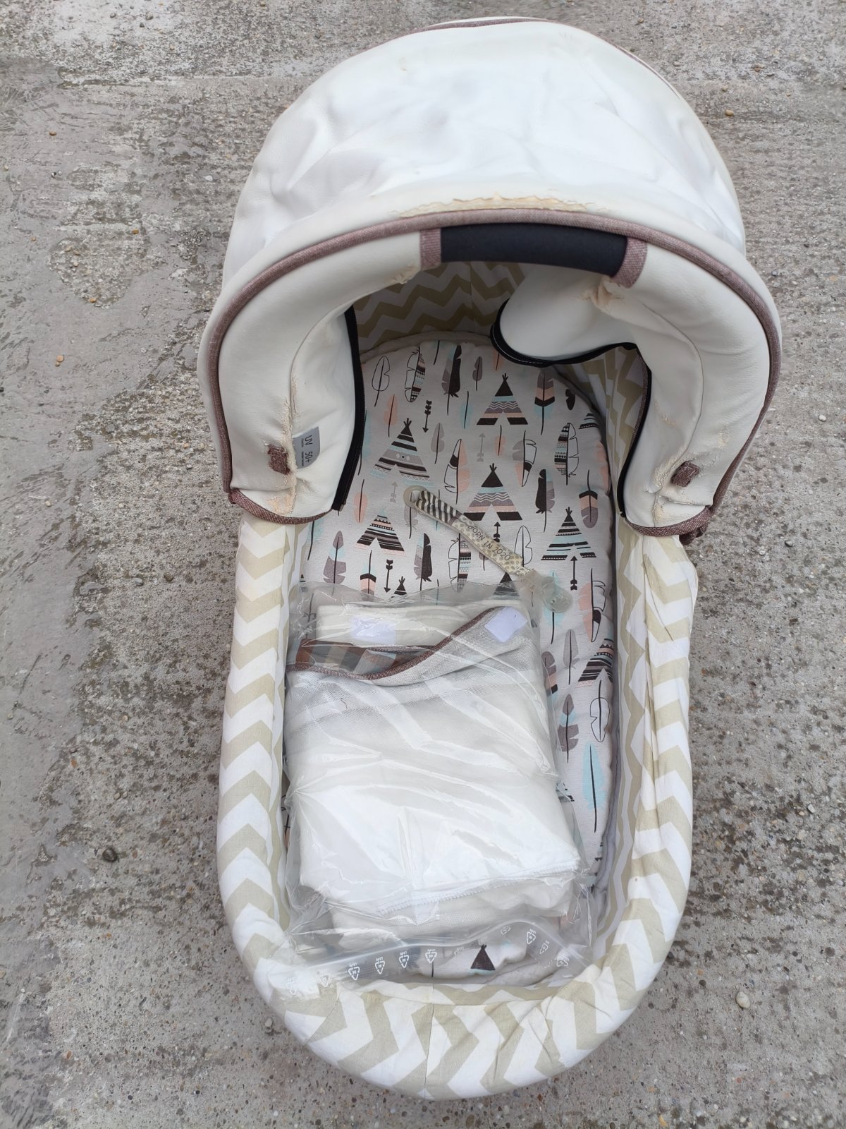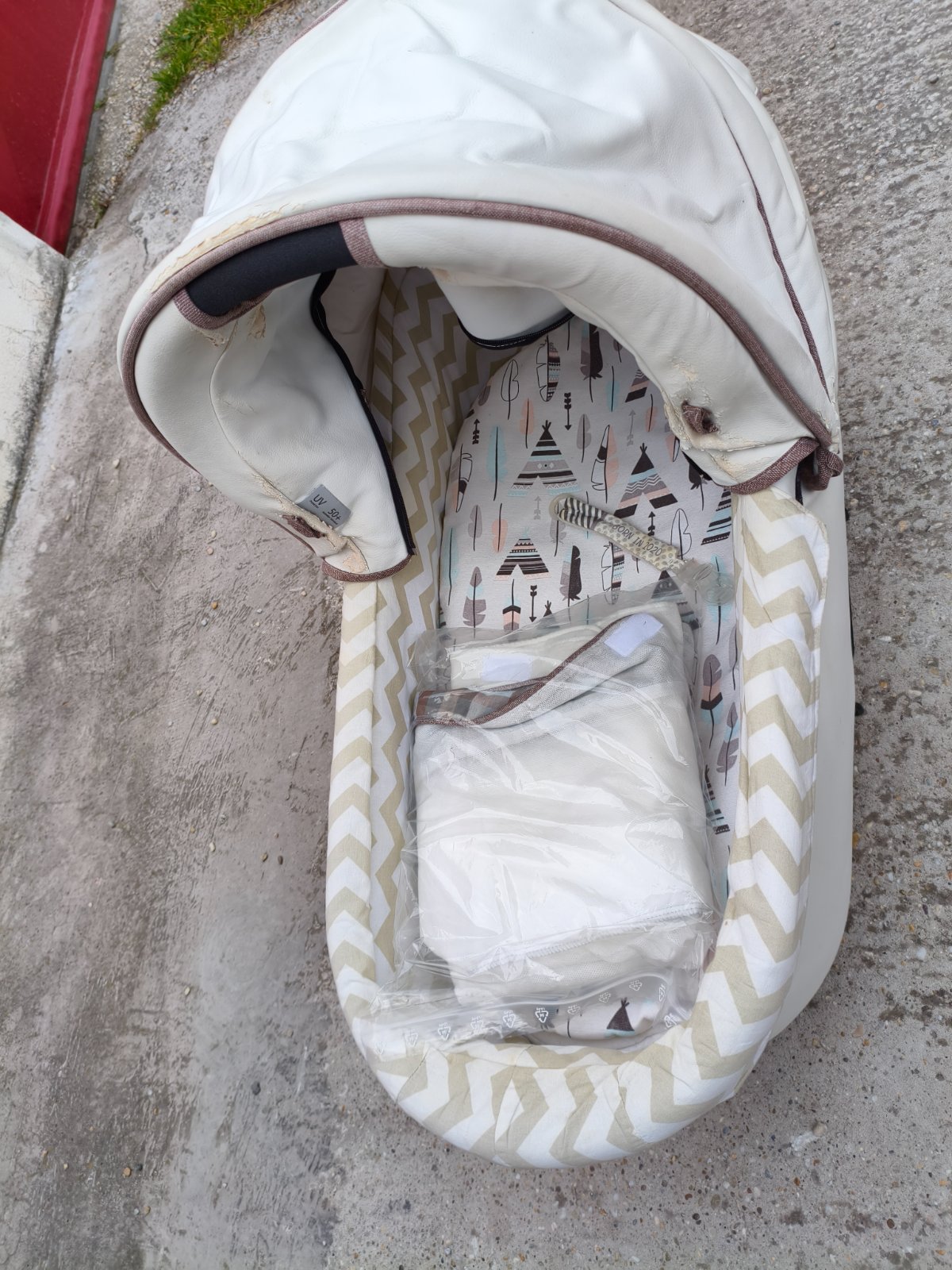 -2 vaničky , z toho na bielej je kozenkový poťah, ktorý je už popraskany. Druhý hnedý je látkovy, tam je stav dobrý. -Športová časť. Je hnedá, trochu vyblednuta od slnka ale ináč ok.
