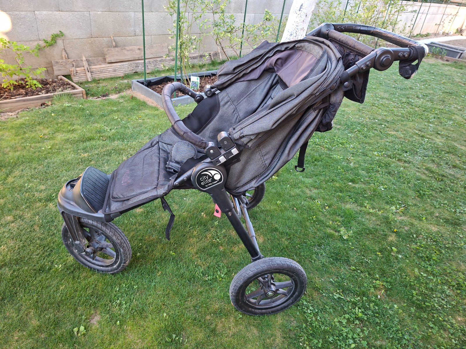Predávame náš obľúbený kočík BABY JOGGER City Elite (charcoal, 2018) spolu s pláštenkou a madlom.