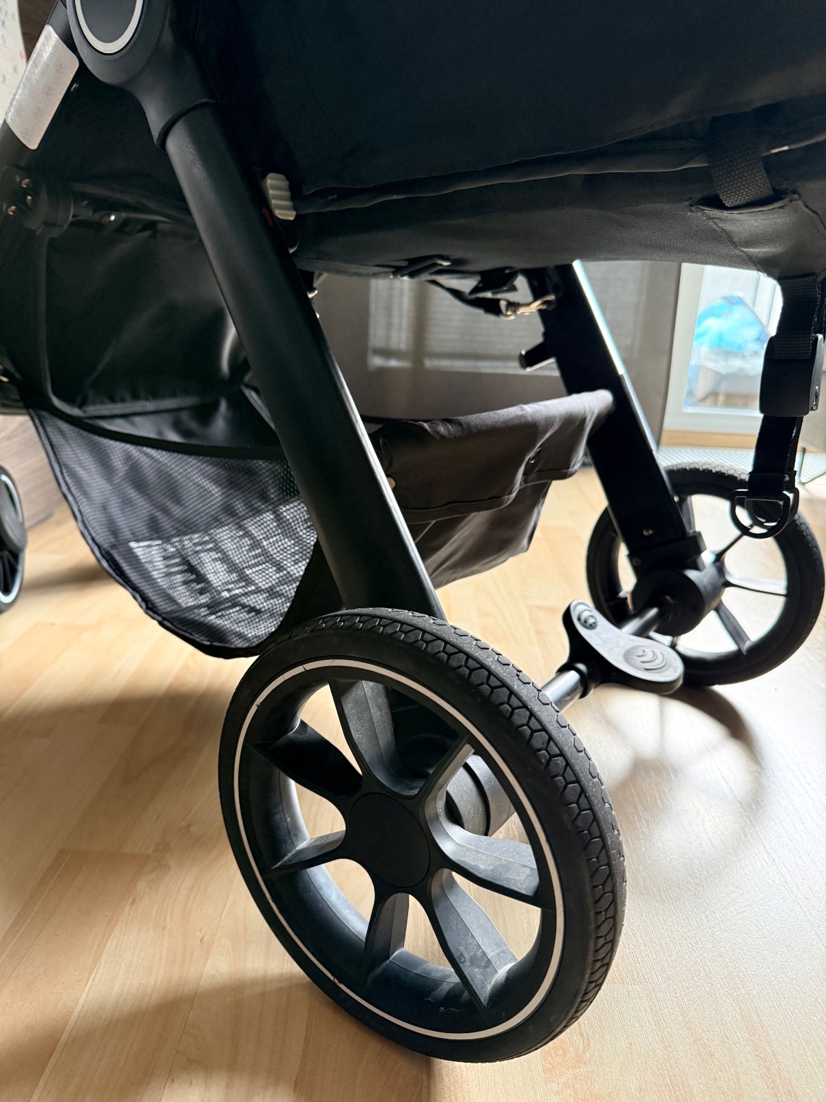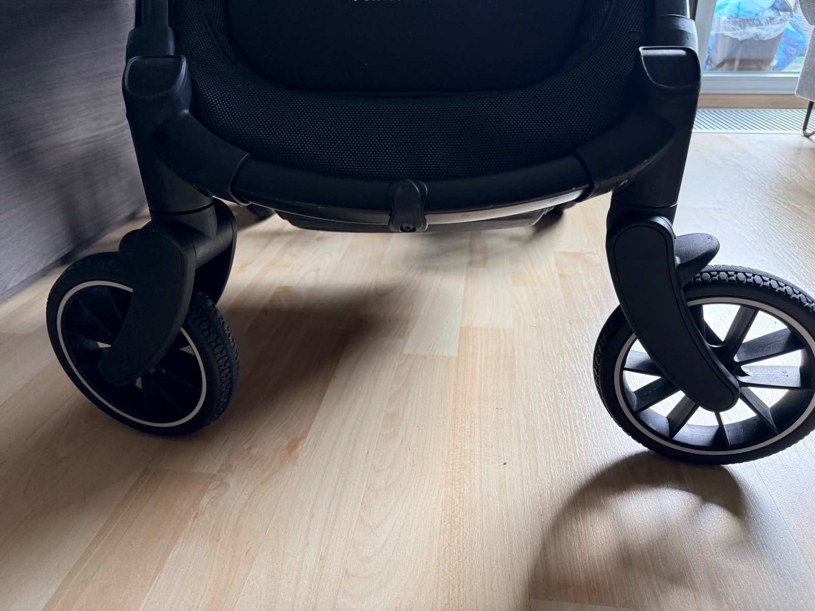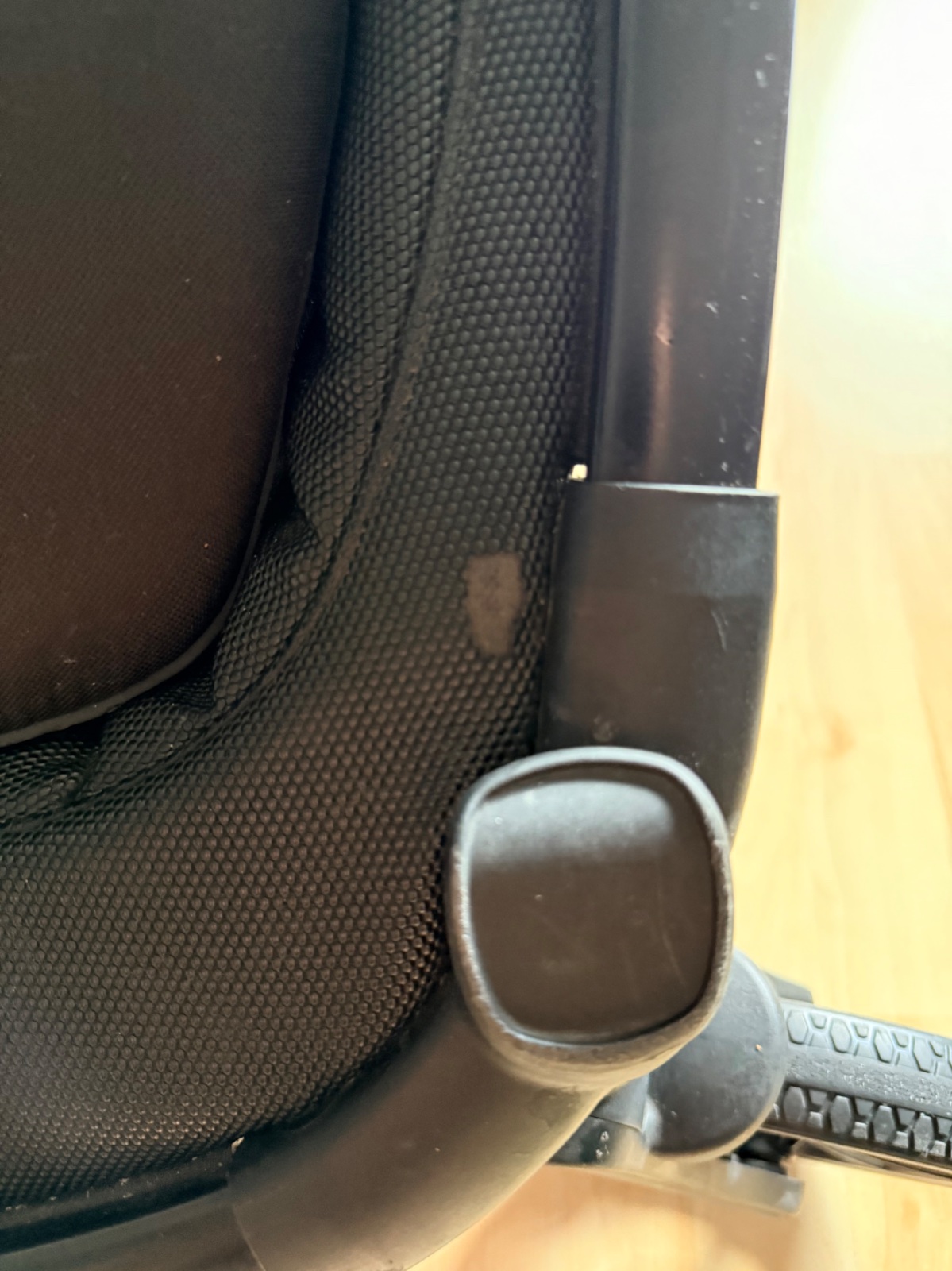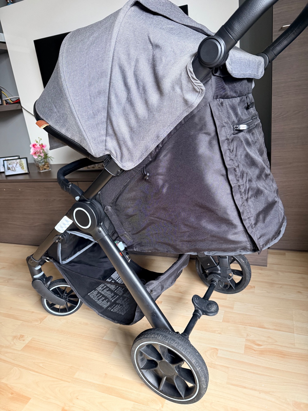 Bežné známky používania. Dole pri nohách ma trošku odlupnutú kožu, na streche malý škrabanec a strieška je od slnka vyblednutá (viďfotky). Neuberá to na funkčnosti kočíka.