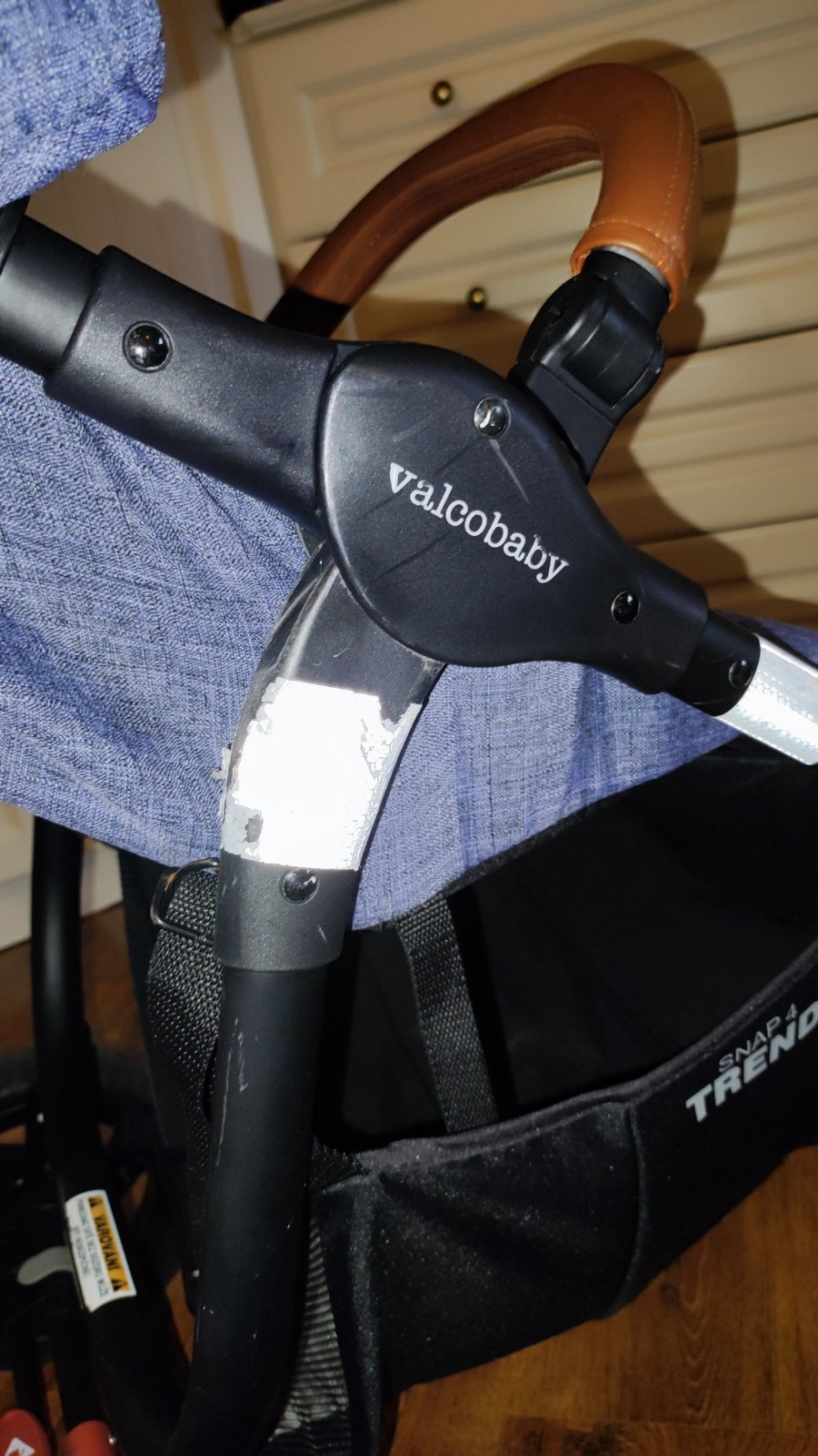 Krásny denimovy kočík, veľmi obľúbený, pohodlný a velký. Na konštrukcii škrabance, inak bezchybný. Sú na ňom nalepené odrazné nálepky, kočík je v noci vidieť z každej strany. Pevné gumové kolesá.