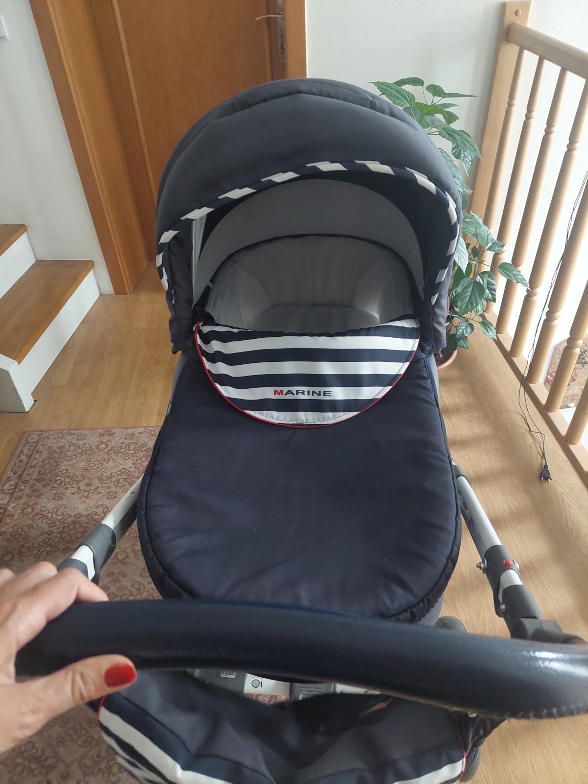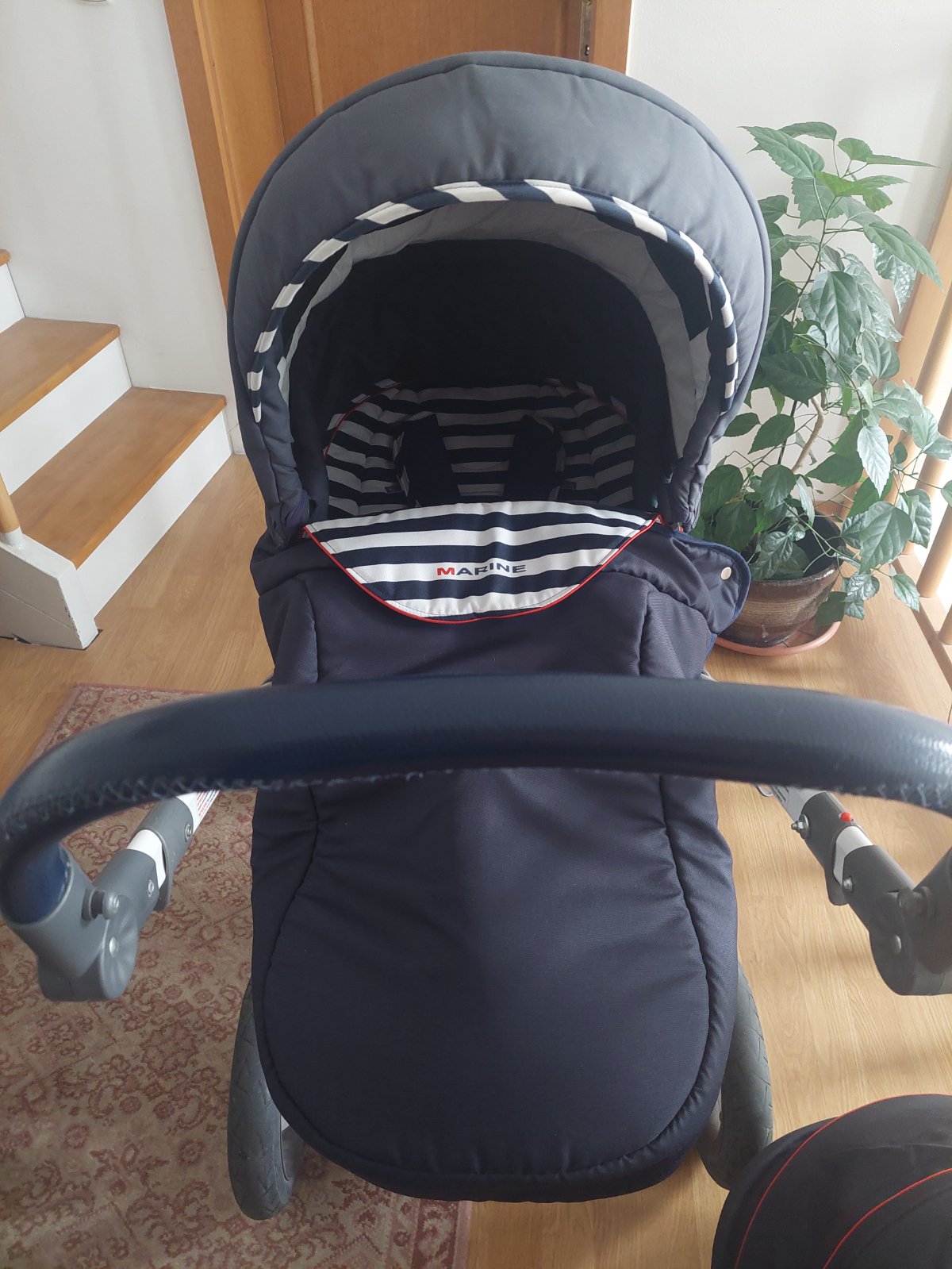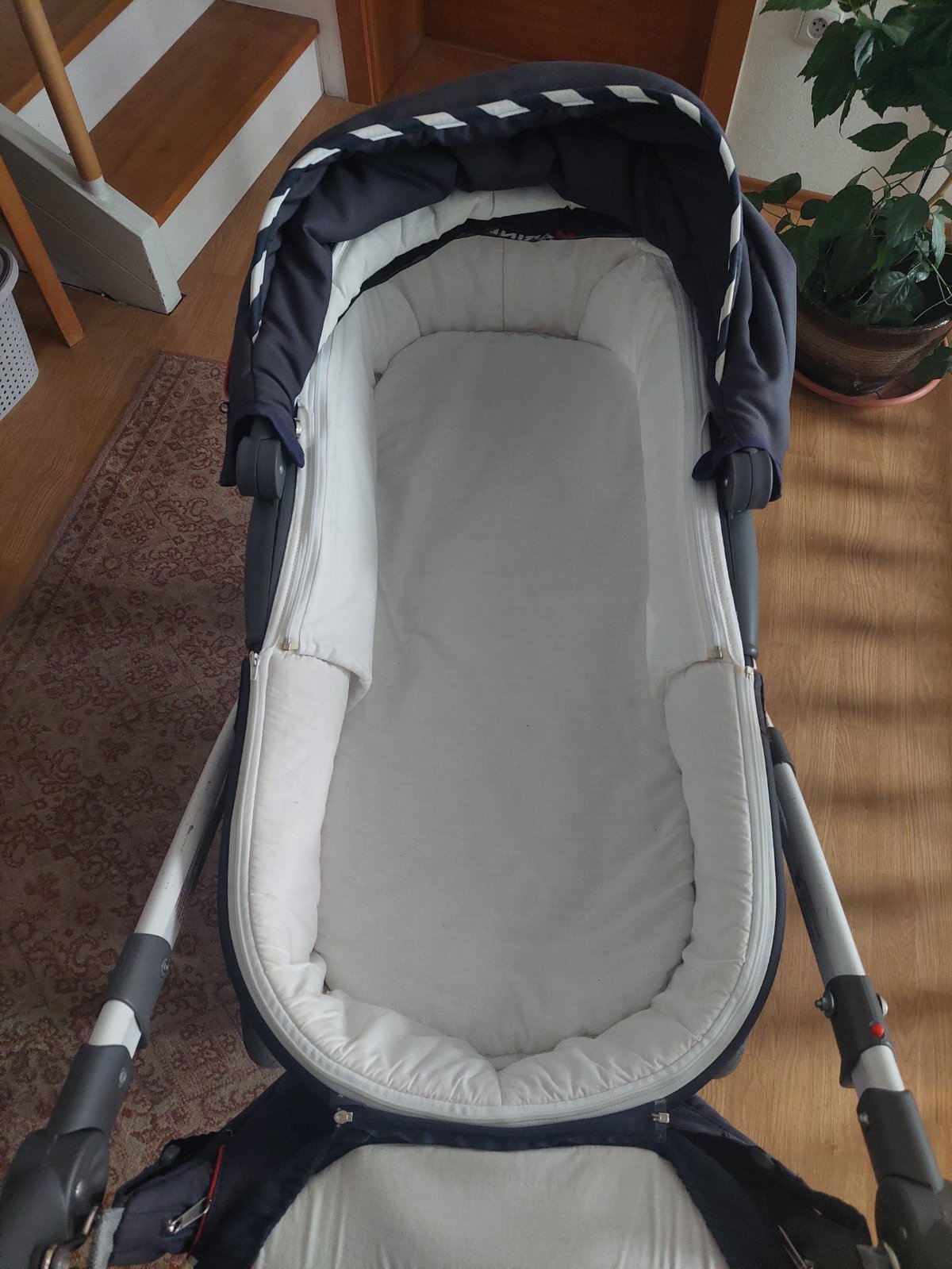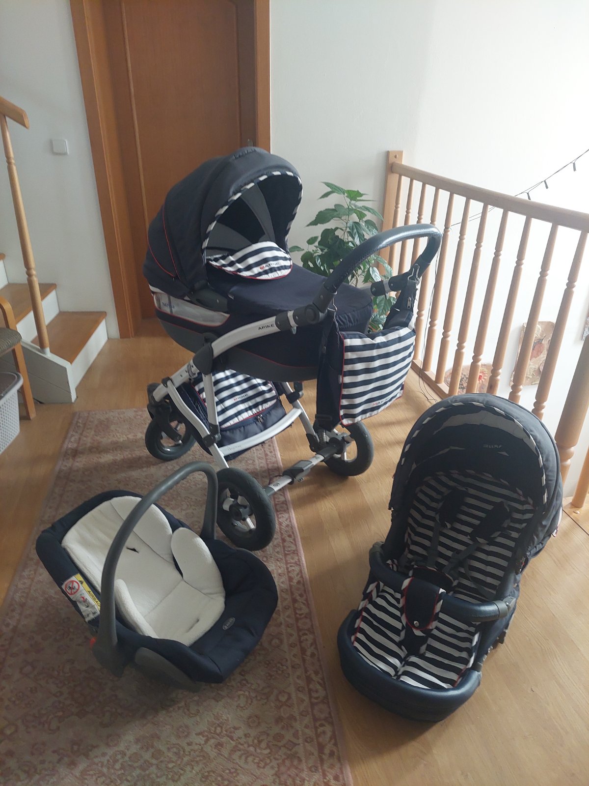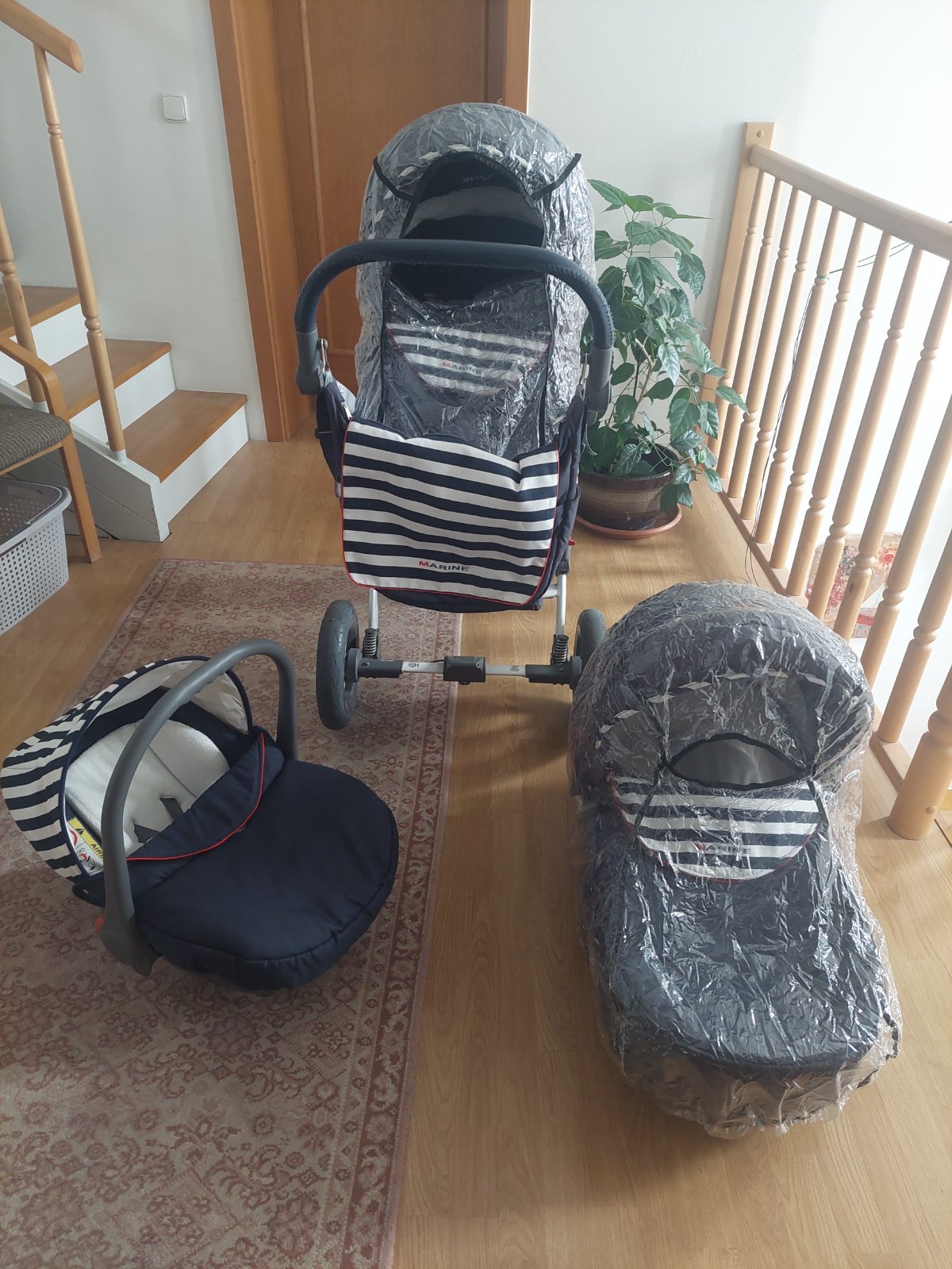 Predávame krásnu a bohatú trojkombináciu Tako City Move Marine po 2 deťoch. Kočík sa na nič nehrá, bol naozaj denne využívaný, sú vidieť stopy, ale nič vážne - nejaké škrabance na konštrukcii, poťahy sú bez fľakov, funkčne je v poriadku.