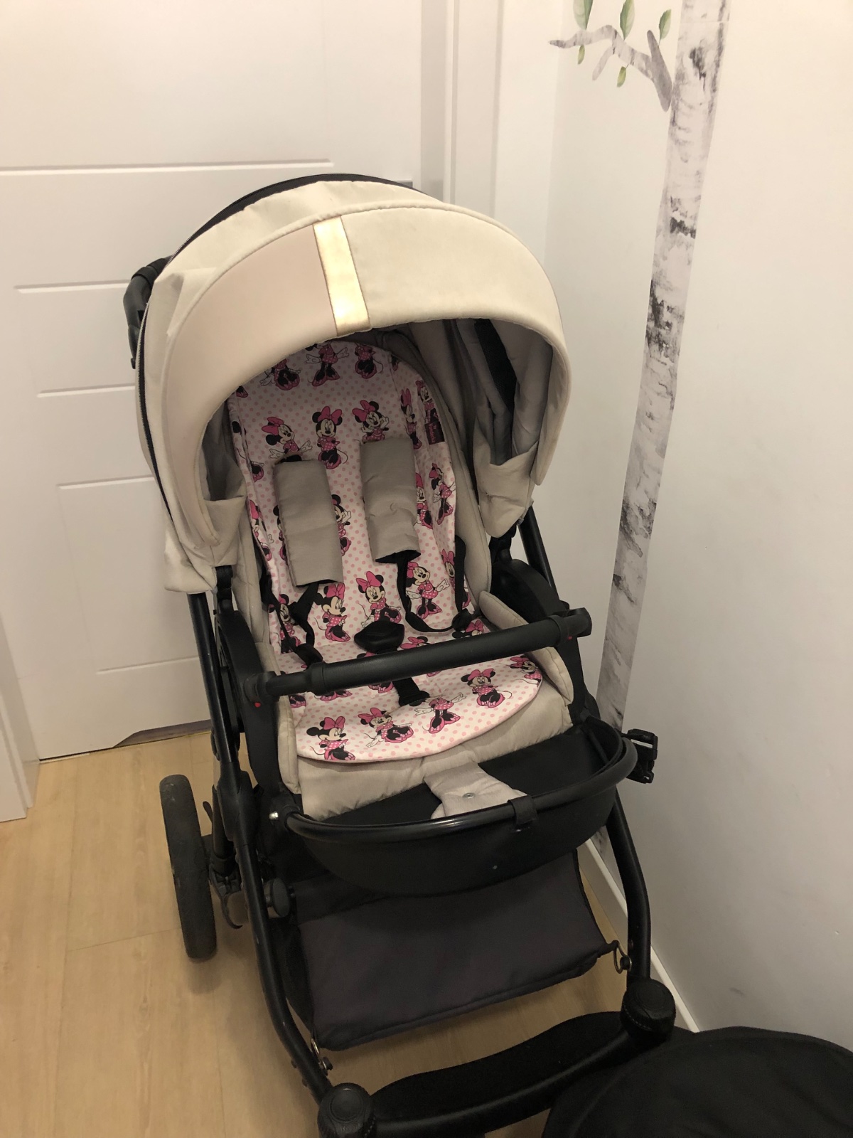 Skvelý kočík po 2 deťoch, jediná vada látky na športovej časti nafotená. Veľa príslušenstva v cene: sieťka proti hmyzu, fólia do dažďa, adaptér pre autosedačku, držiak na pohár, výplň do športovej časti minnie mouse.