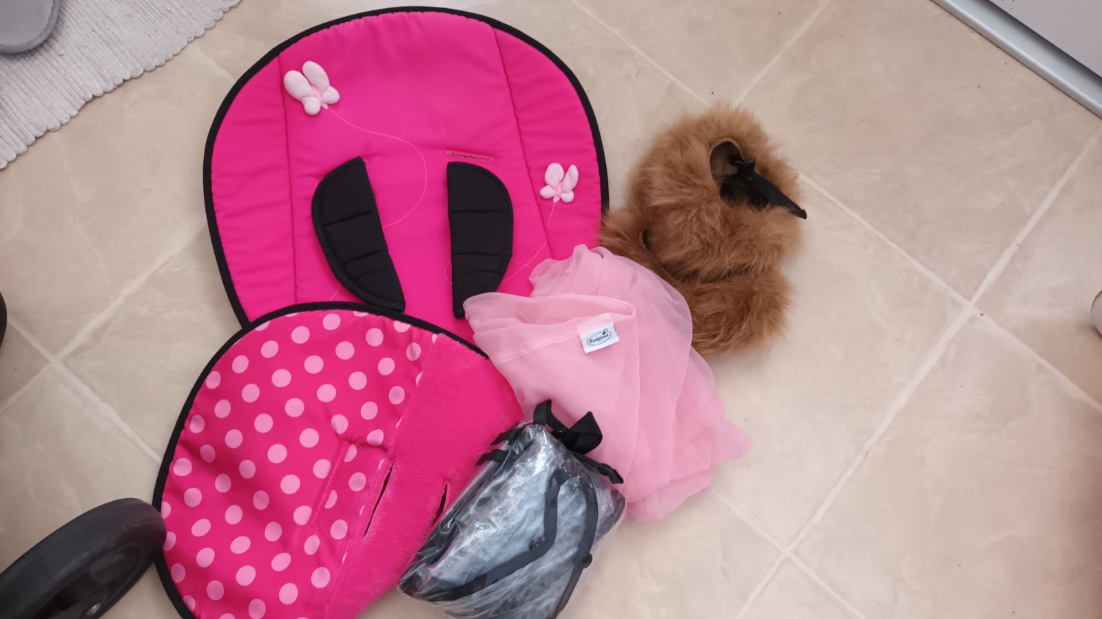 Prikladám obojstrannú podložku, prsiplášť, kožušinku na striešku a ružovú sieťku proti hmyzu