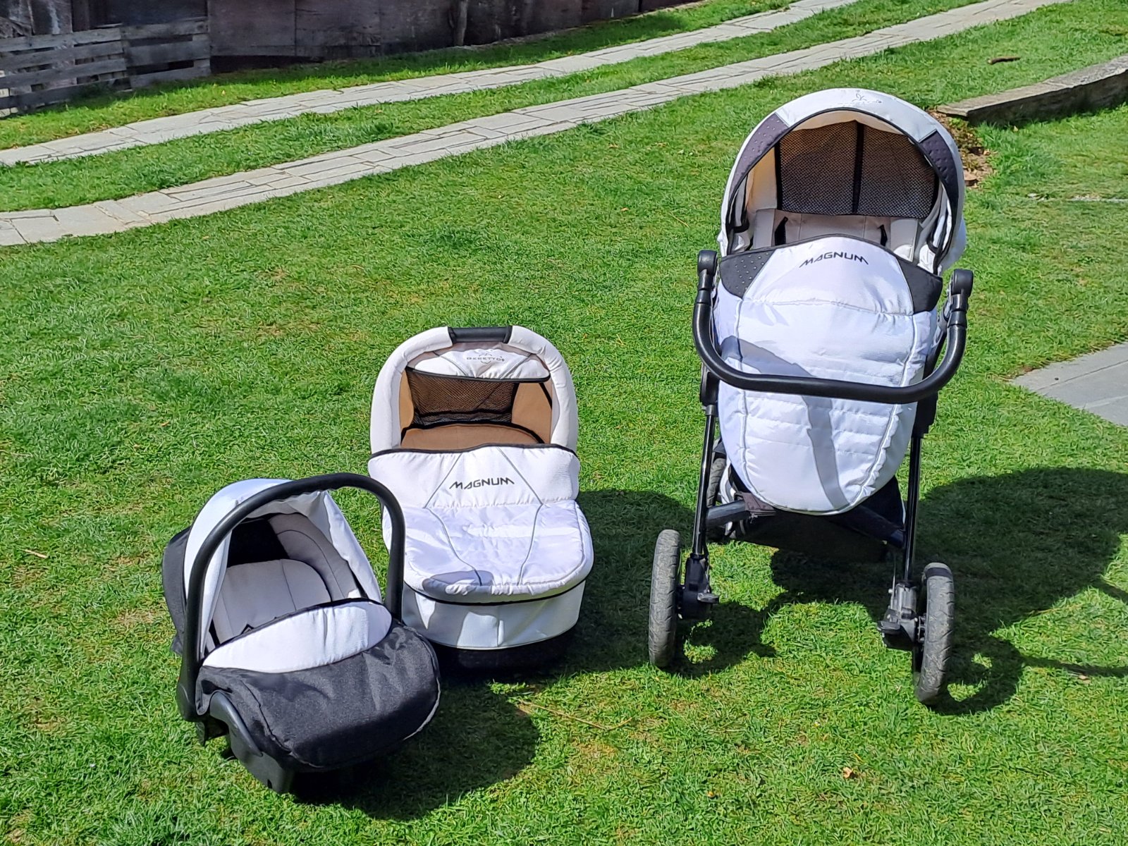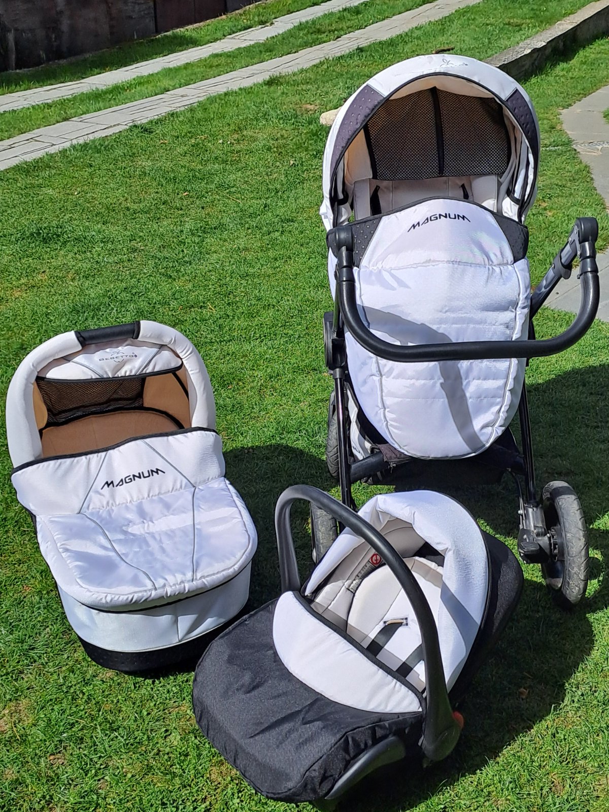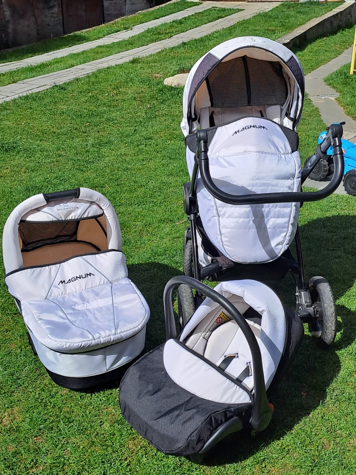 Predám trojkombináciu používaného ale zachovaného kočíka zn. Magnum. Obsahuje vajíčko,vaničku a športovú časť, súčasťou je aj taška a podsedák do auta grátis. Len osobný odber, okres Krupina.