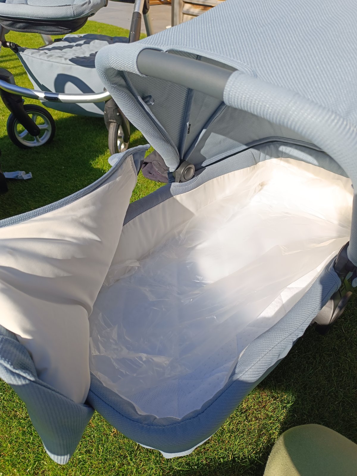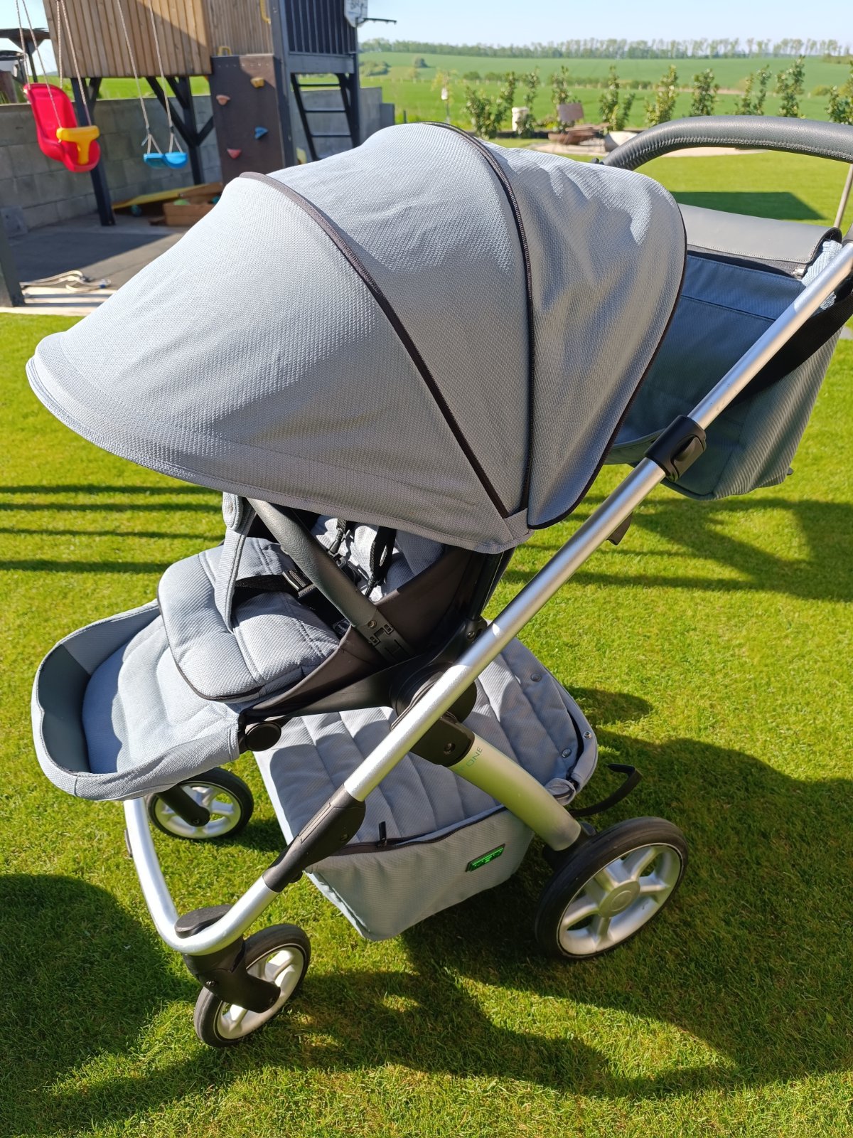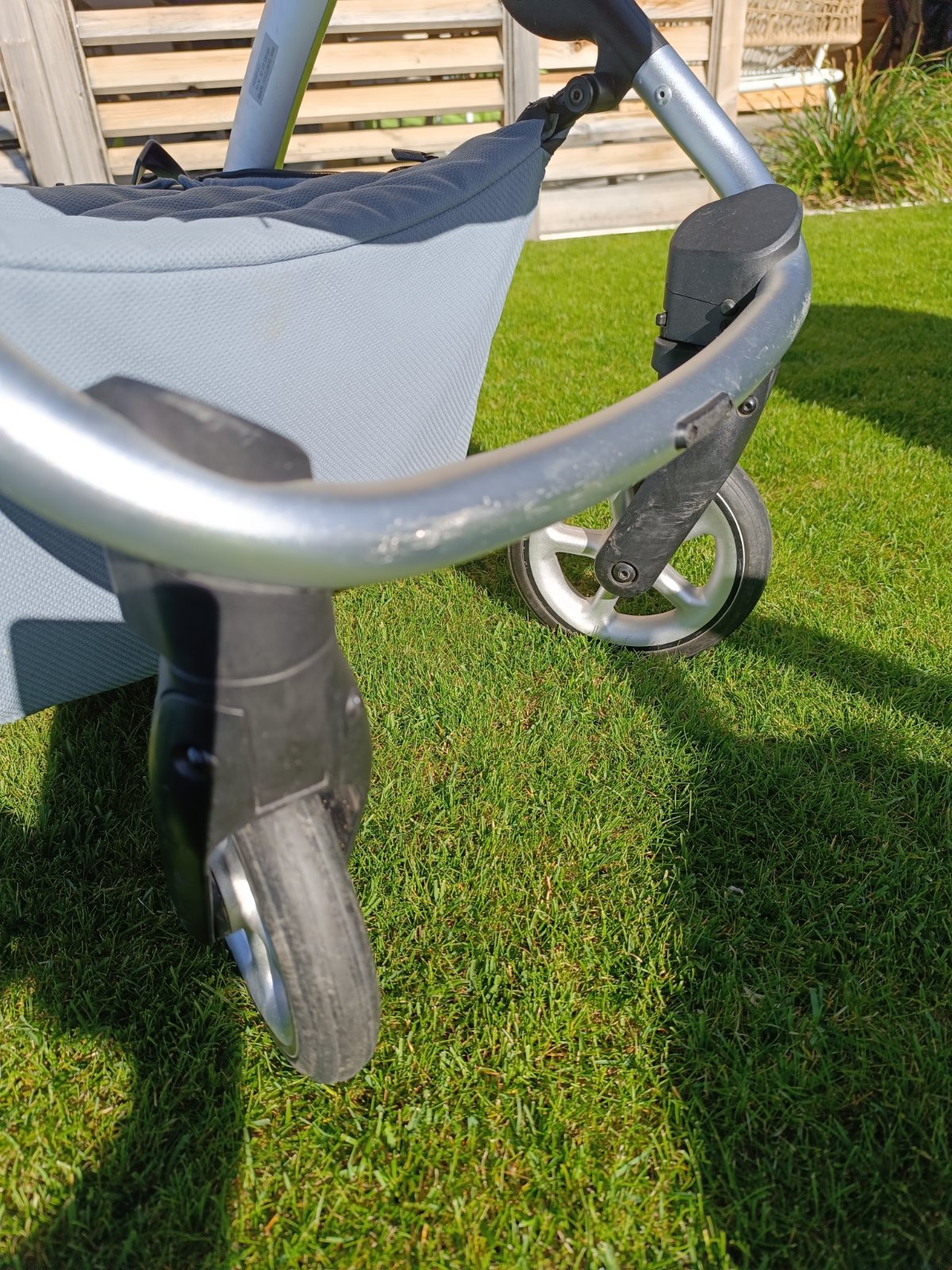 Vlastnosti:Výškovo nastaviteľná rukoväť 90 - 107 cm. Strieška s UPF 50+ ochranou. Predné otočné kolesá s možnosťou aretácie - zmes gumy s penou. Odnímateľná taška (nepoužitá), prebaľovacia podložka, pláštenka, rukávnik na zimu. Krásny stav bez fľakov, pár škrabancov ktorým sa nedá veľmi vyhnúť a mierne odlupujúca sa koženka na športovej časti (viď foto). Veľmi ľahké riadenie, zatáčanie.