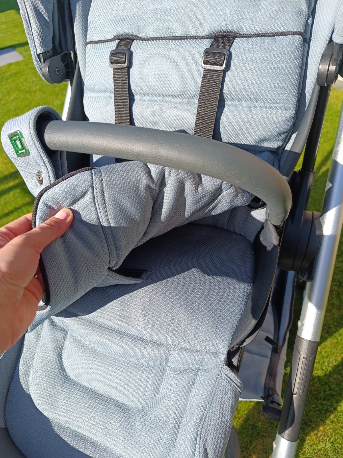 • Športový sedák s vyberateľnou podložkou a rozopínateľnou strieškou, výškovo nastaviteľná strieška (dve polohy). Polohovateľná opierka chrbta a nôh až do úplného ľahu. Odnímateľné madlo pred dieťa s koženkovým poťahom. Nastaviteľný po aj proti smeru jazdy av oboch smeroch sa dá zložiť.