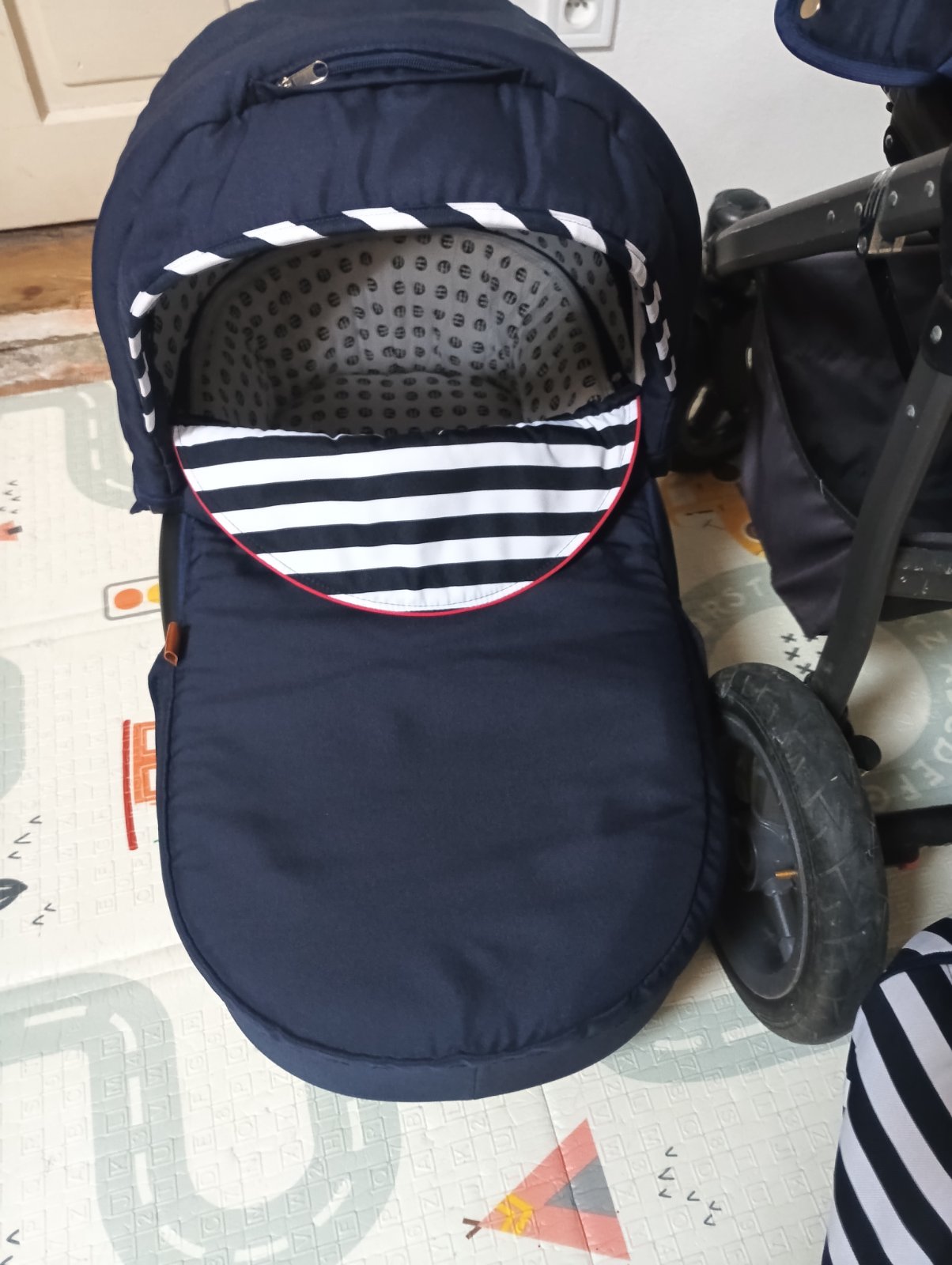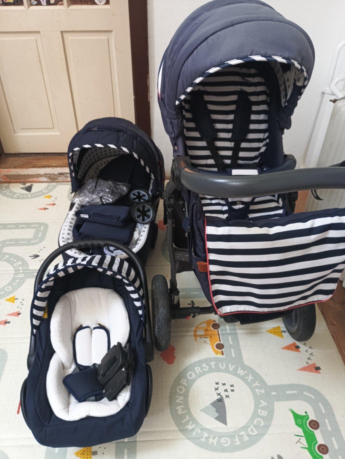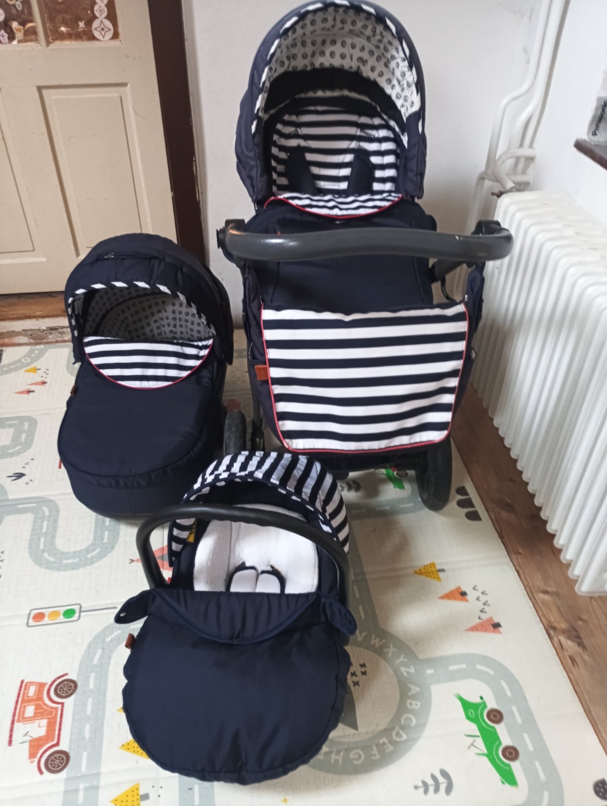 Posúvam 3kombinaciu kočíka Petite&Mars Go Navy Stripes, má už čo to odkocikovane ale určite ešte službu urobí, všetky poťahy sú komplet vyprane, na každú časť je nánožník, sieťka proti hmyzu, 2 slnečné clony, rukávnik na madlo aby Vám v zimnom období neodmrzli ruky, pohárik na napoj na konštrukciu, dofukane kolesá. Vady: škrabance na konštrukcii od nakladania do auta, vyblednuta strieška na športovej časti od slnka, vyblednuta prebaľovacia taška. Inak žiadne funkčné nedostatky.