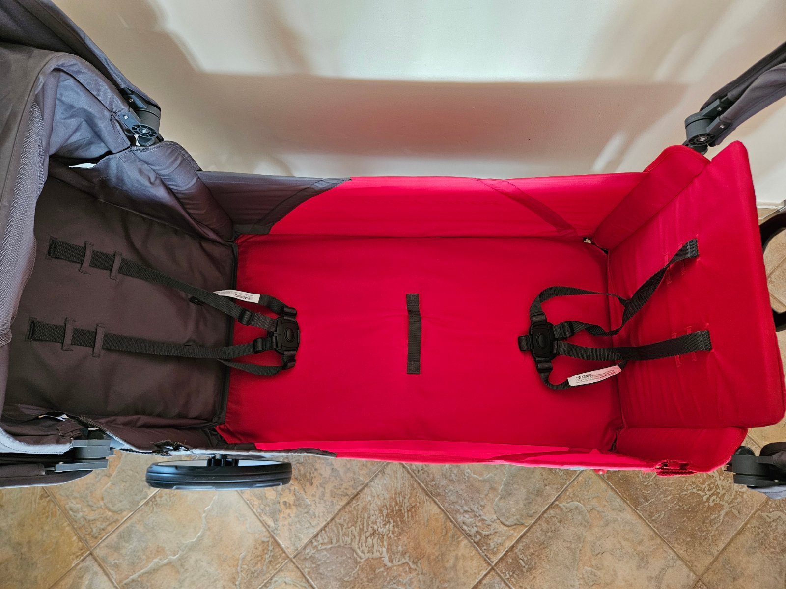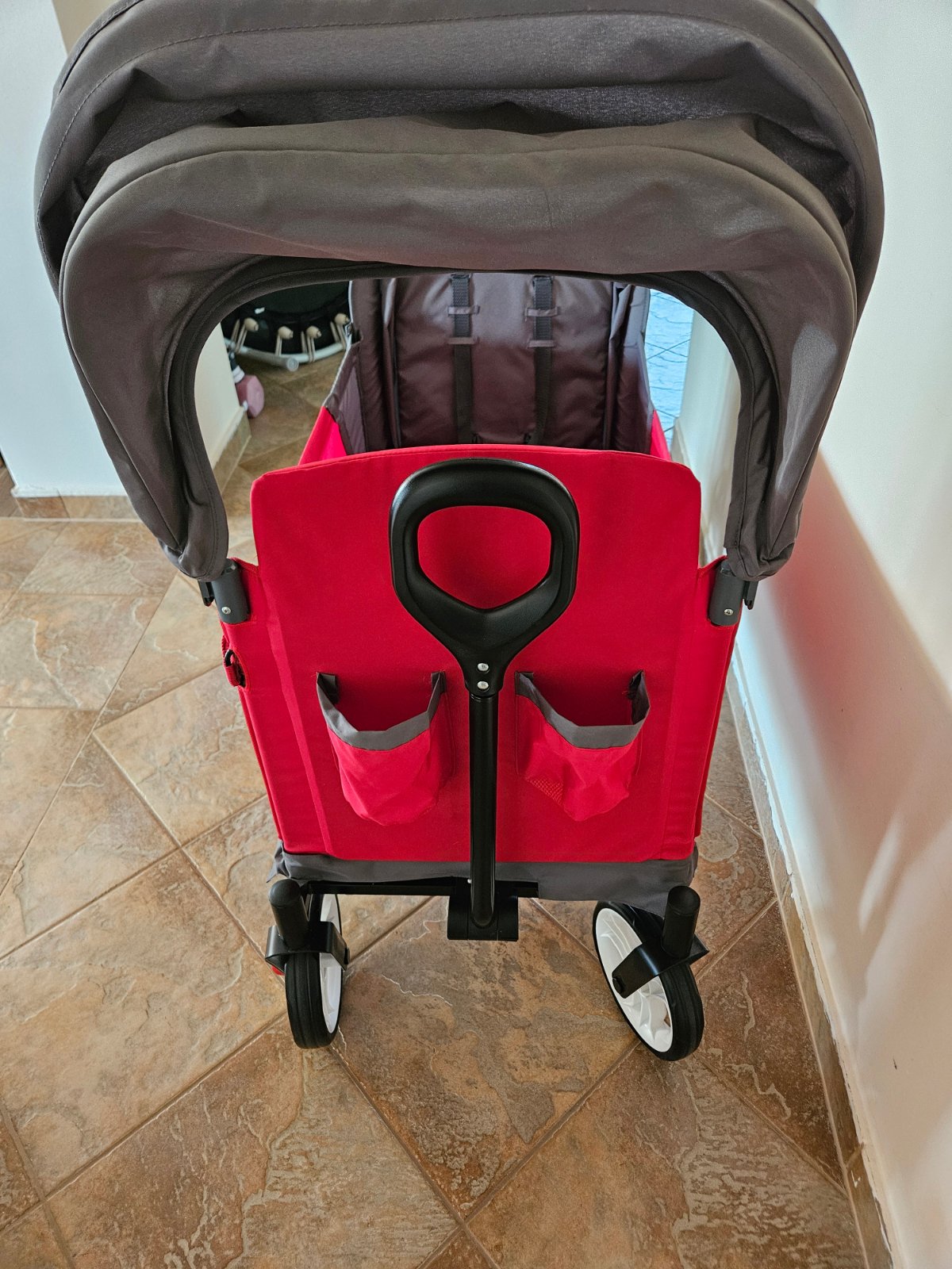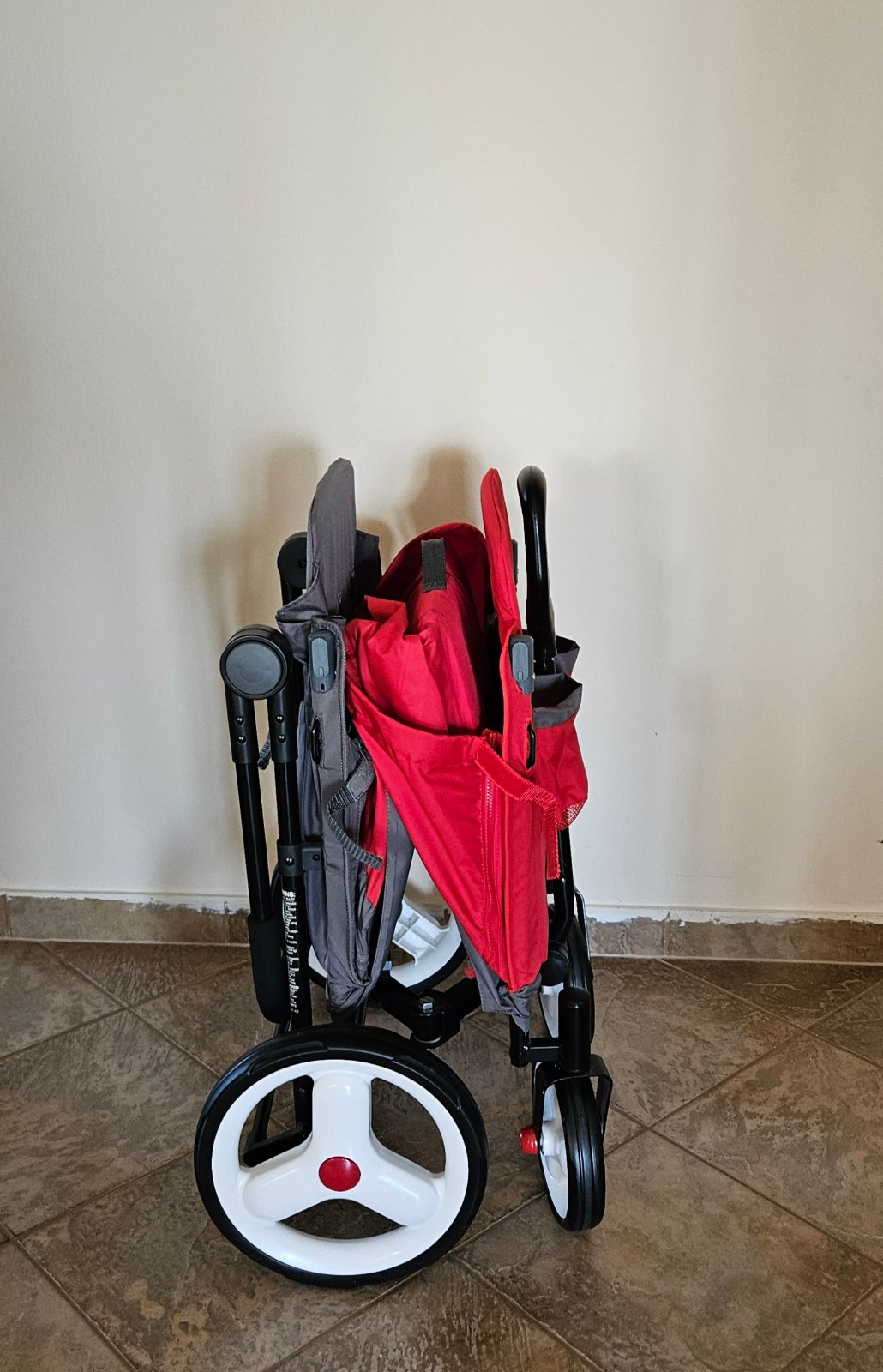 Nový vagónik kúpený z USA, nestihli sme ho využiť. Ľahko sa skladá, da sa z neho spraviť lavička, na jednej strane je chrbtová opierka polohovatelná.