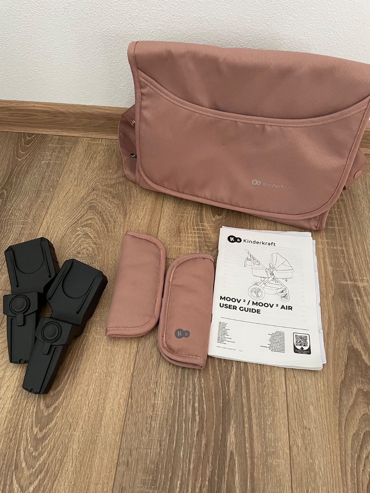 Ku kočíku je taška, držiak na nápoj a fólia proti dažďu.