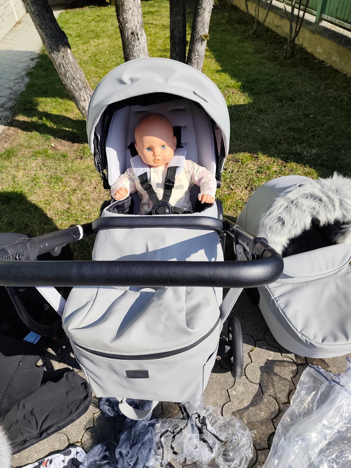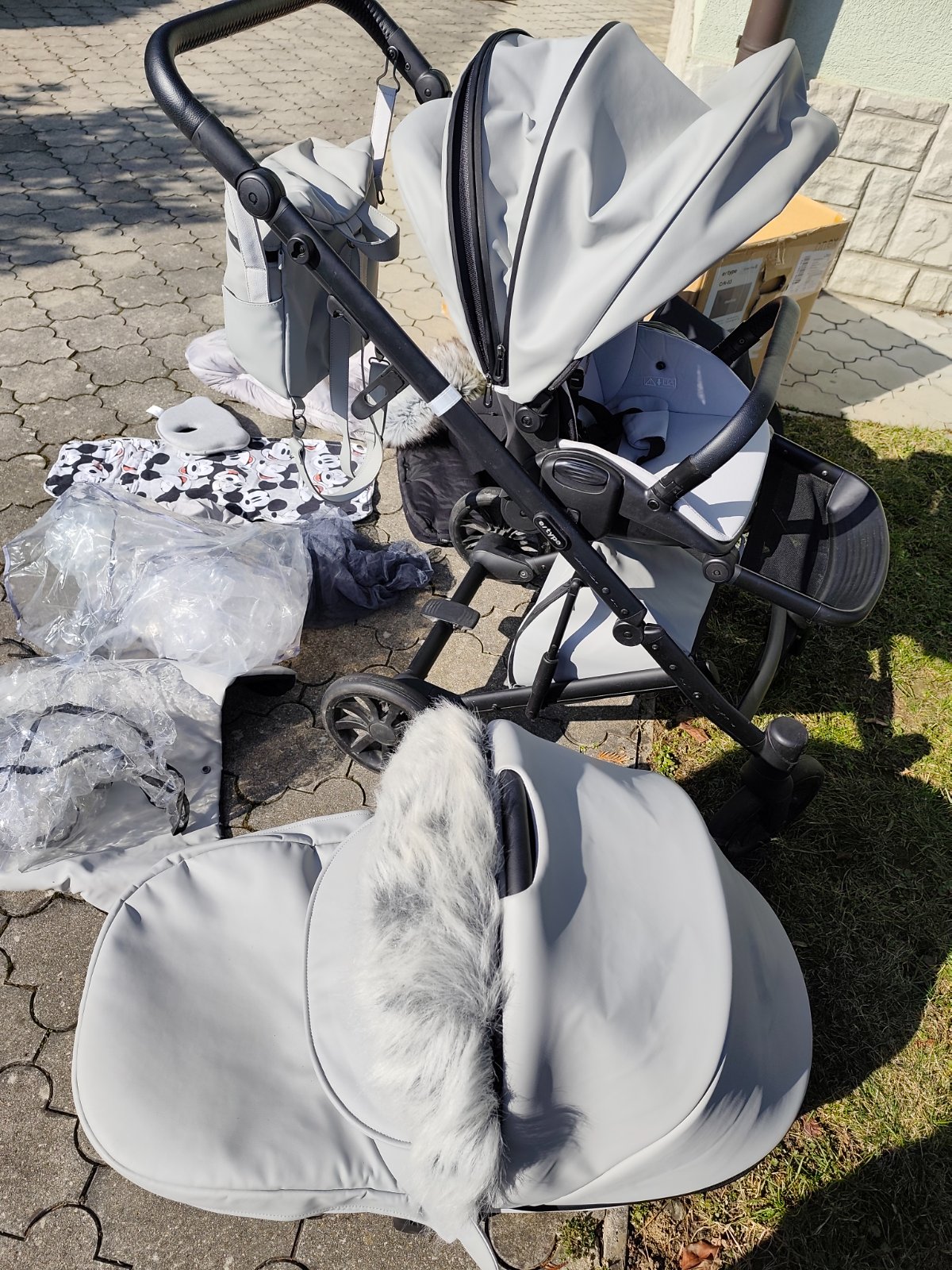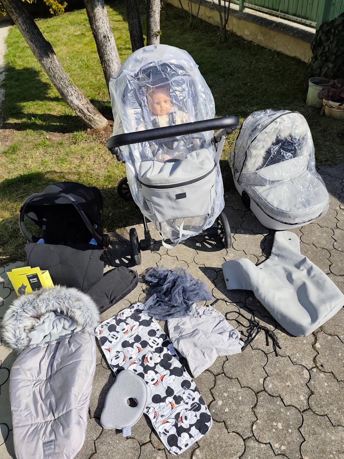 Ku kocaru pridavam na mieru situ vlozku ( 1 strana sivy zamat/2.strana Mickey mouse), rukavnik na zimu, svetlosivu kozusinku, svetlosivy fusak, prirucnu tasku (ruksak), plastenku na hlboju cast, plastenku na sportovu cast, vankusik proti prelezaniu hlavicky, sedu plachtu do hlbokej casti kocara, moskytieru,adaptery na vajicko,aby mohlo byt pripevnene ku kocaru, slnecnu clonu, nanoznik z eko koze (nepremokavy).