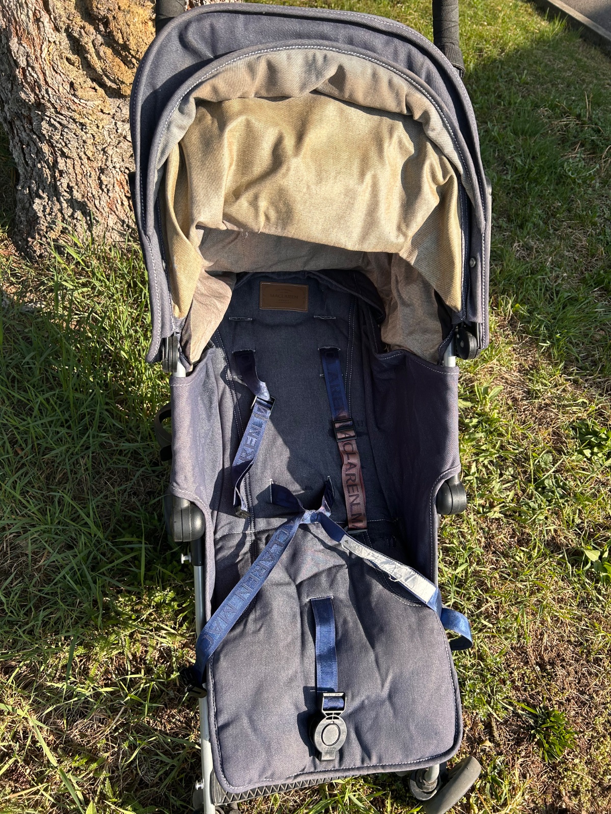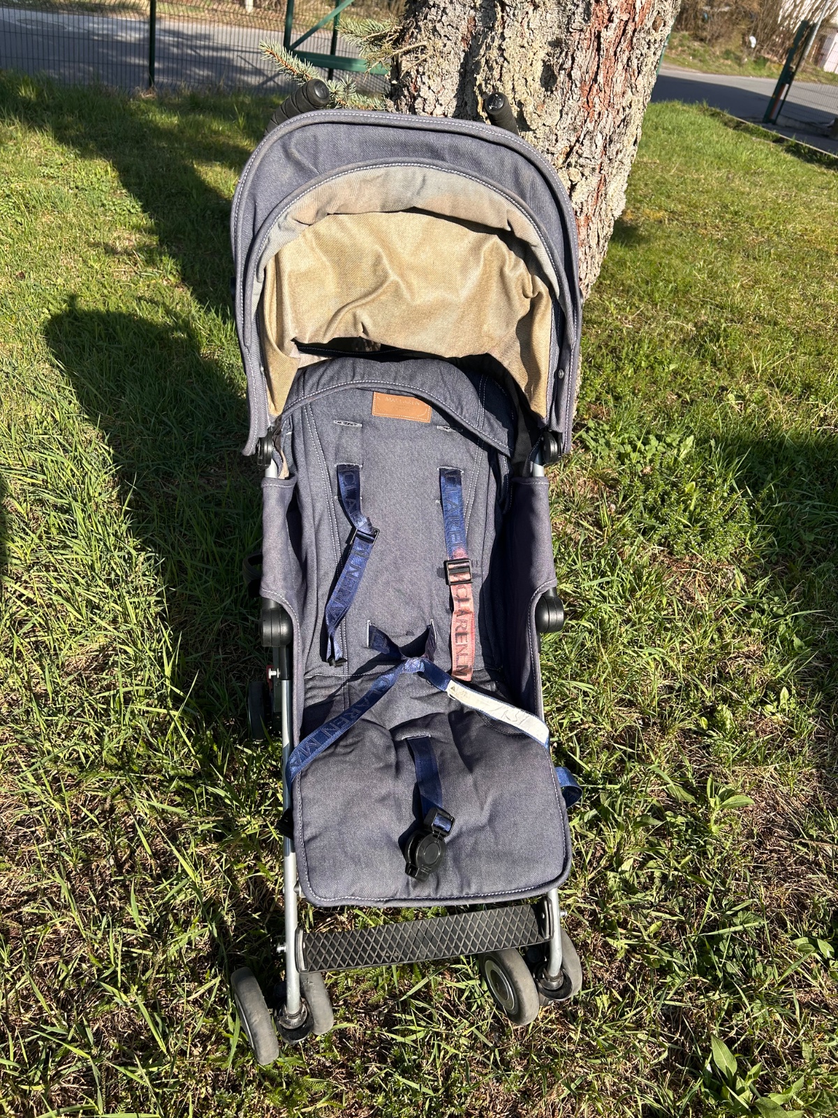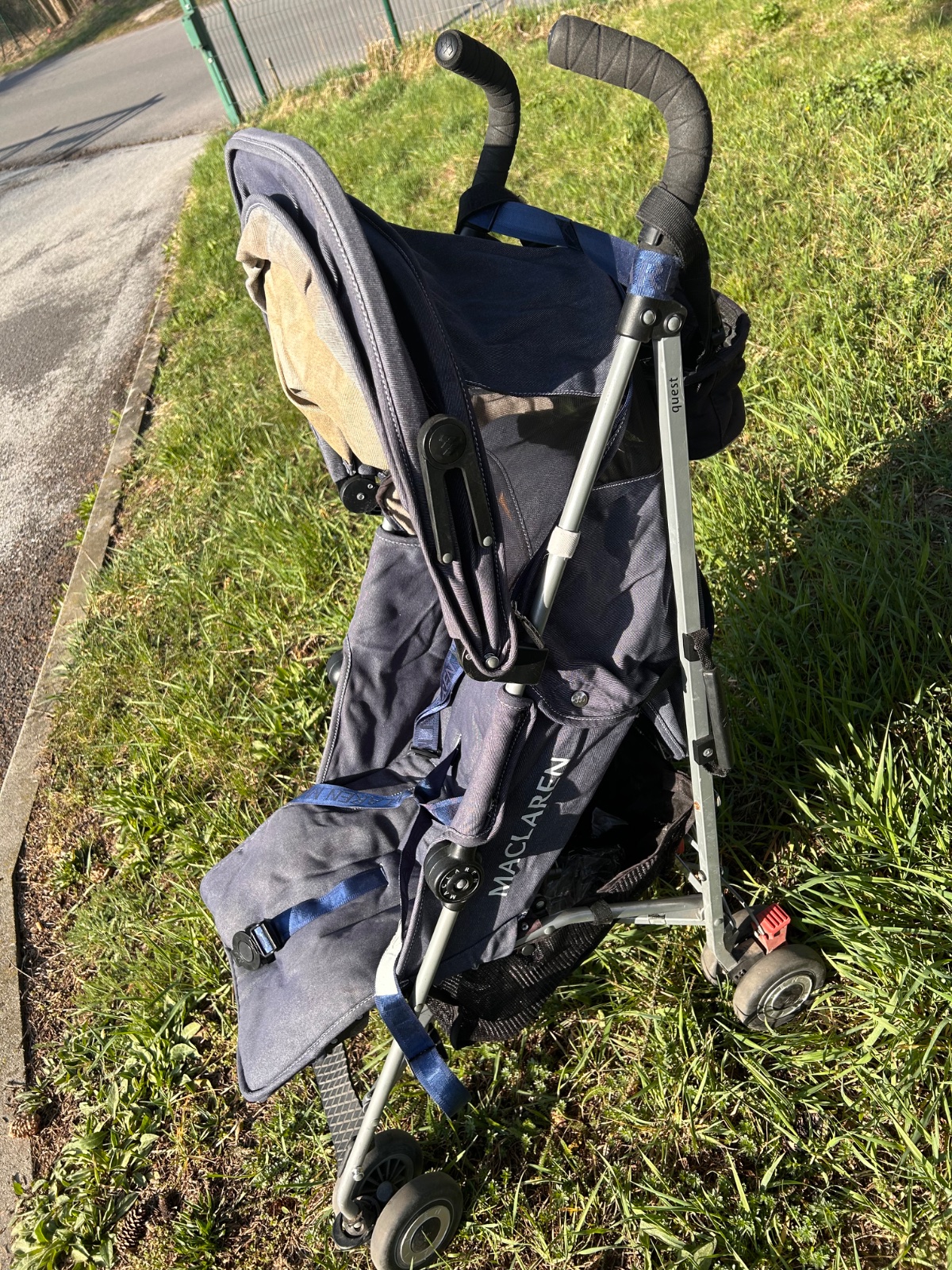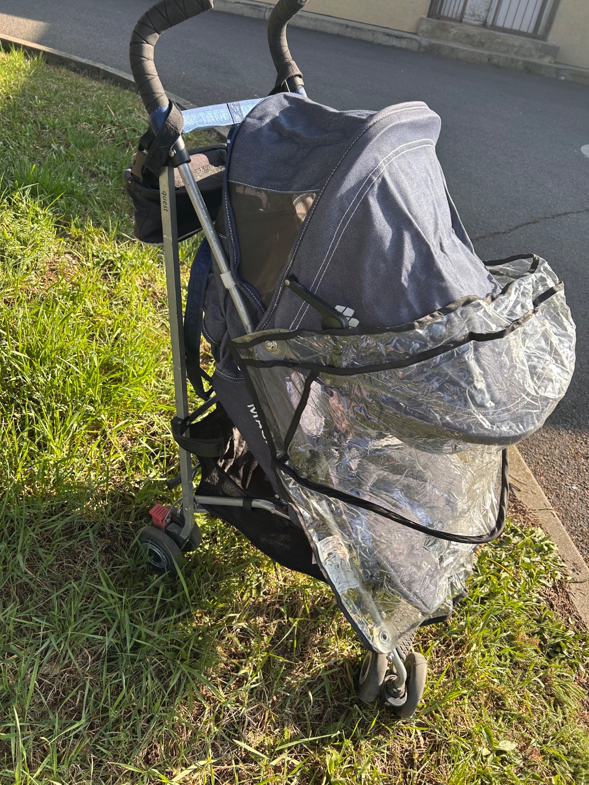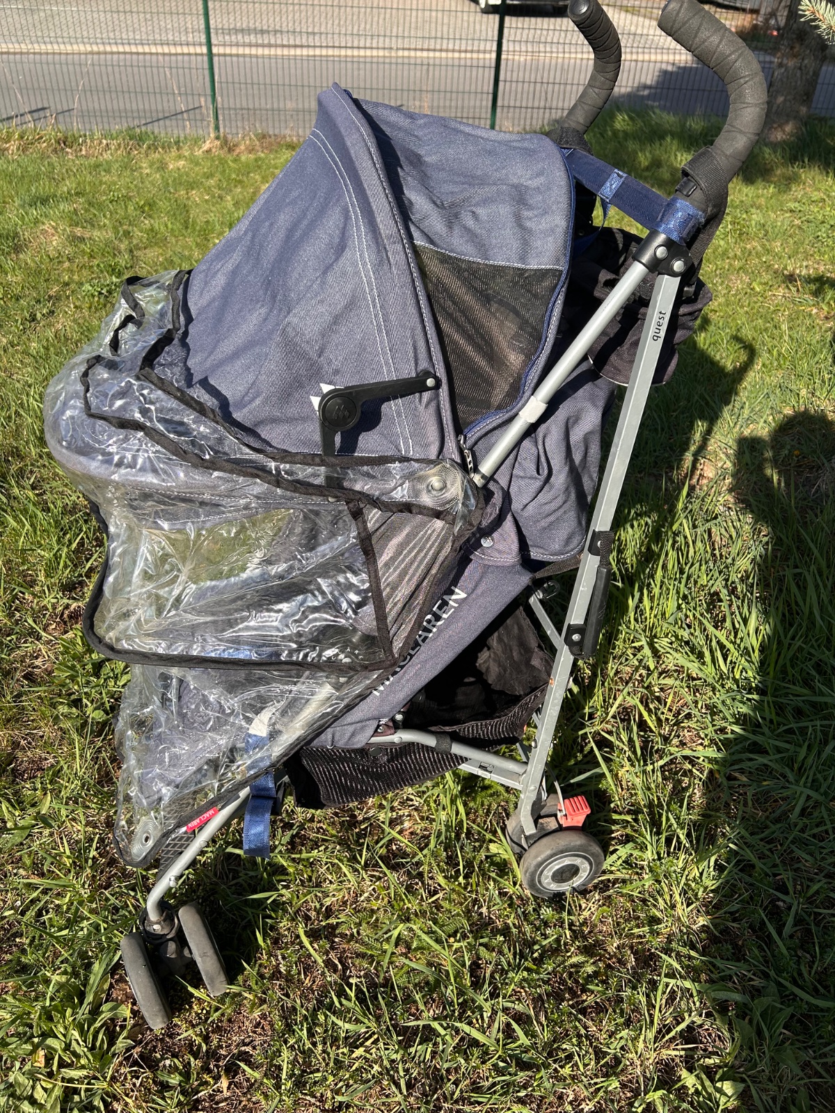 MacLaren Quest v denim/modrej farbe , ľahký golfový/skladací typ s veľkou strieškou, polohovateľným sedadlom (do ľahu), hliníkovým rámom a klasickým dizajnom značky MacLaren. Ide o obľúbený kompaktnejší model vhodný od cca 6 mesiacov, ľahko skladateľný jednou rukou, s dobrou strieškou a nosnosťou do cca 25 kg. Kočík má hmotnosť 5,9 kg preto sme ho kupovali na dovolenku. Má pár chýb, ktoré nebránia funkčnosti a dokoca ich viac menej nevidno okrem sfarbeného pasu. Kočík má vo výbave aj originál pláštenku proti daždu.