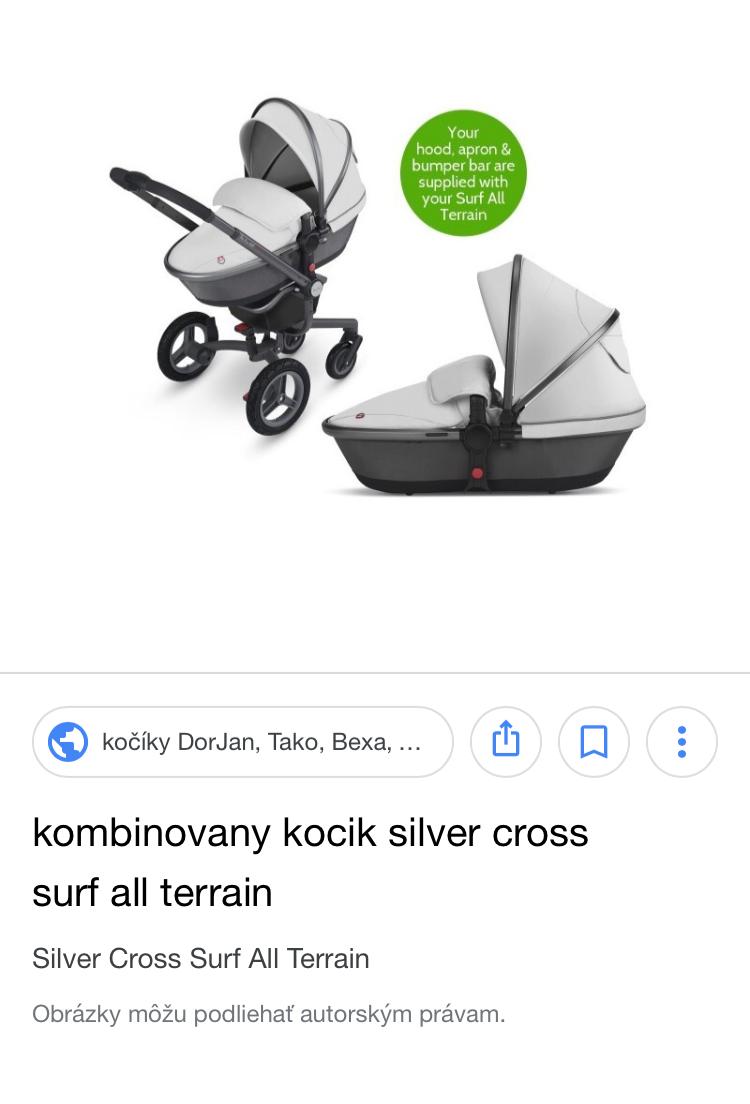 Predam stylovy kocik znacky Silver Cross surf ,dvojkombinacia,hlboka cast pouzivana 6 mesiacov (niektore prislusenstvo este nevybalene),sportova cast pouzivana jednu sezonu (zima),kocik je v super stave,ma nejake skrabanceky,comu sa vyhnut pri skladani neda..v cene je aj tretie koleso (do terenu)..,v cene nanoznik,drziak na pohar (vsetko original)-na dalsie otazky rada odpoviem,pytajte sa :-)