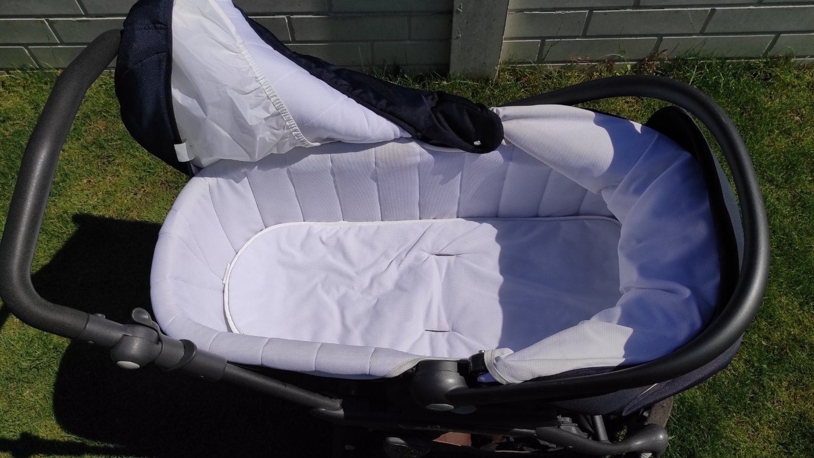 Kočík bol kupovaný v r. 2015, farba na športovej časti je vyťahaná od slnka, kedže sa používal viac ako vanička. Poškodenia som pofotila, košík sa trhal, tak sme dali prešiť. Nánožník má na fotke žmolky (dajú sa odstrániť). Konštrukcia je v poriadku, má škrabance, zadné kolesá sú v poriadku. Okrem estetických nedostatkov je v poriadku a plne funkčný.