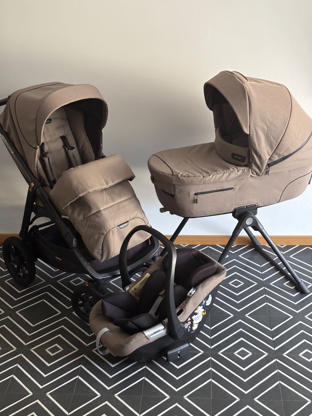 Predávame náš vysokokvalitný taliansky kočiar v 4-kombinácii, ktorého súčasťou je aj stojan. Je veľmi praktický a hygienický, nakoľko na neho umiestnite všetky 3 časti (xxl vanička, športová časť aj vajíčko) kdekoľvek v byte bez špiny z koliesok.