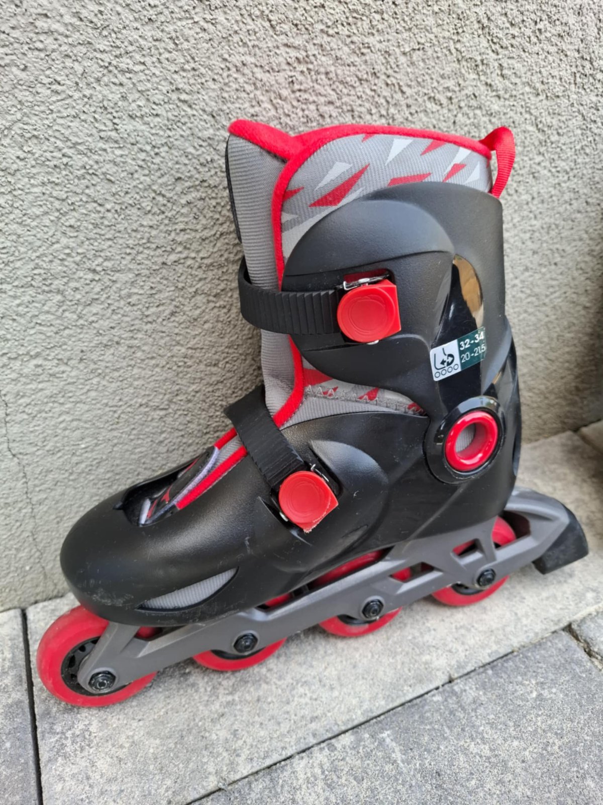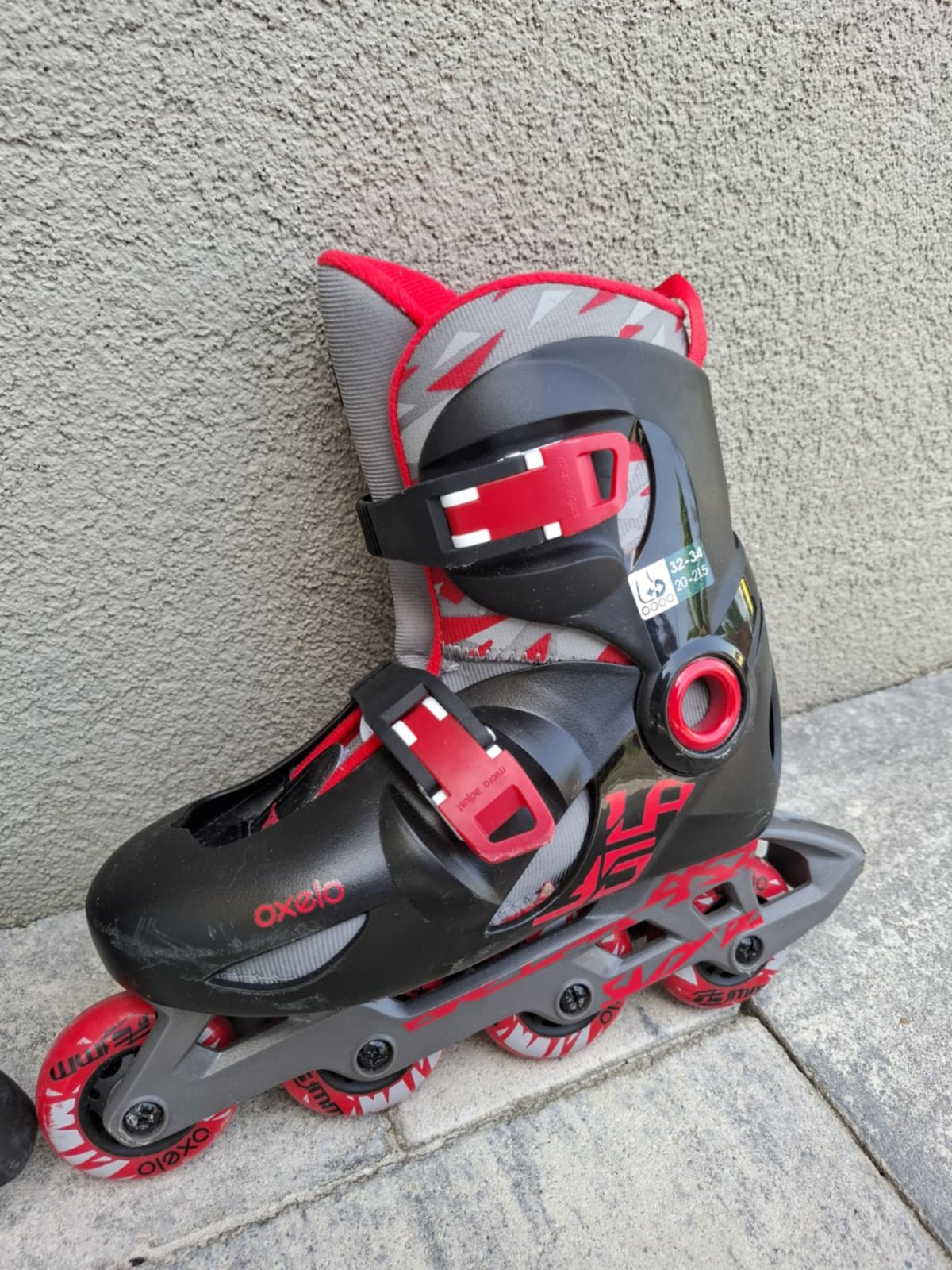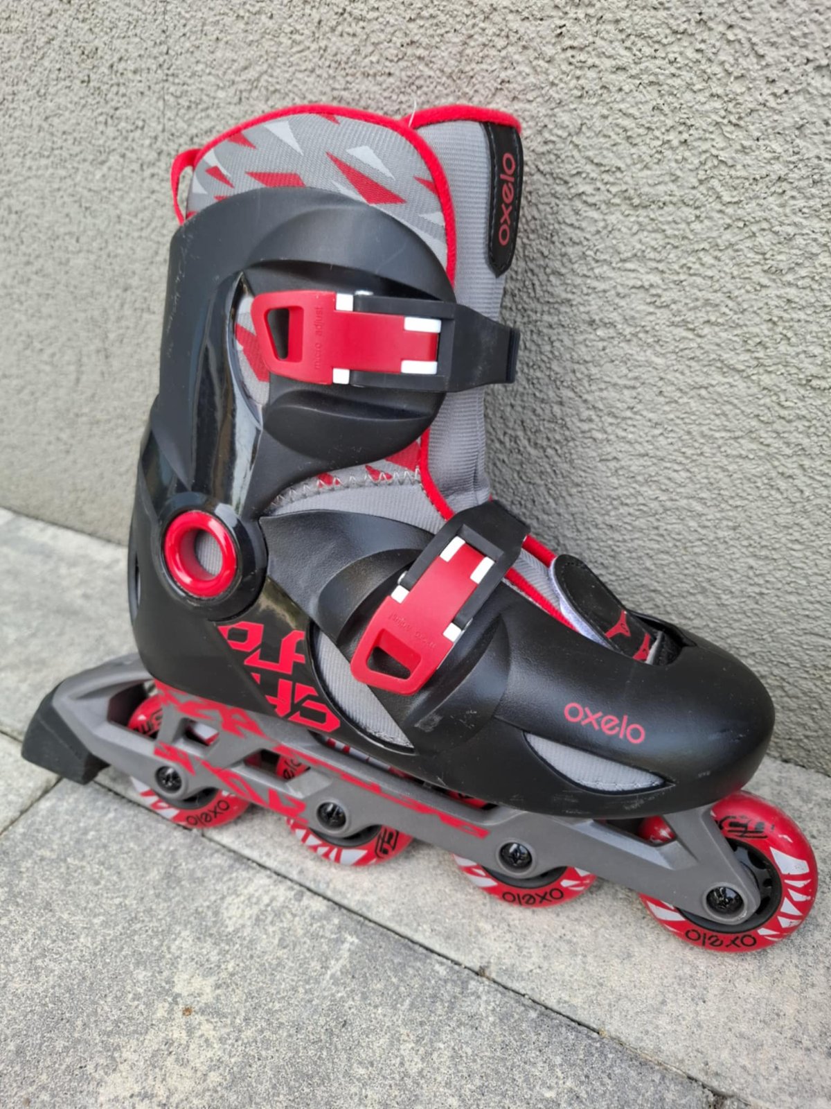 Predam kolieskove korcule znacky Oxelo vo velkosti 32 az 34 (korcule sa daju nastavit v 3 velkostiach, rastu s detskou nohou). Pouzivane boli minimalne, javia mierne znamky pouzivania - vid. foto.