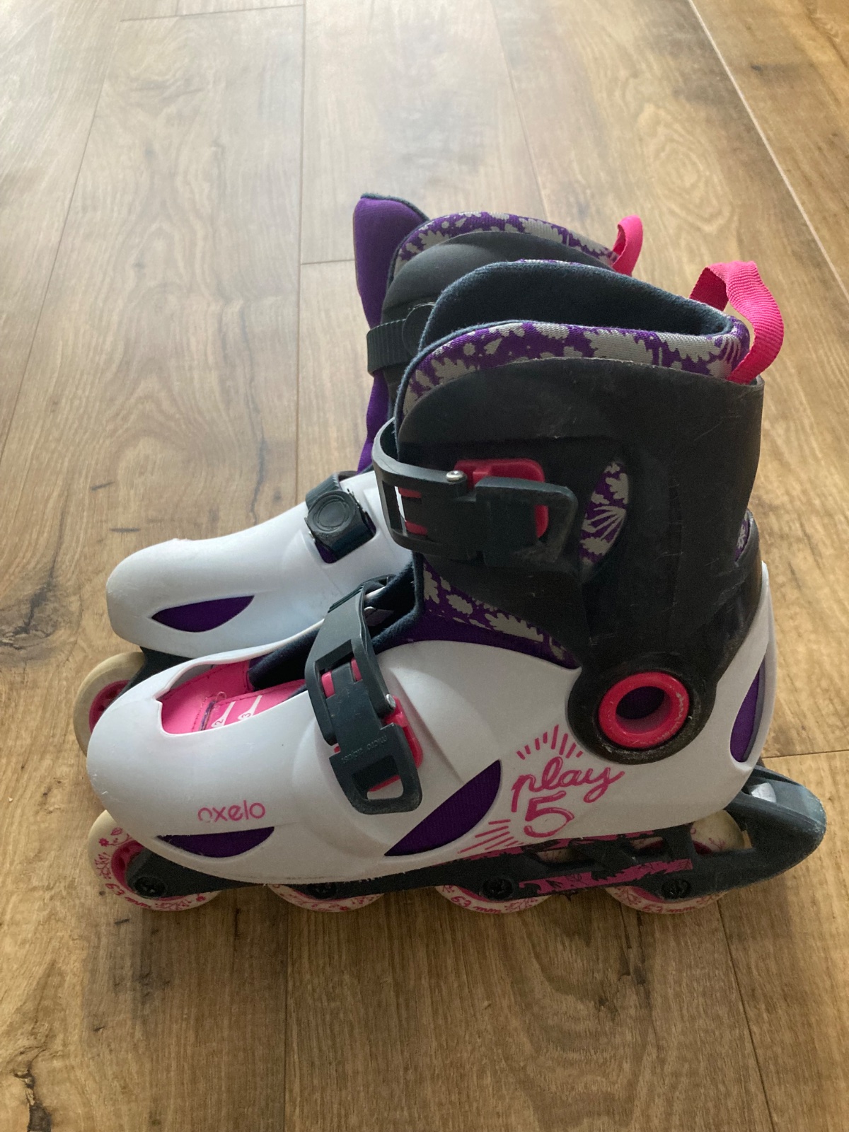 kde-tu vidieť známky používania (hoci používané boli málo), ale inak plne funkčné, veľkosť sa dá regulovať podľa dĺžky chodidla na 32 - 35, kupované v Decathlone, technický popis a recenzie tu: htt...