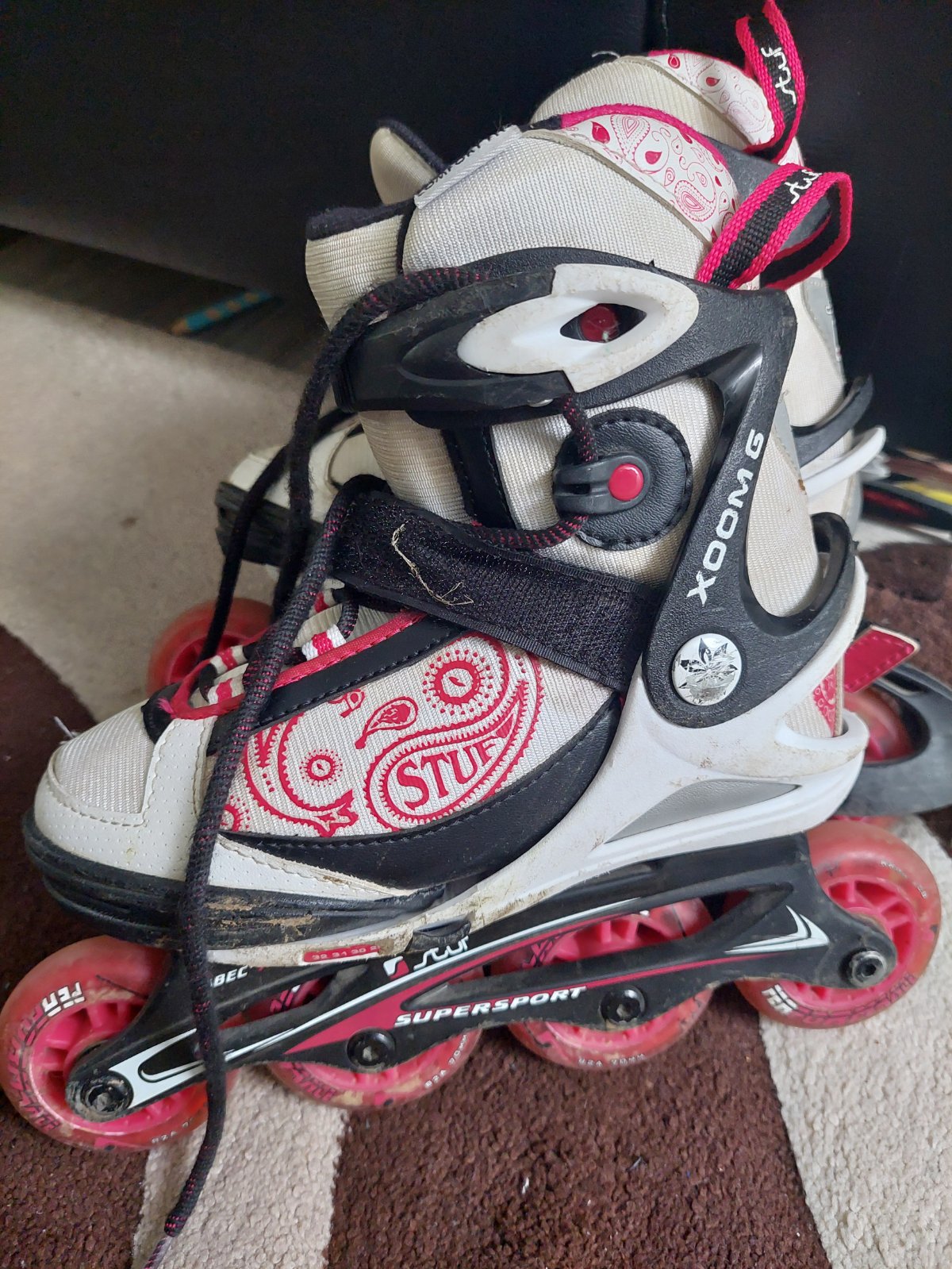 Detské kolieskové korčule č. 29-32 Zealot, Fastprincess, Sportisimo. Mali sme ich pár krát, takže škrabančeky sa vyskytnú, taktiež vnútro sa nám ušpinilo. Viď foto. Cena bez poštovného.