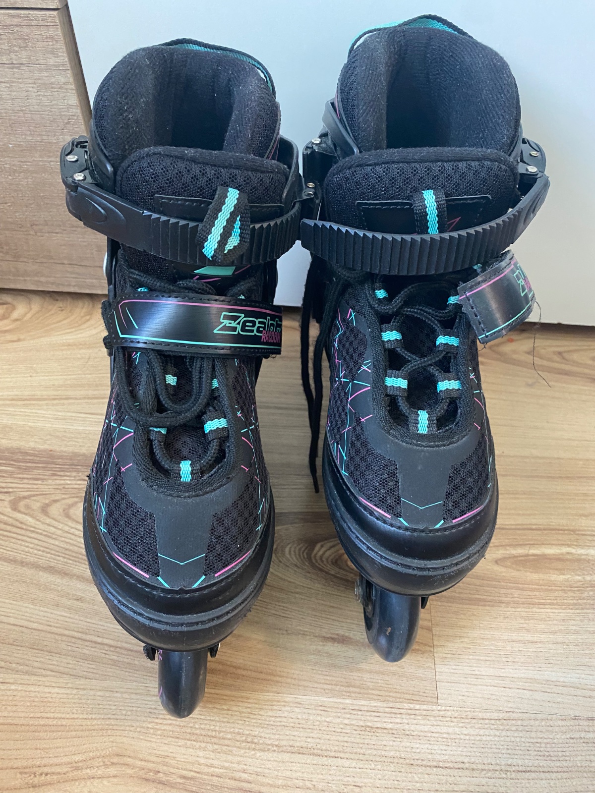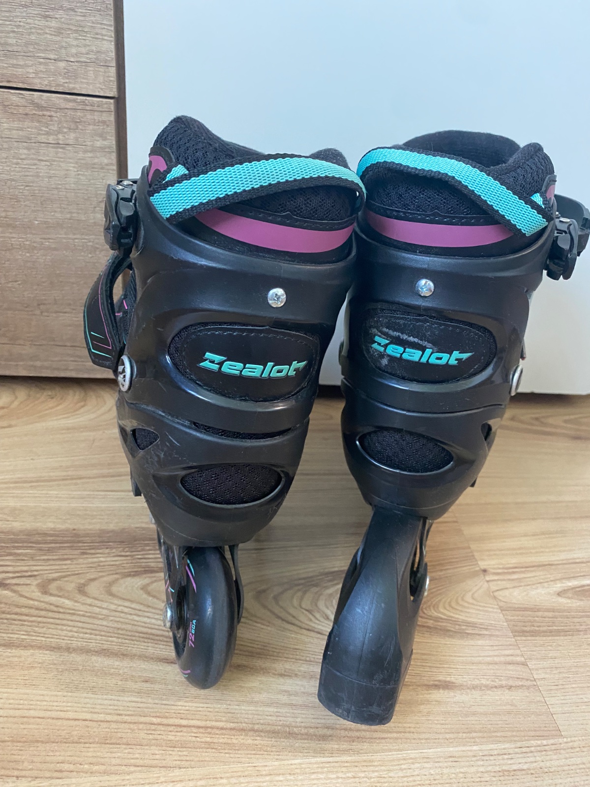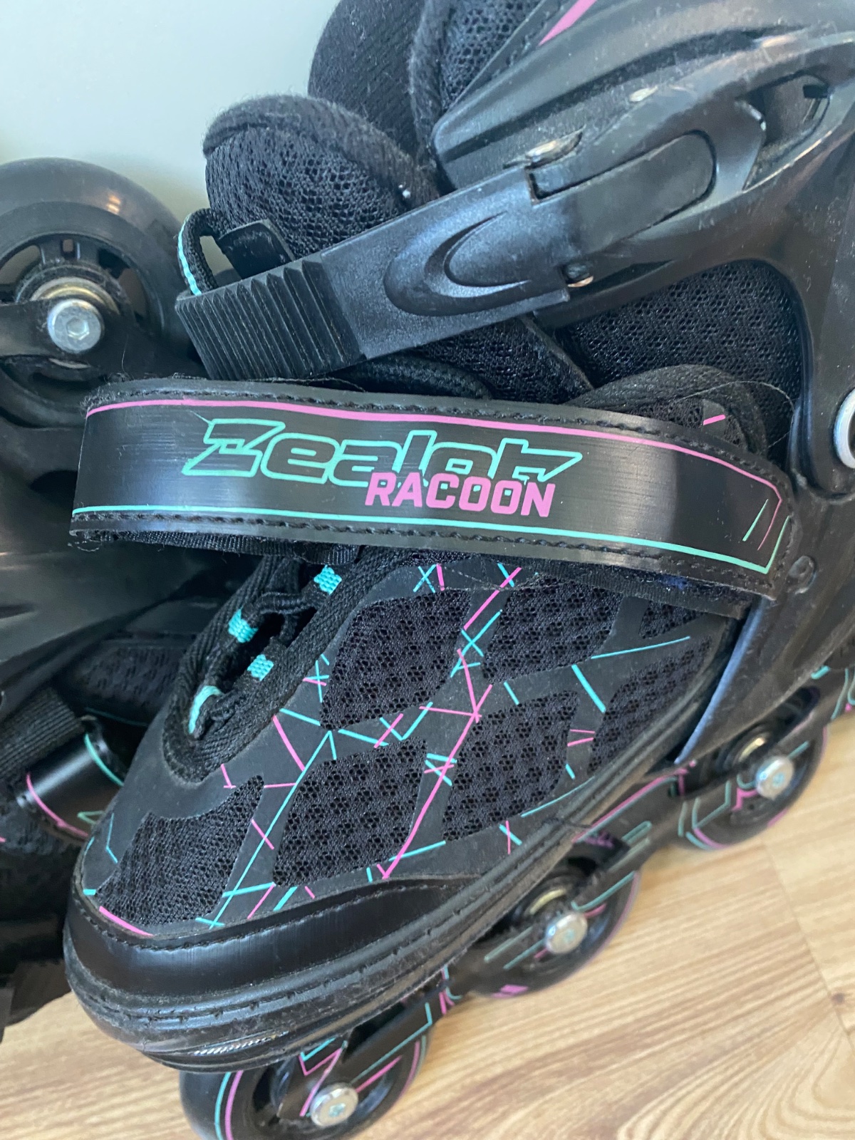 Predám štýlové a pohodlné kolieskové korčule značky Zealot Racoon s atraktívnym dizajnom (čierne s tyrkysovo-ružovými detailmi). Veľkosť je nastaviteľná od EU 34 do 37 – ideálne pre rastúcu nohu.