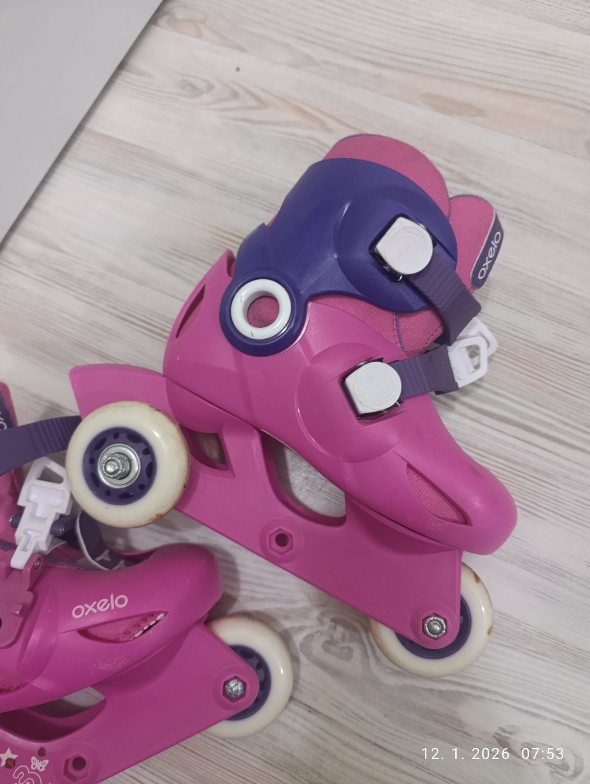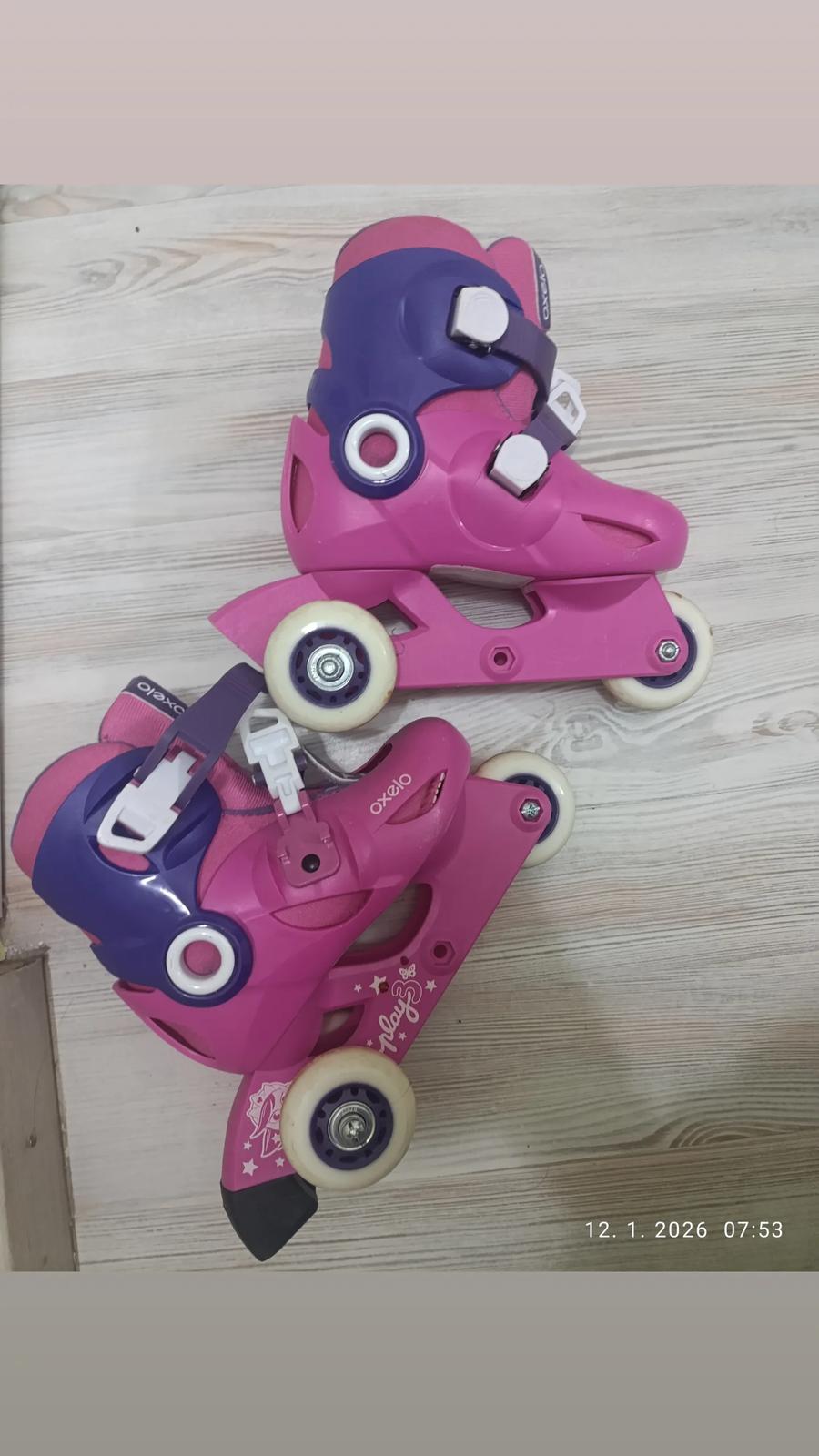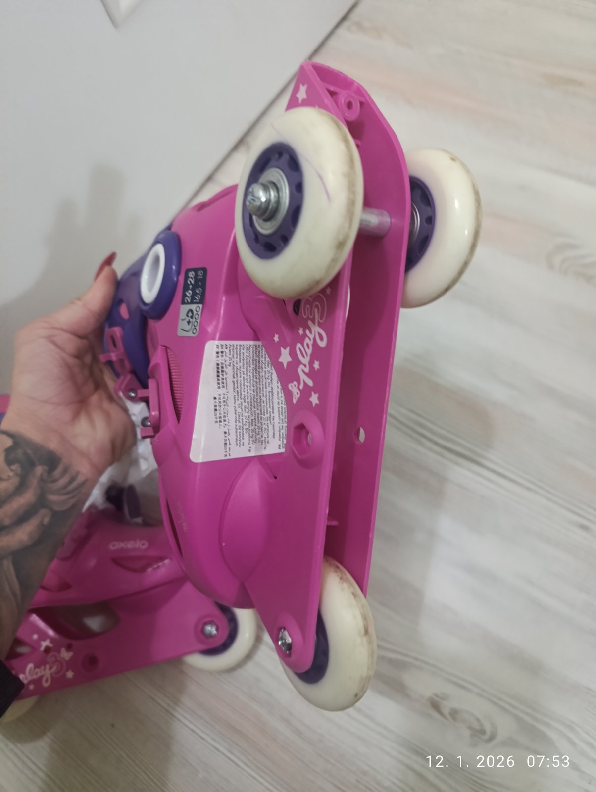 Veľkosť je nastaviteľná od 26 po 28. Vo veľmi dobrom stave. Kolieska sa dajú nastaviť aby išli za sebou. Momentálne sú tak ako vidno na fotke.