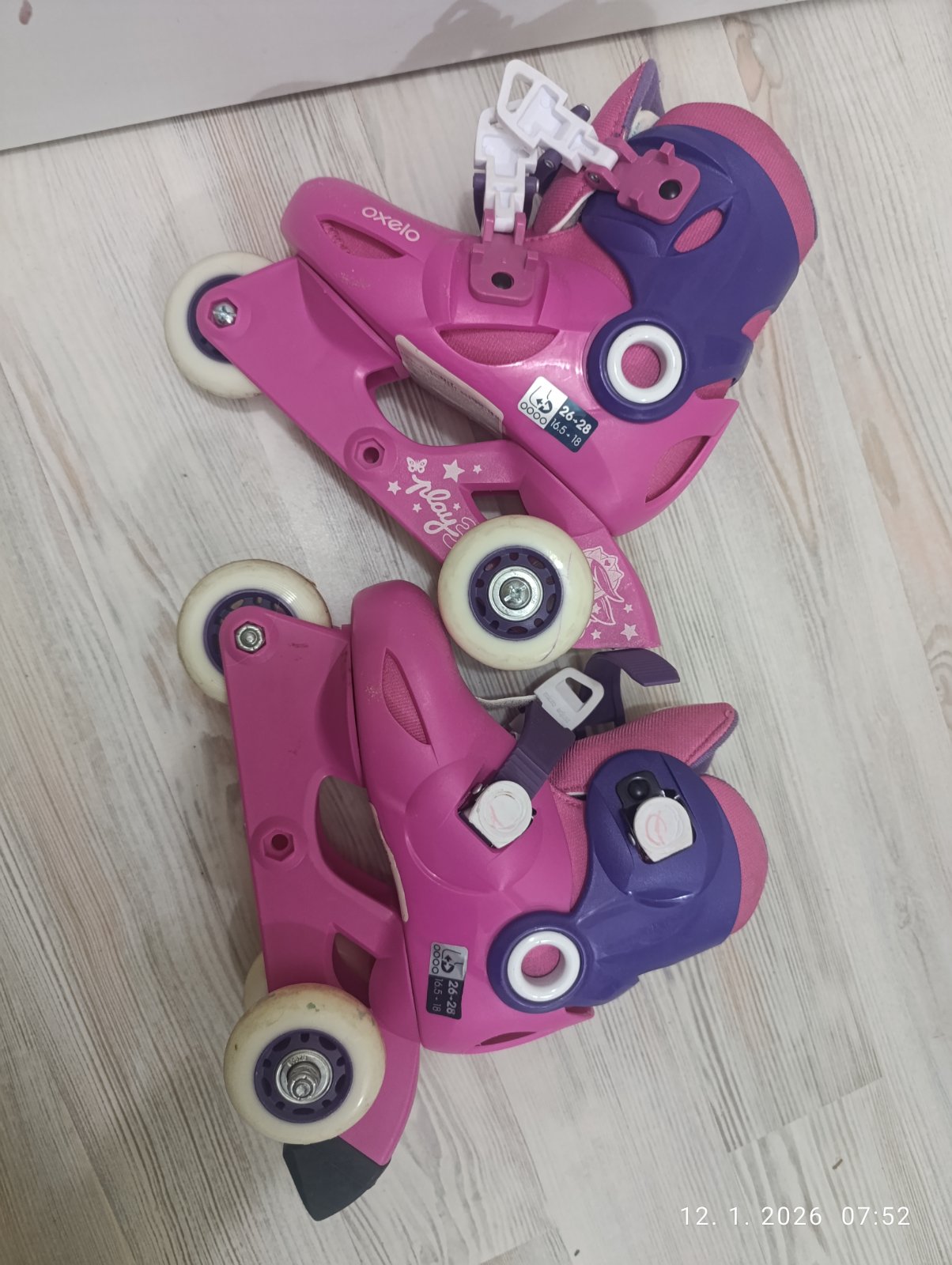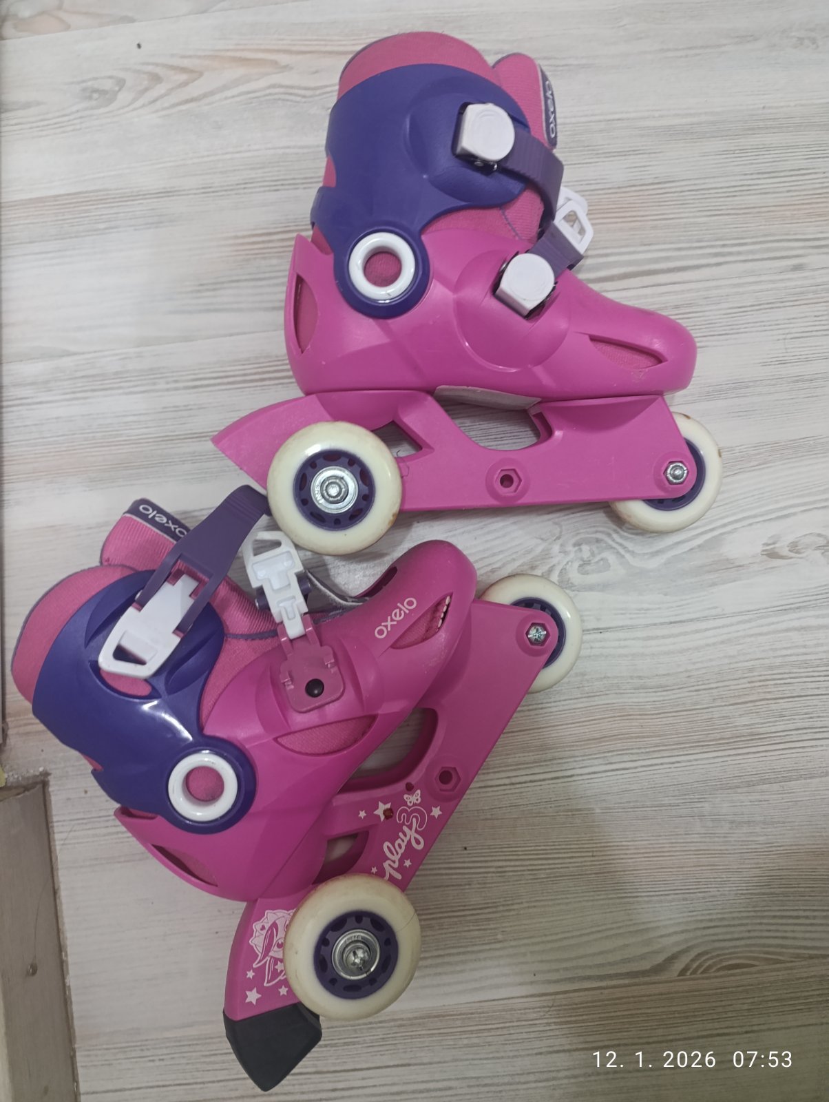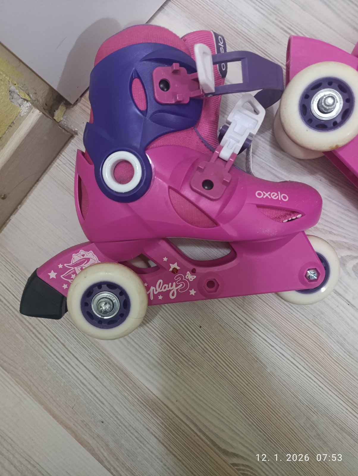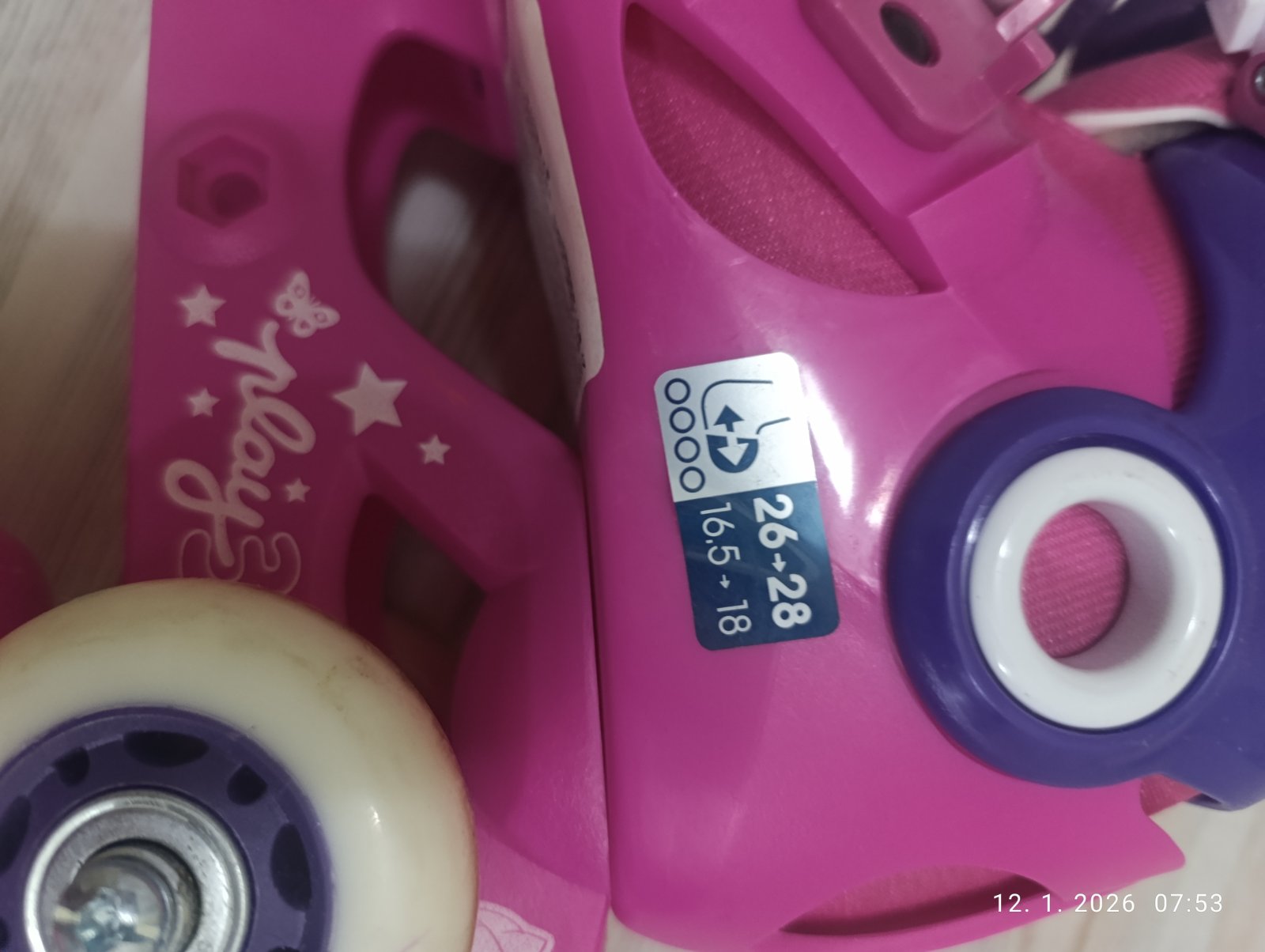 Veľkosť je nastaviteľná od 26 po 28. Vo veľmi dobrom stave. Kolieska sa dajú nastaviť aby išli za sebou. Momentálne sú tak ako vidno na fotke.