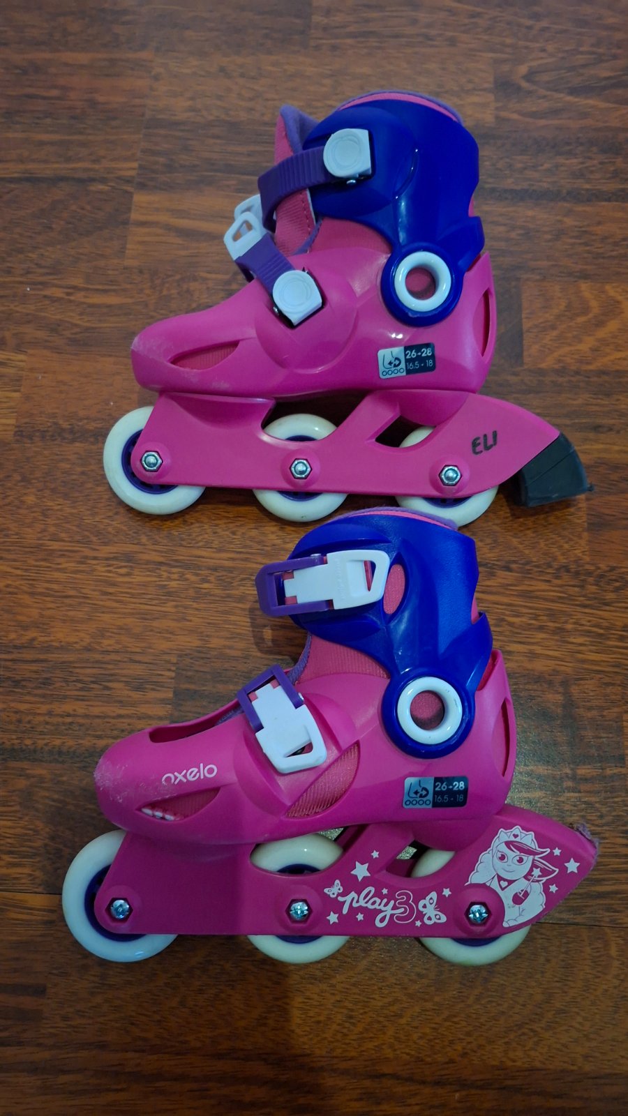 Kolieskové korčule kupované v Decatlone, s nastaviteľnou veľkosťou 26-28. Stav ako na fotkách, malé škriabnutia, inak super stav. Korčule sa dajú nastaviť až v 3 veľkostiach, rastú tak s nohou dieť...