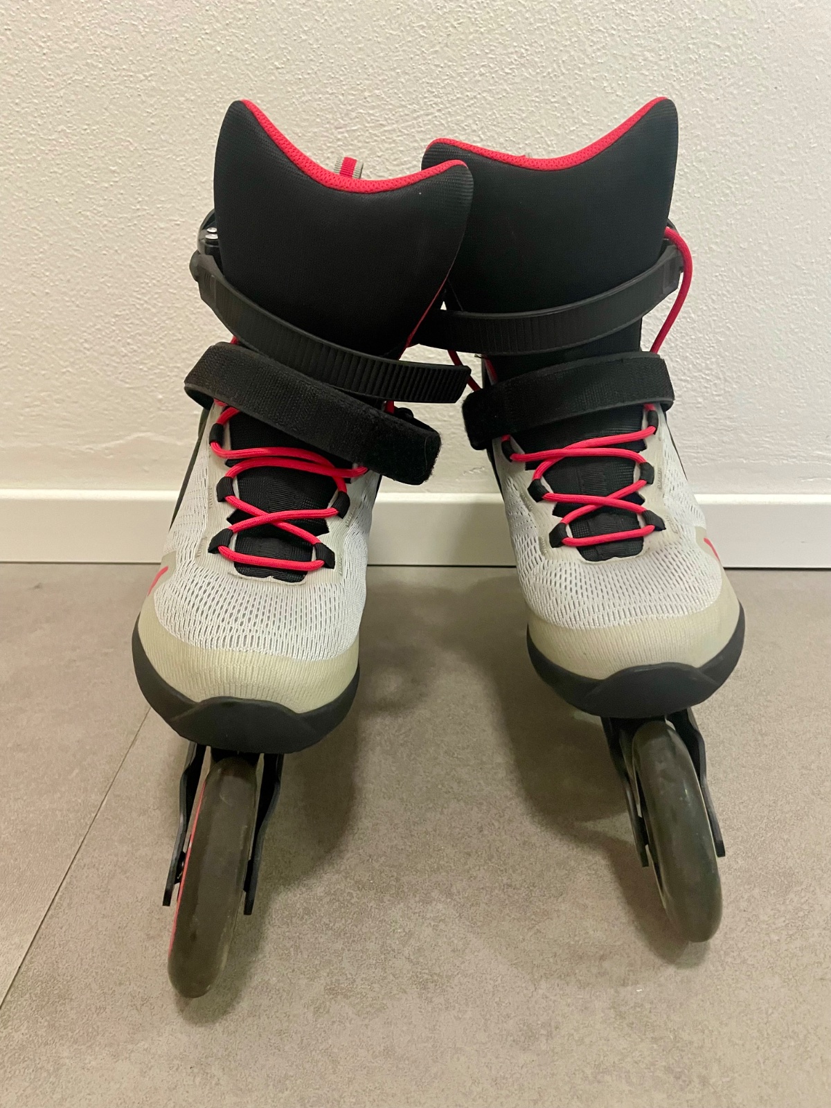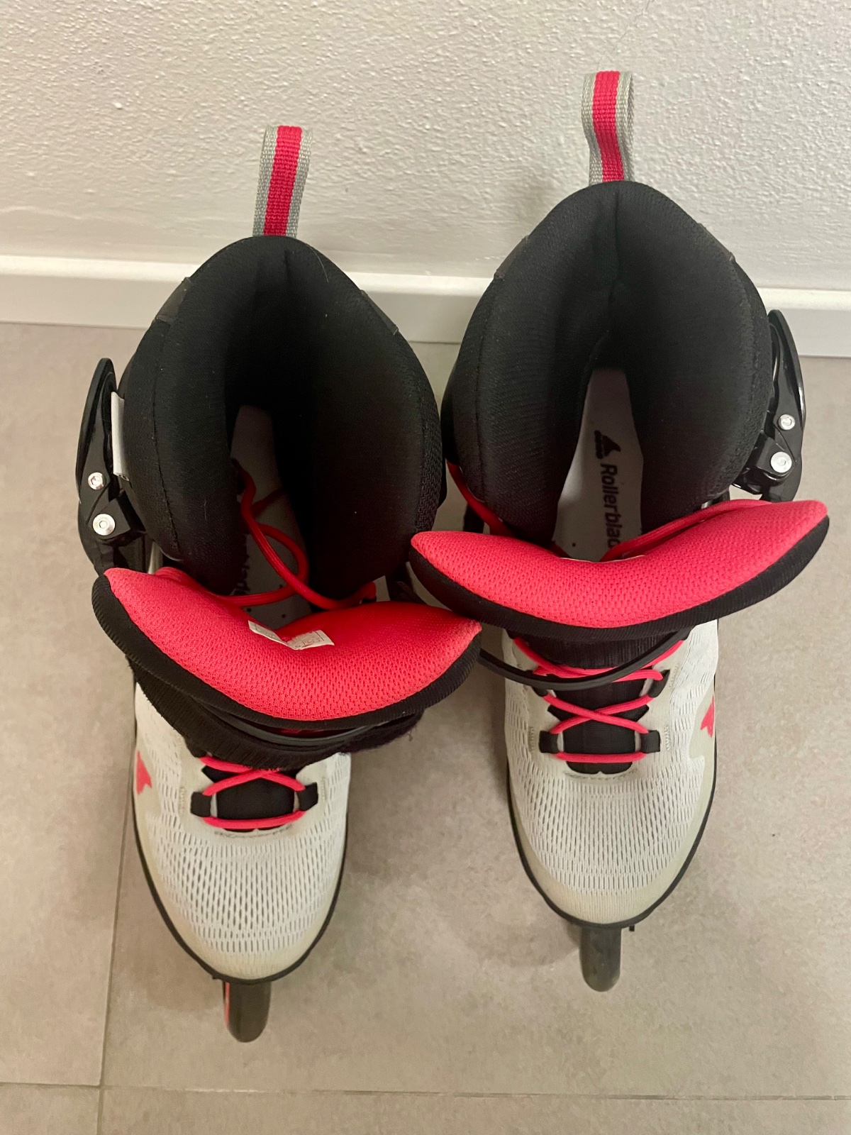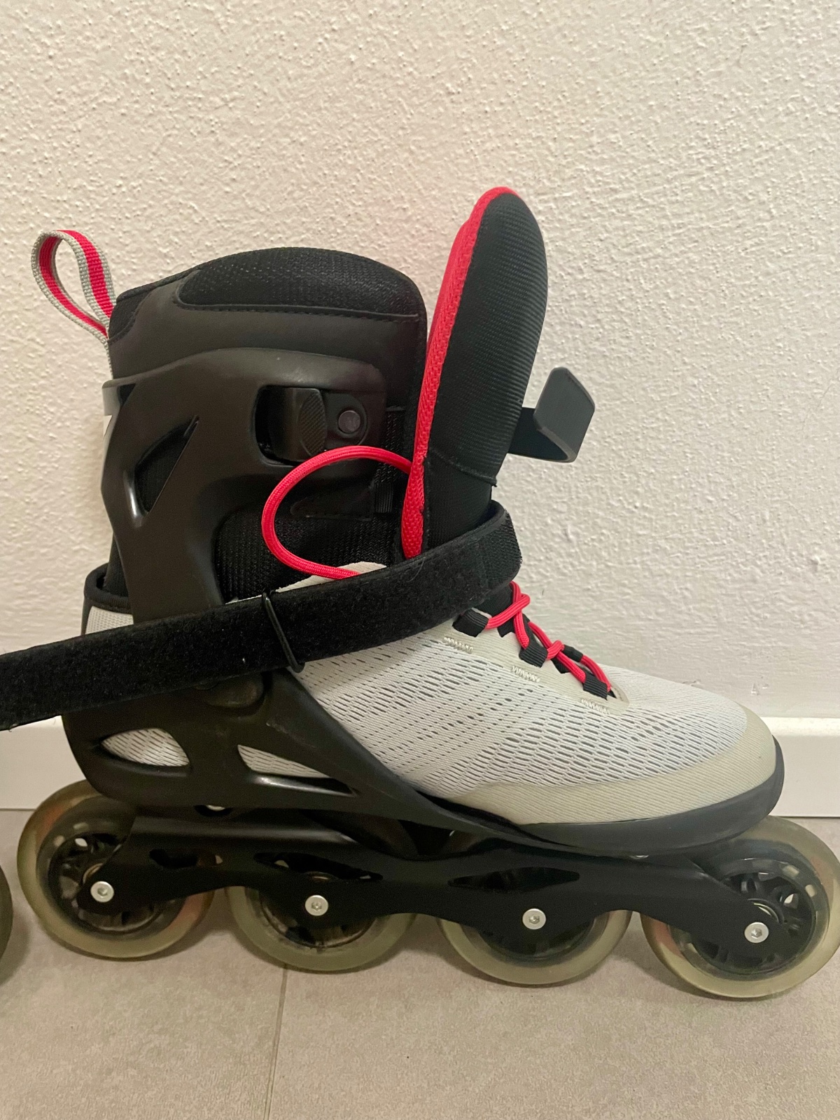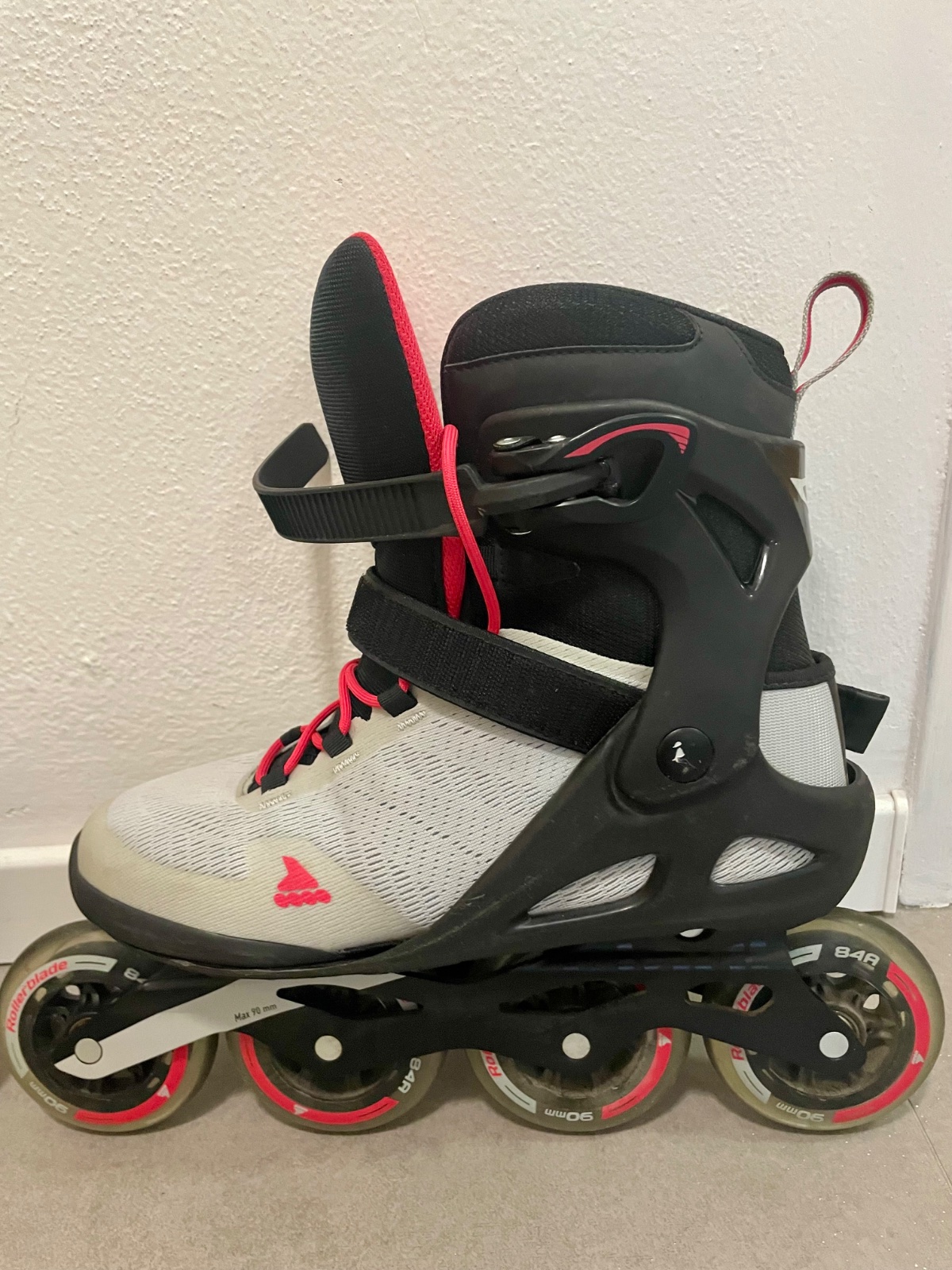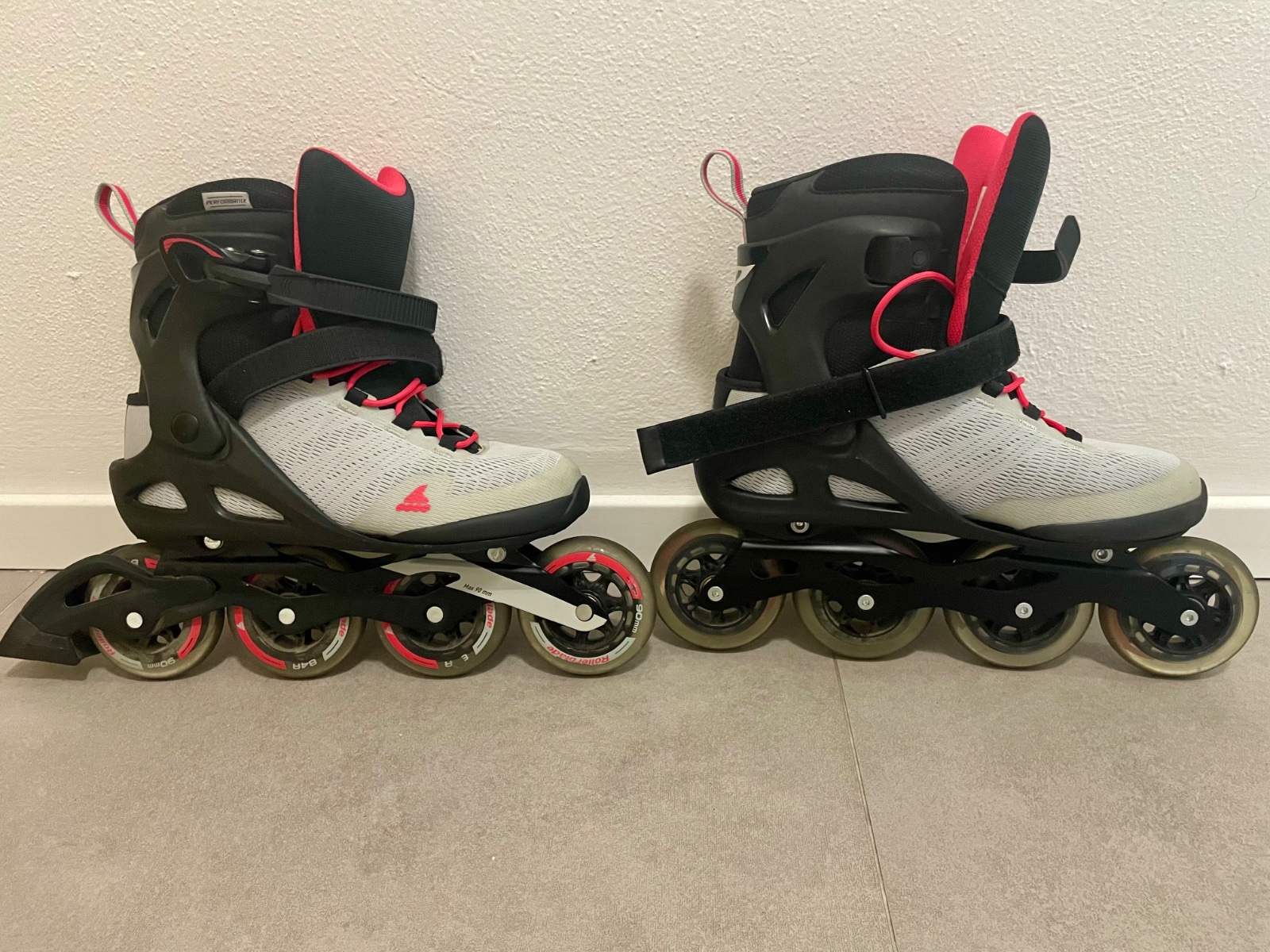 Predám vo veľmi dobrom stave párkrát vzaté dámske kolieskové korčule značky Rollerblade Sirio 90 W Light Grey/Geranium 270, veľkosť 42.
