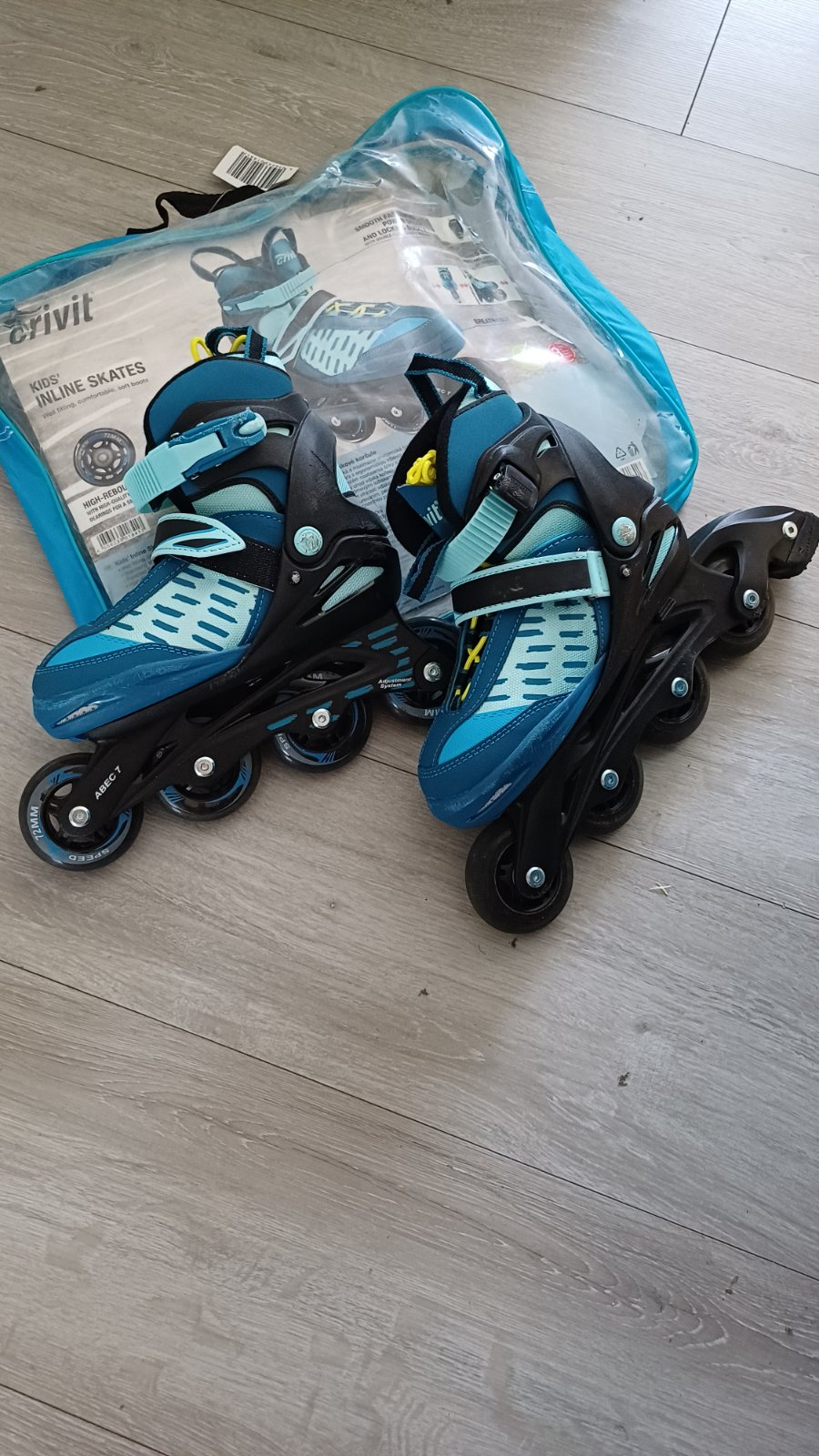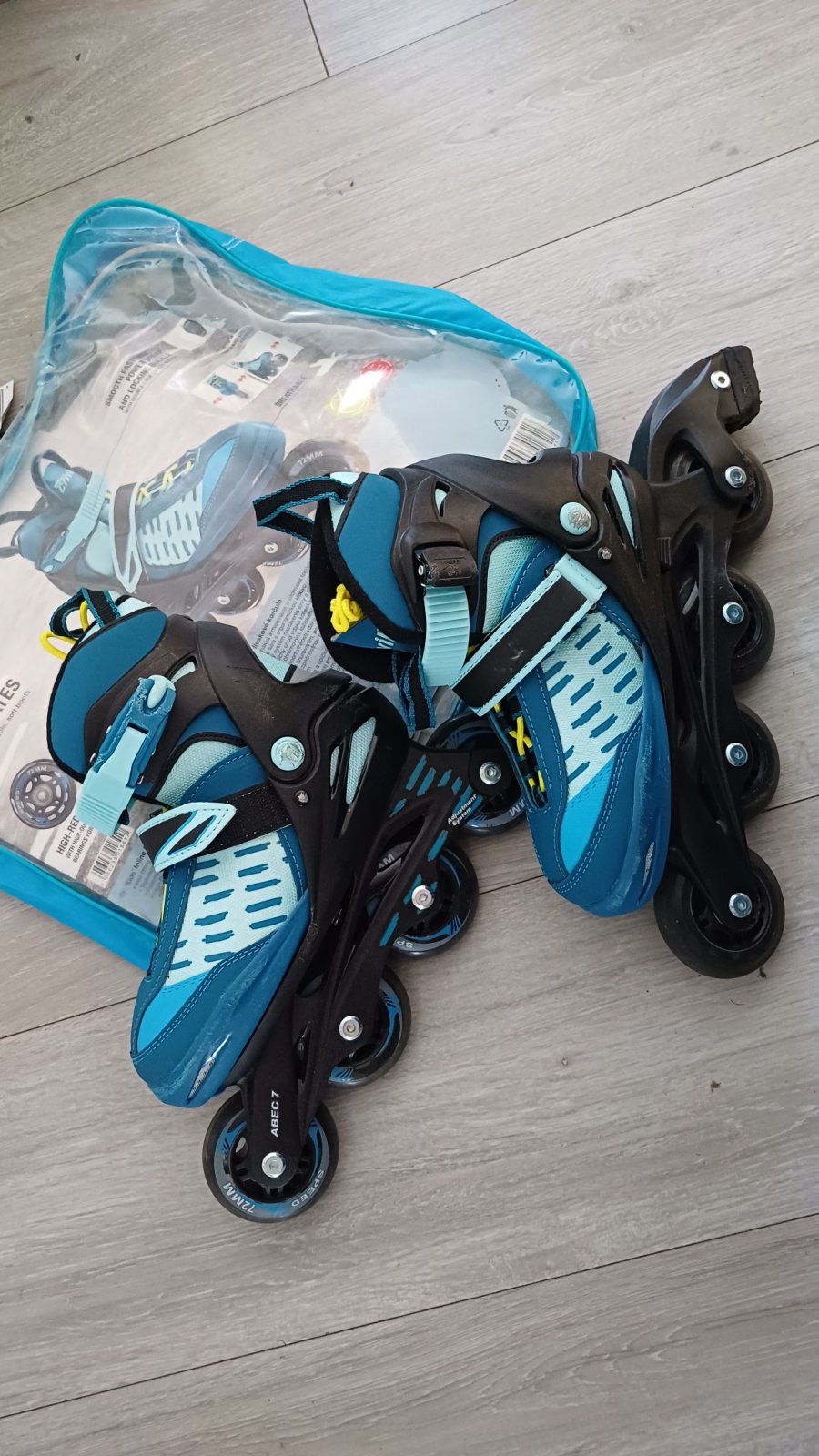 Kolieskové korčule nastaviteľná veľkosť 29-33, bežné známky používania, boli používané iba vo vnútri.V