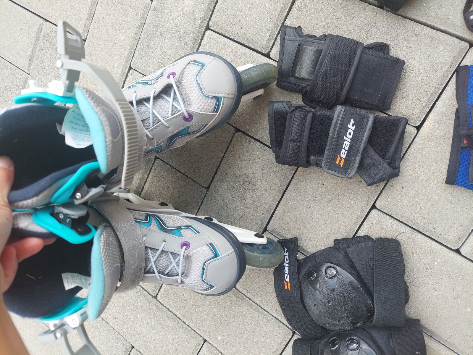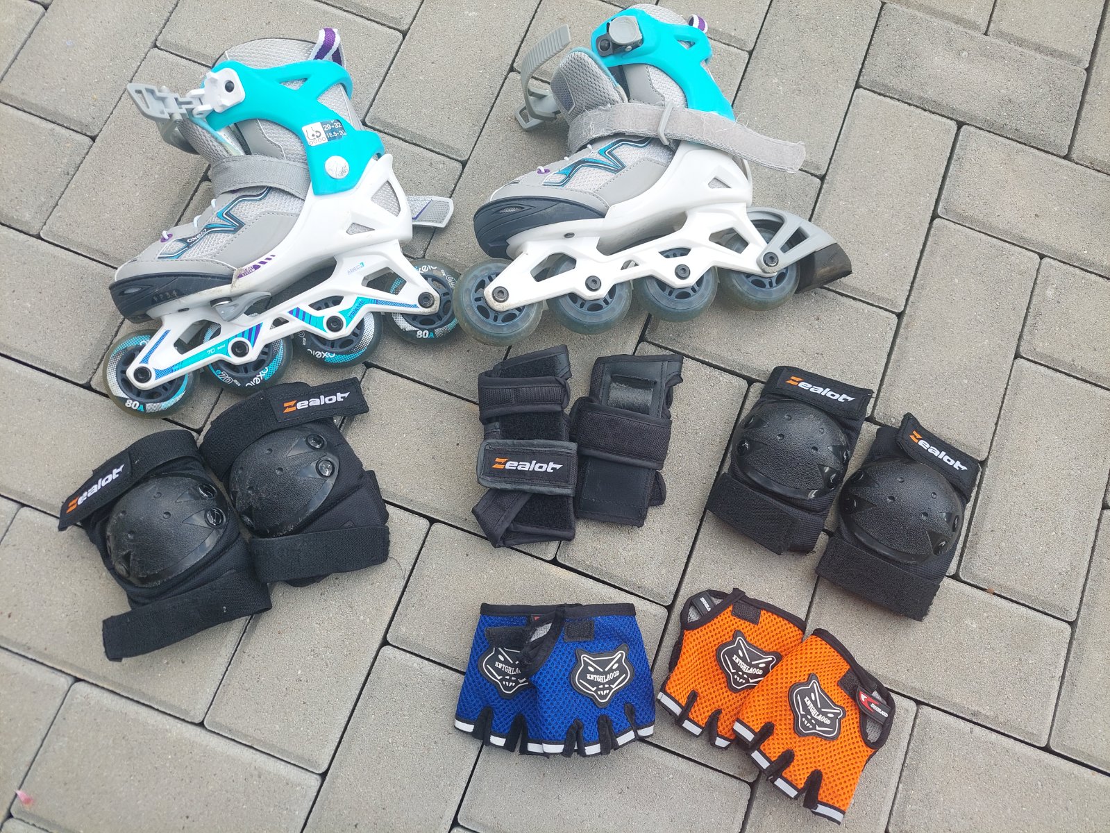 Kolieskové korčule nastaviteľné od Č.29 po Č.32...Takto dlho aj využívané aj čosi dlhšie no len zo dva krát v sezóne,silikón.kolieska.Na korč.známku používania no v dobrom funkčnom stave.Chrániče na kolená,lakte,dlane,už bez rukavíc čo sú na foto-predané.