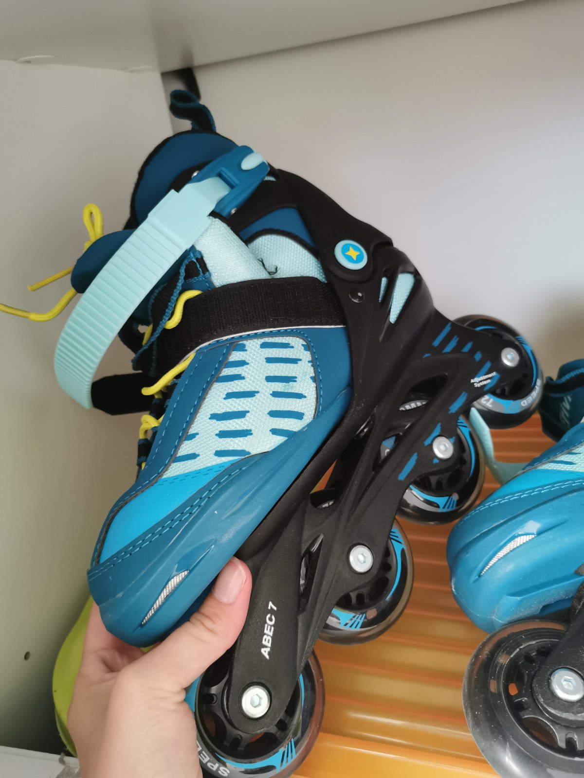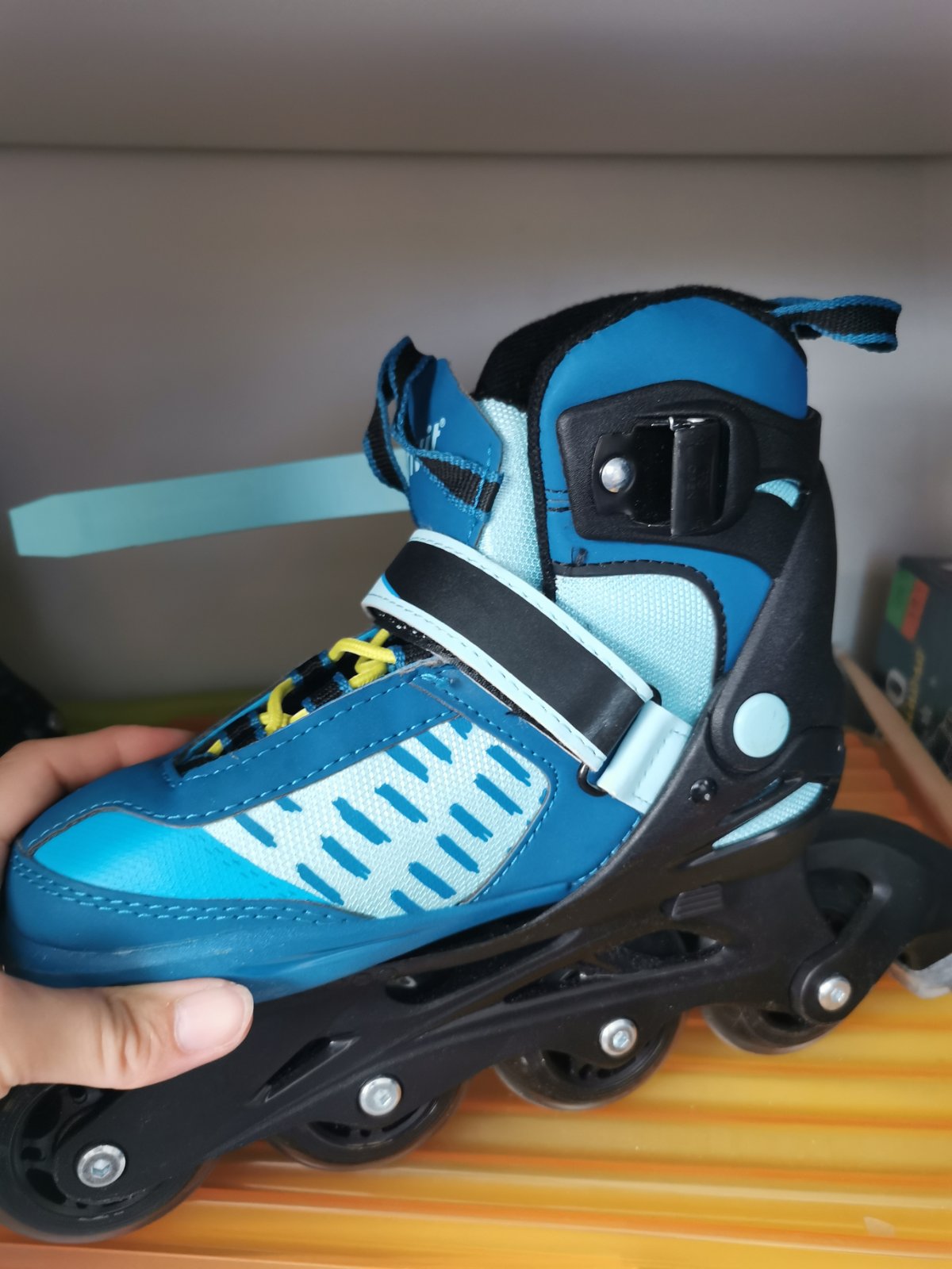 Kolieskové korčule nastaviteľná veľkosť 29-33, bežné známky používania, boli používané iba vo vnútri.V