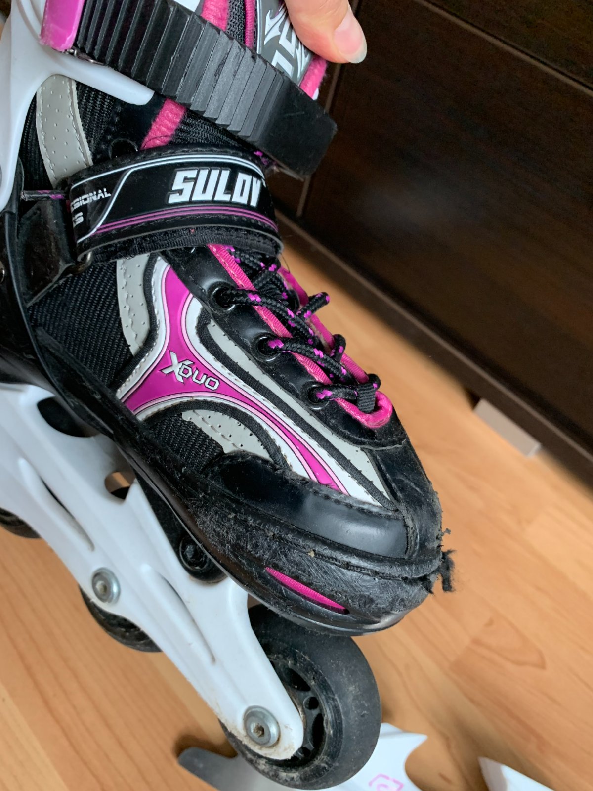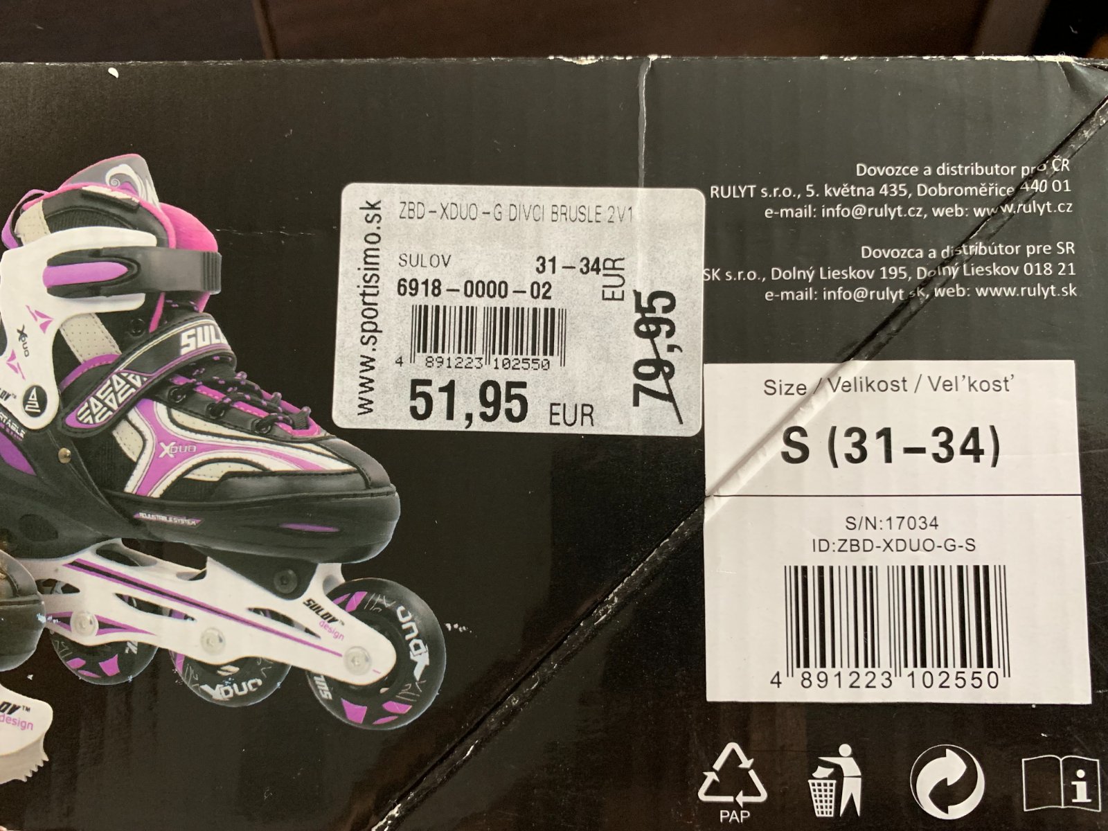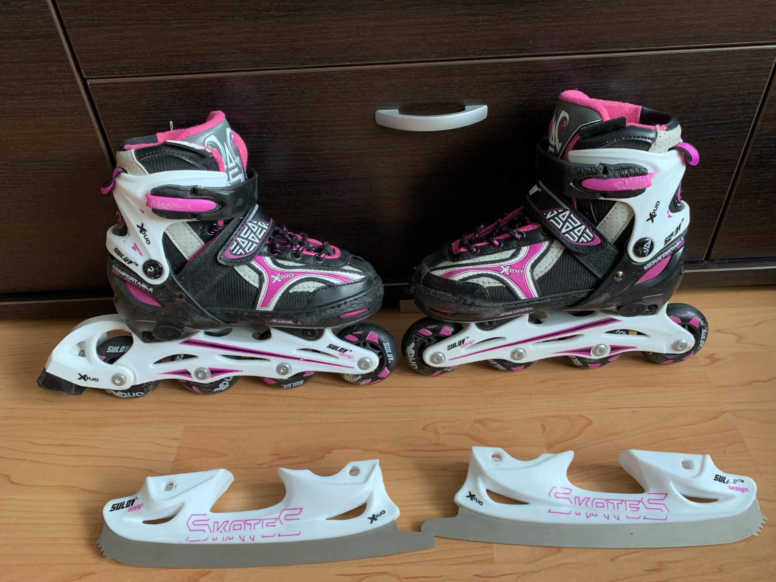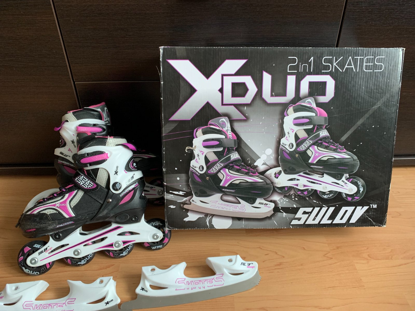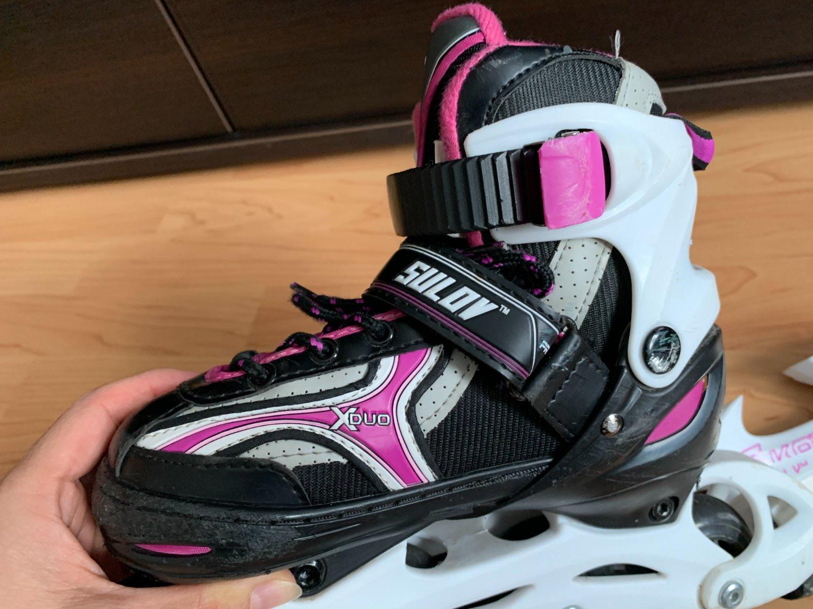 Dievčenské korčule Sulov veľkostí 31-34 sú nastaviteľné korčule s vymeniteľným podvozkom. Veľkosť sa dá prispôsobiť na štyri rôzne veľkosti jednoduchým stlačením tlačidla. Vyrobené z odolného technického nylonu PVC, vnútorný materiál je tvorený vystuženým nylonom, termo výstelkou a komfortnou vložkou. Zapínanie zabezpečuje obojstranná pracka s Auto Lock poistkou, pracka na suchý zips a šnurovanie. Balenie obsahuje nerezový hokejový nôž a podvozok pre In-Line korčuľovanie.
