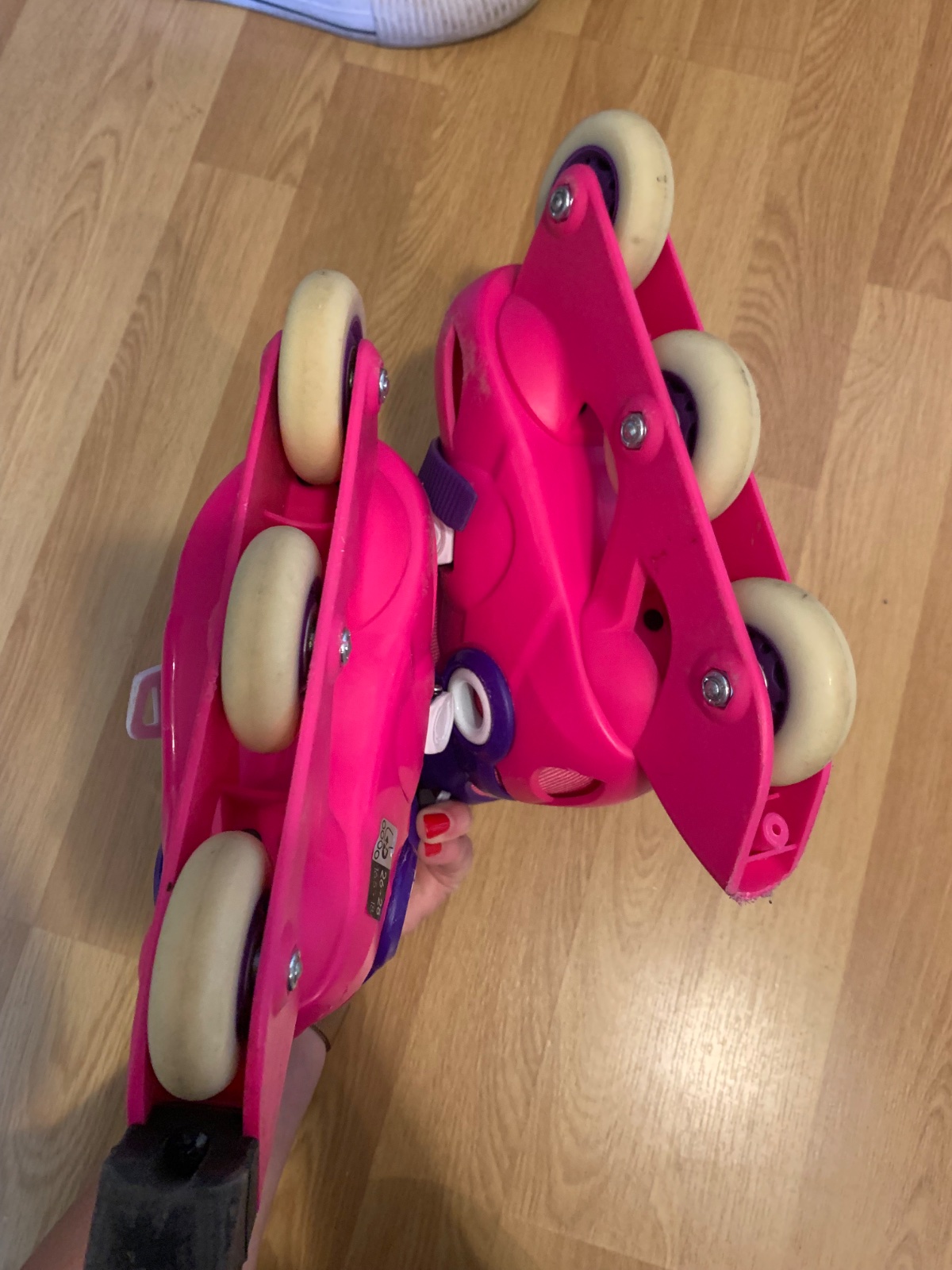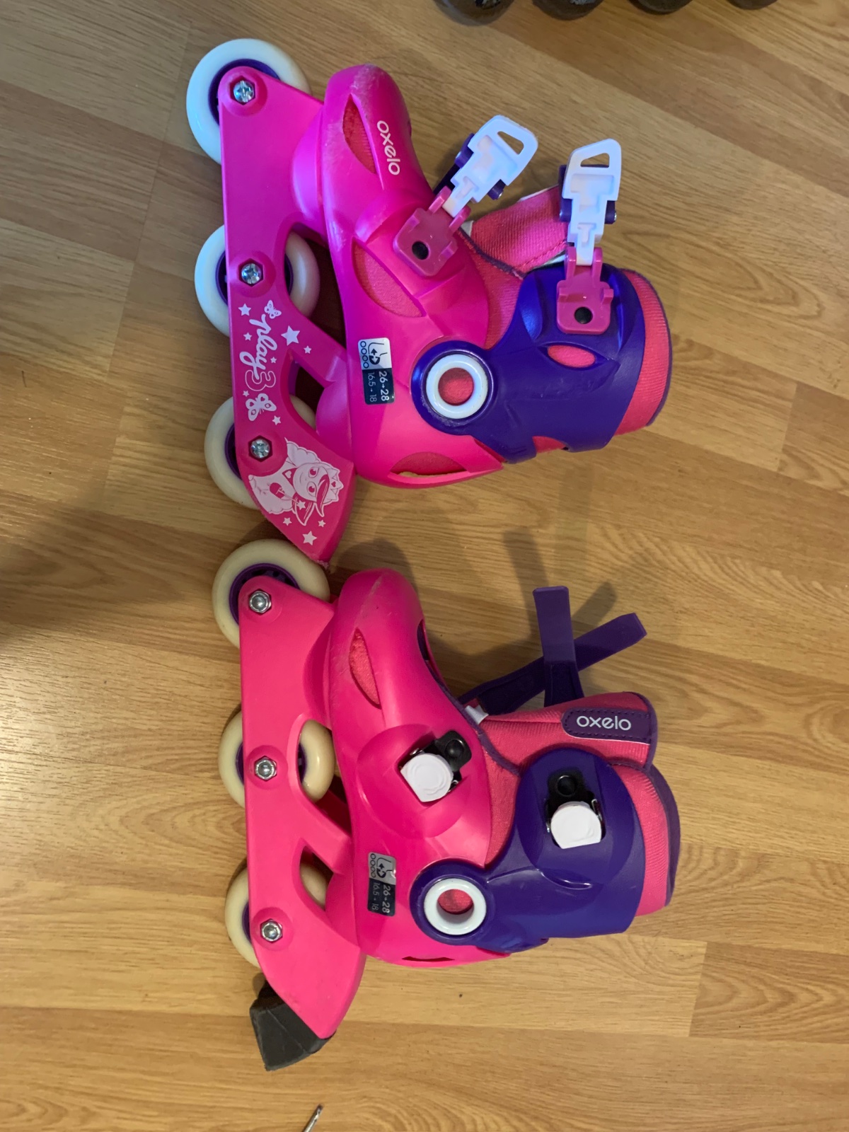 Dievcenske kolieskive korcule Oxelo (Decathlon). Nastavitelna velkost od 26-28. Pouzite parkrat, bez vacsich znamok pouzitia ci poskodenia.
