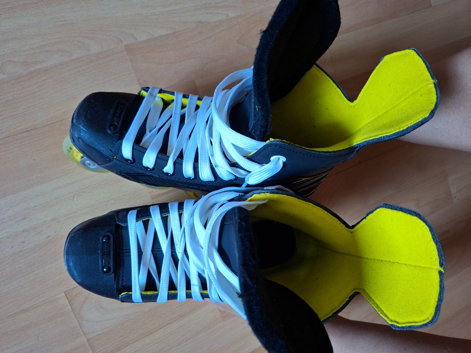 Párkrát obuté, top kvalitne inline korcule zn. Bauer, velkost 5 (vnútorná dĺžka 24,5-25 cm). Zopár škrabancekov na topankach, kolieska jemne zmatnene, kovanie a loziska top stav, vložky aj snurky v top stave. Využité 2x, výlučne na hokejbalovom betóne.