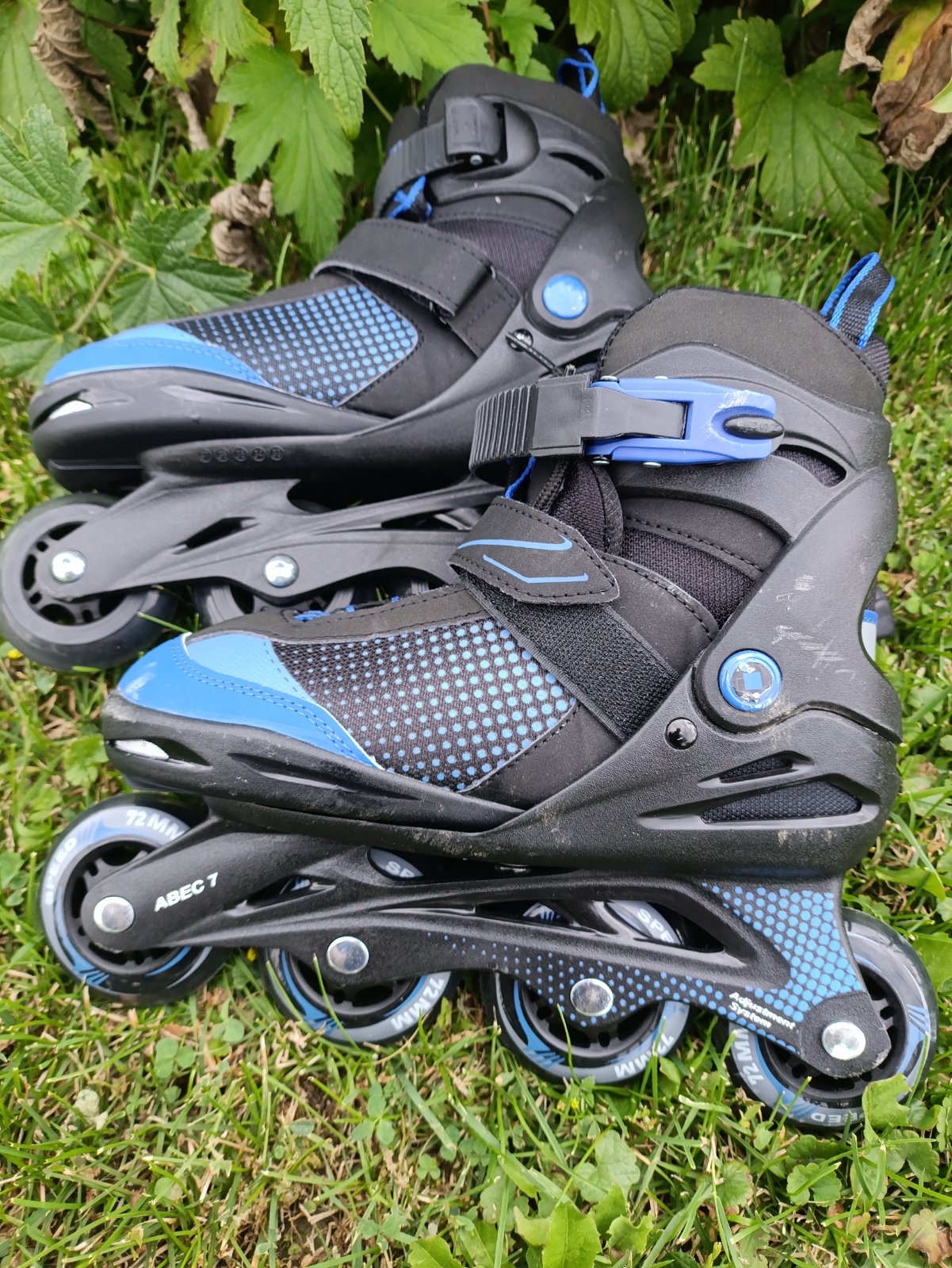 Predám dvakrát použité kolieskové korčule. Veľkostne sa dajú prispôsobiť od 33 do 37. Sú iba šuchnuté na zopár miestach, inak použitie nevidieť ani na kolieskach. Žiaľ u synov sa kolieskové neujali. Mám dva páry.