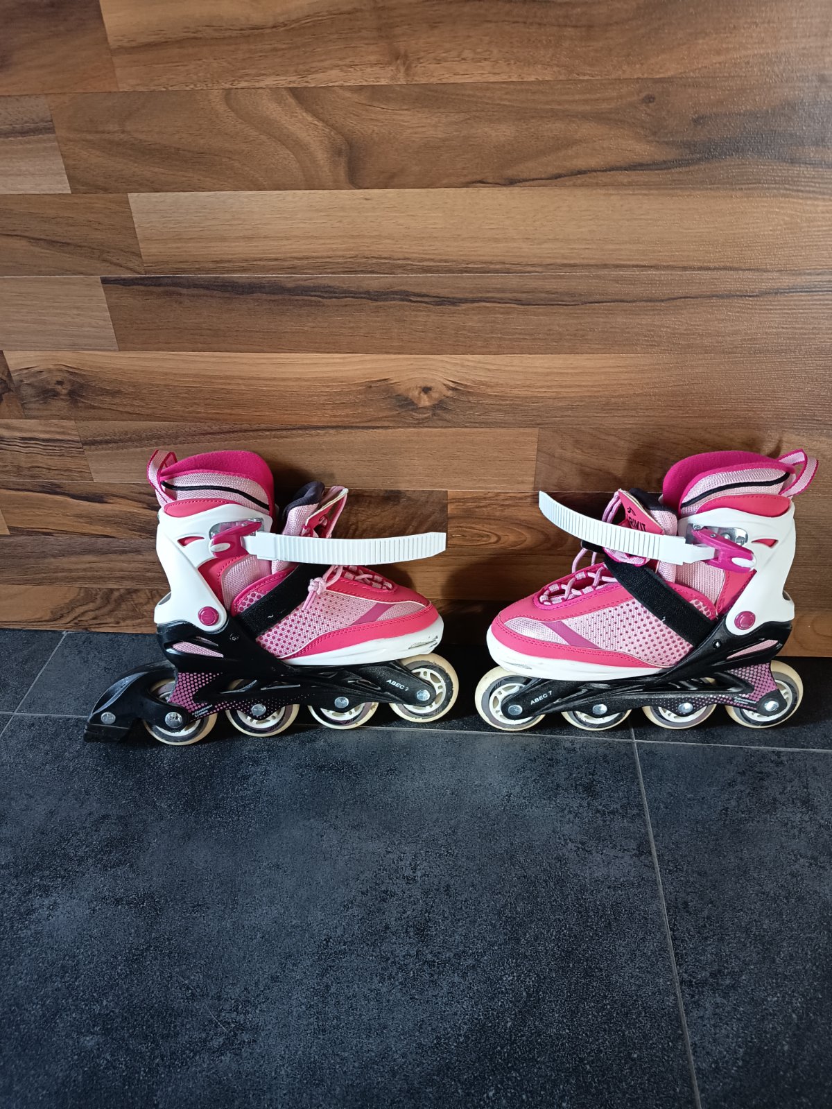Posúvam po dcére, korčule zachovalé, pár krát použité. Brzda je ako nová, nezodratá, takisto aj kolieska, čo vidno aj na fotke. Cena 45 €