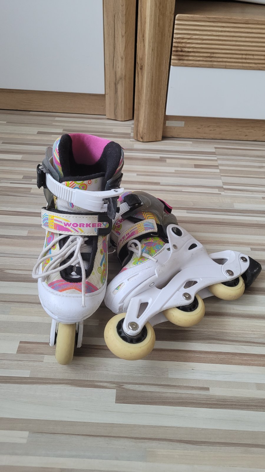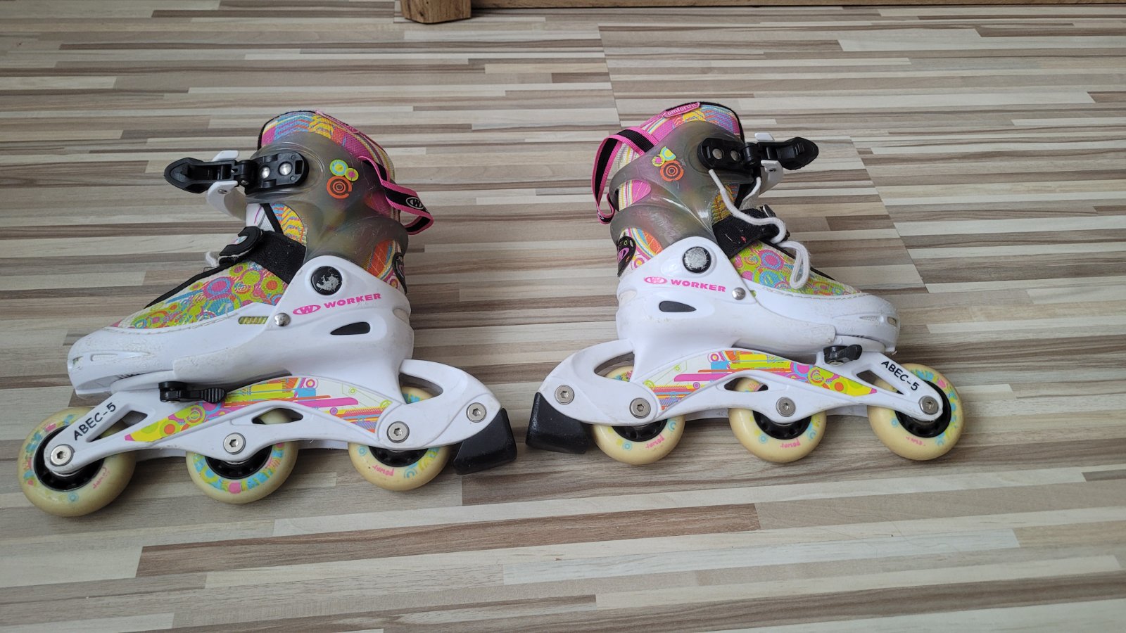 Veľmi pekné kolieskové korčule pre dievčatko v dobrom stave, iba po našej dcérke, dajú sa zväčšiť až po číslo 29, pri korculovaní blikajúce koliesko na každej.