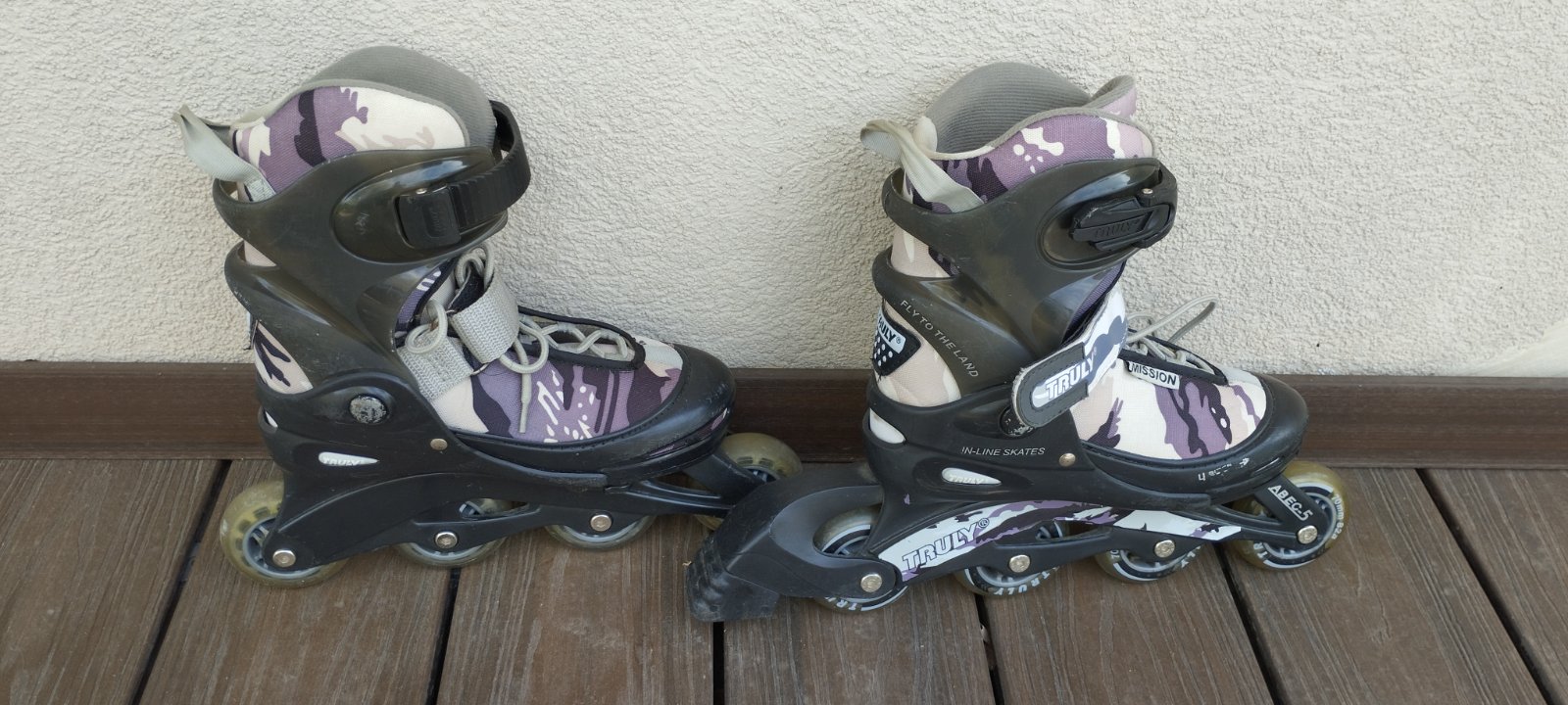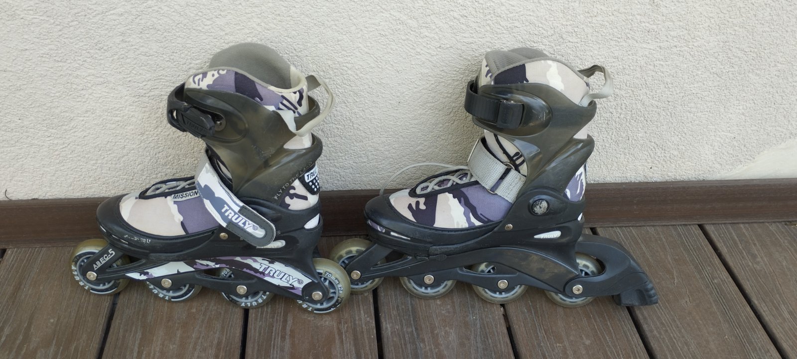 posuvné kolieskové korčule od veľkosti 34 po 37, v dobrom stave bez poškodení, majú známky používania - škrabance, ale po funkčnej stránke sú v poriadku.
