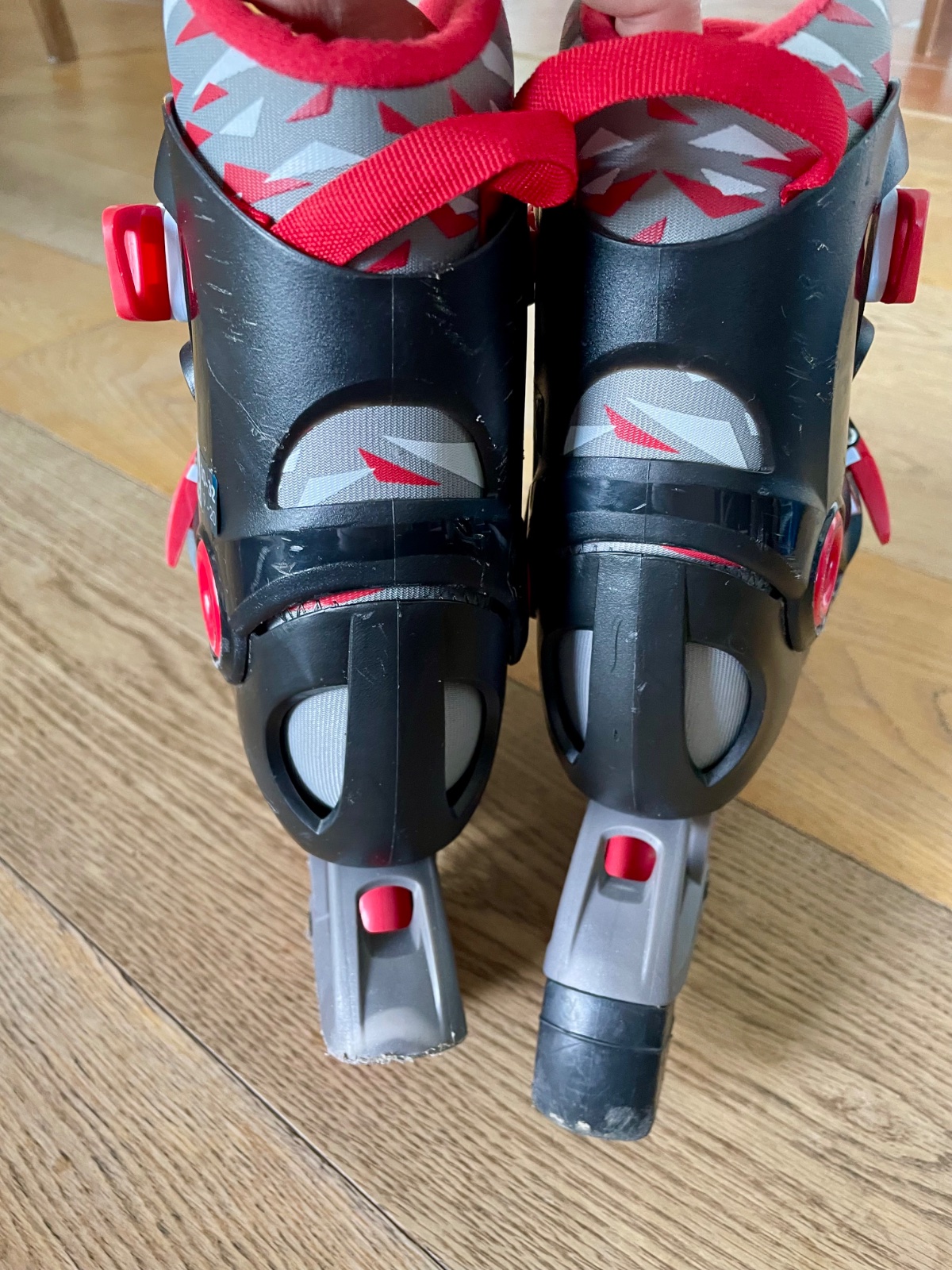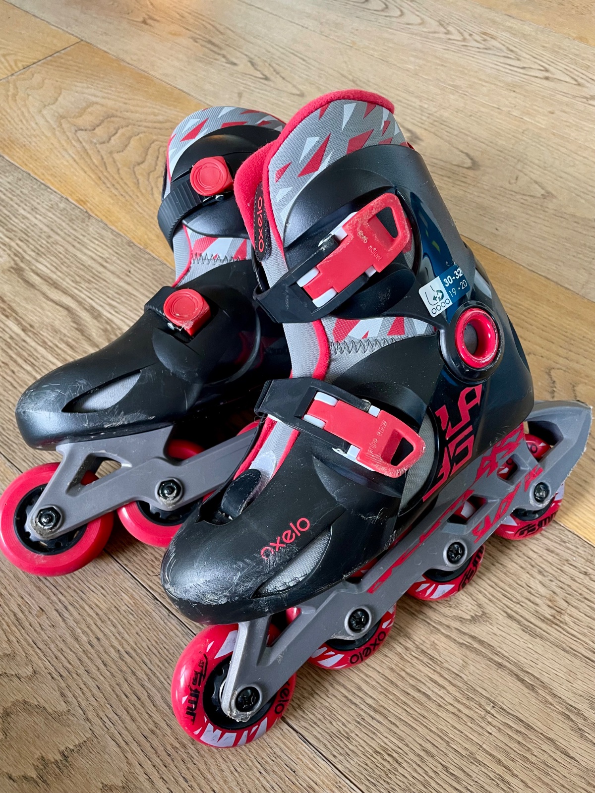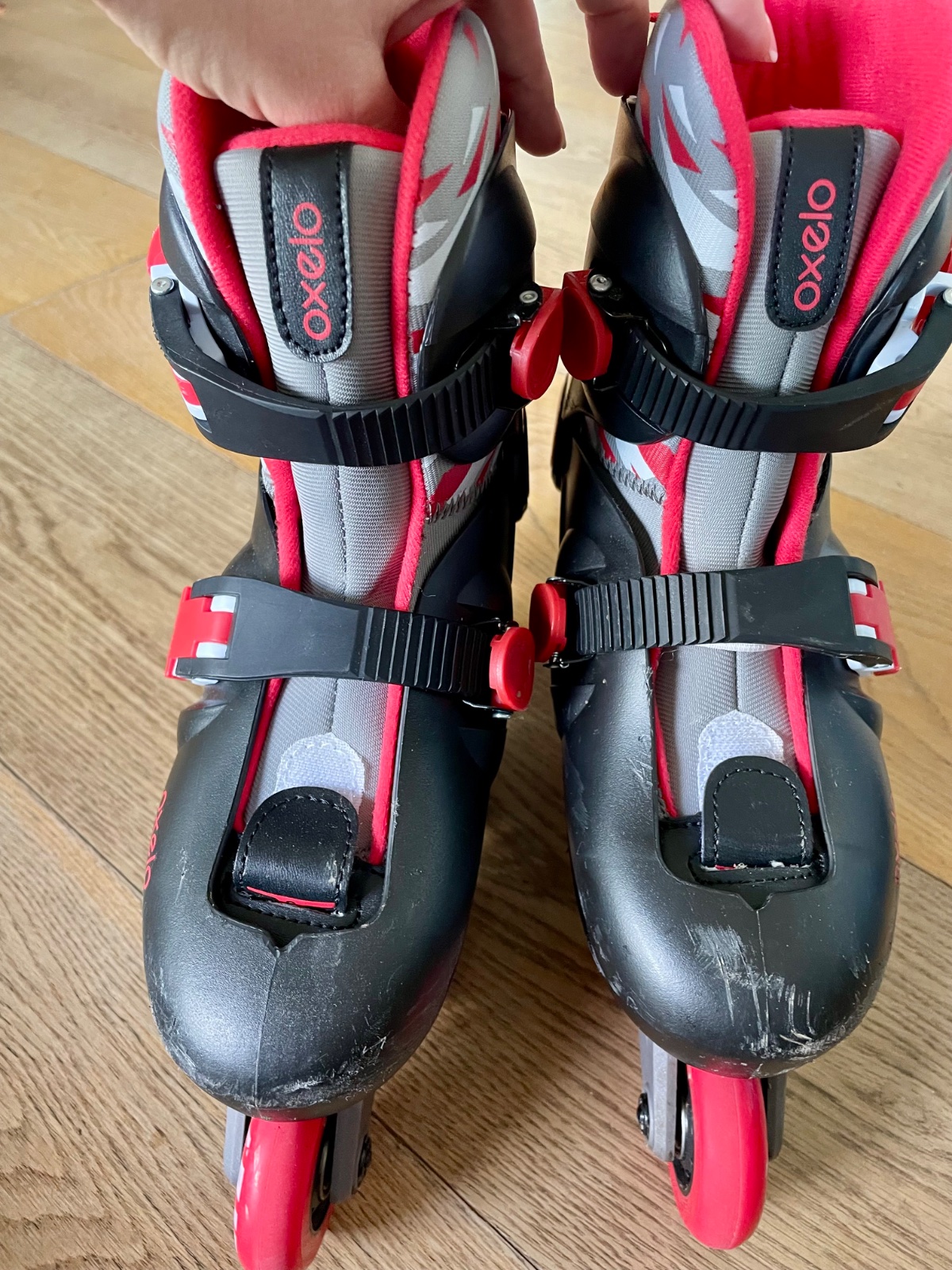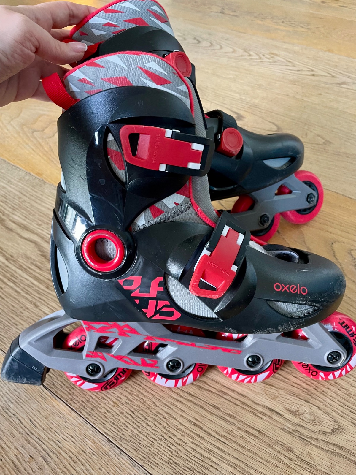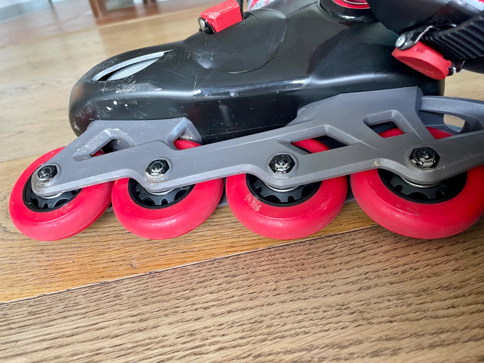 Párkrát použité, nastaviteľné 30-32, špička a boky trochu ošúchané, ale vnútorná vložka a kolieska v top stave.