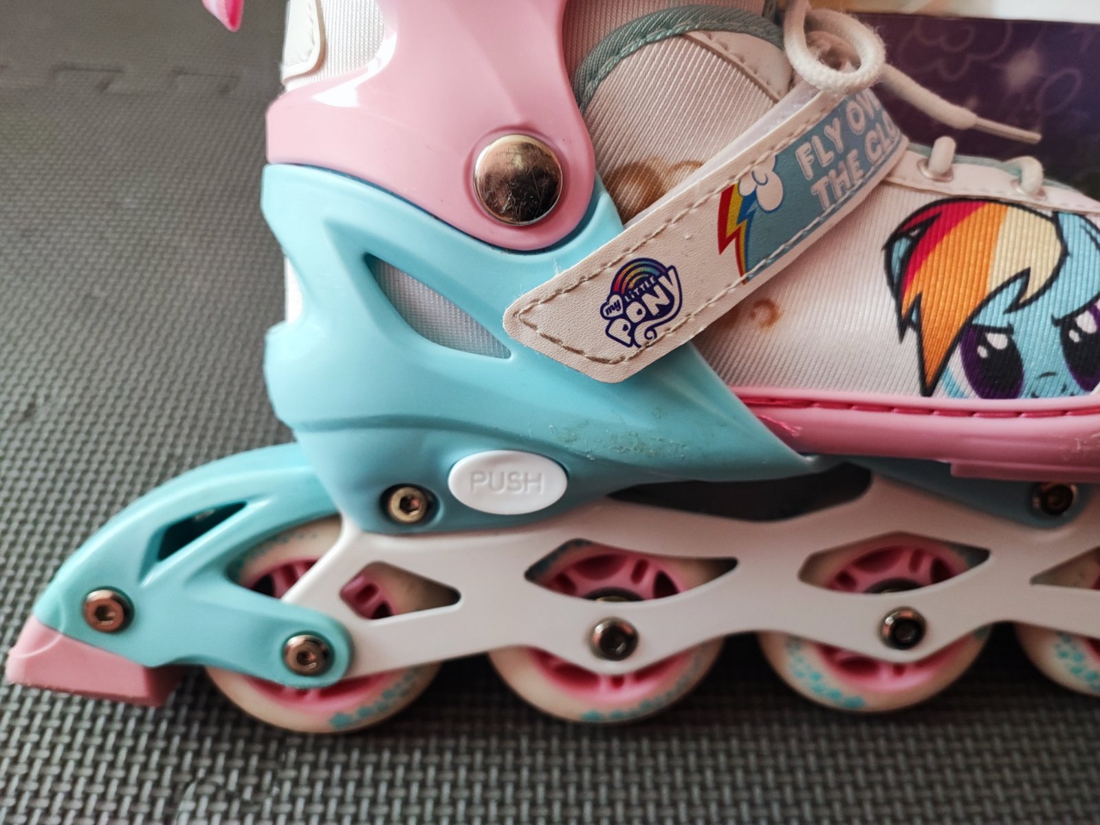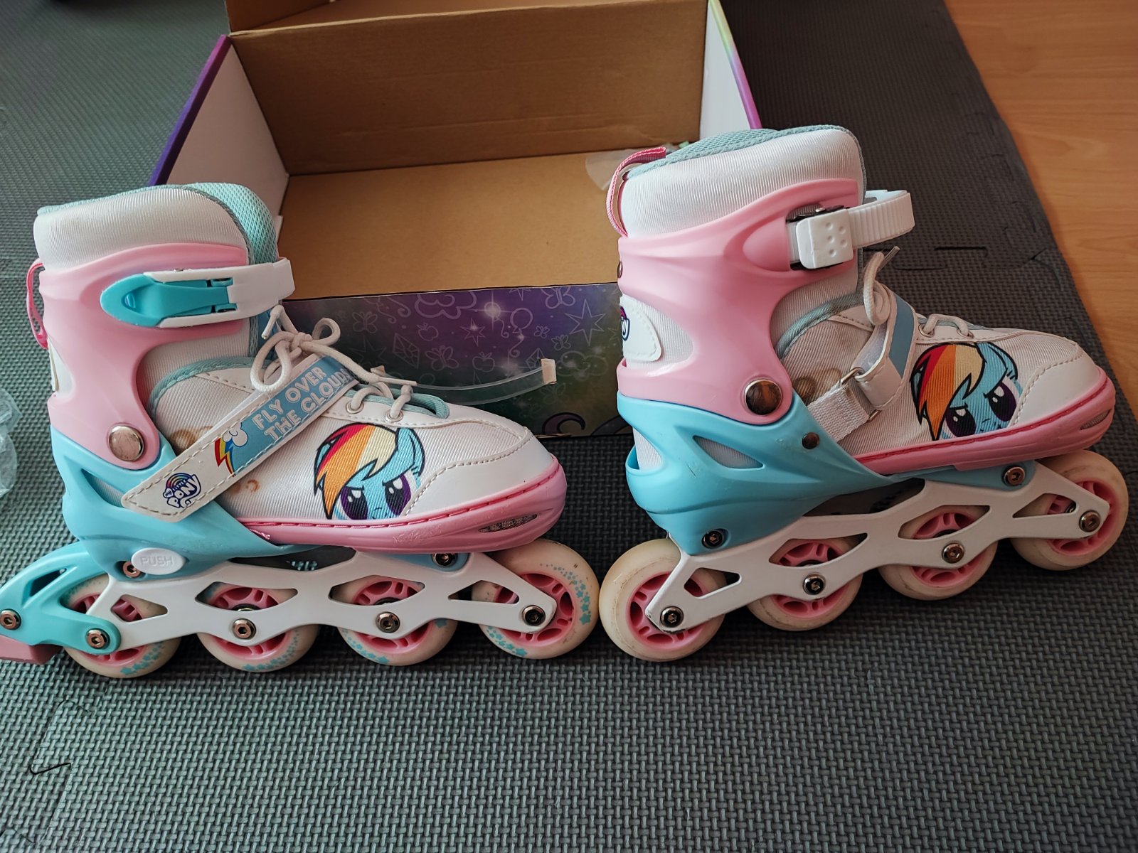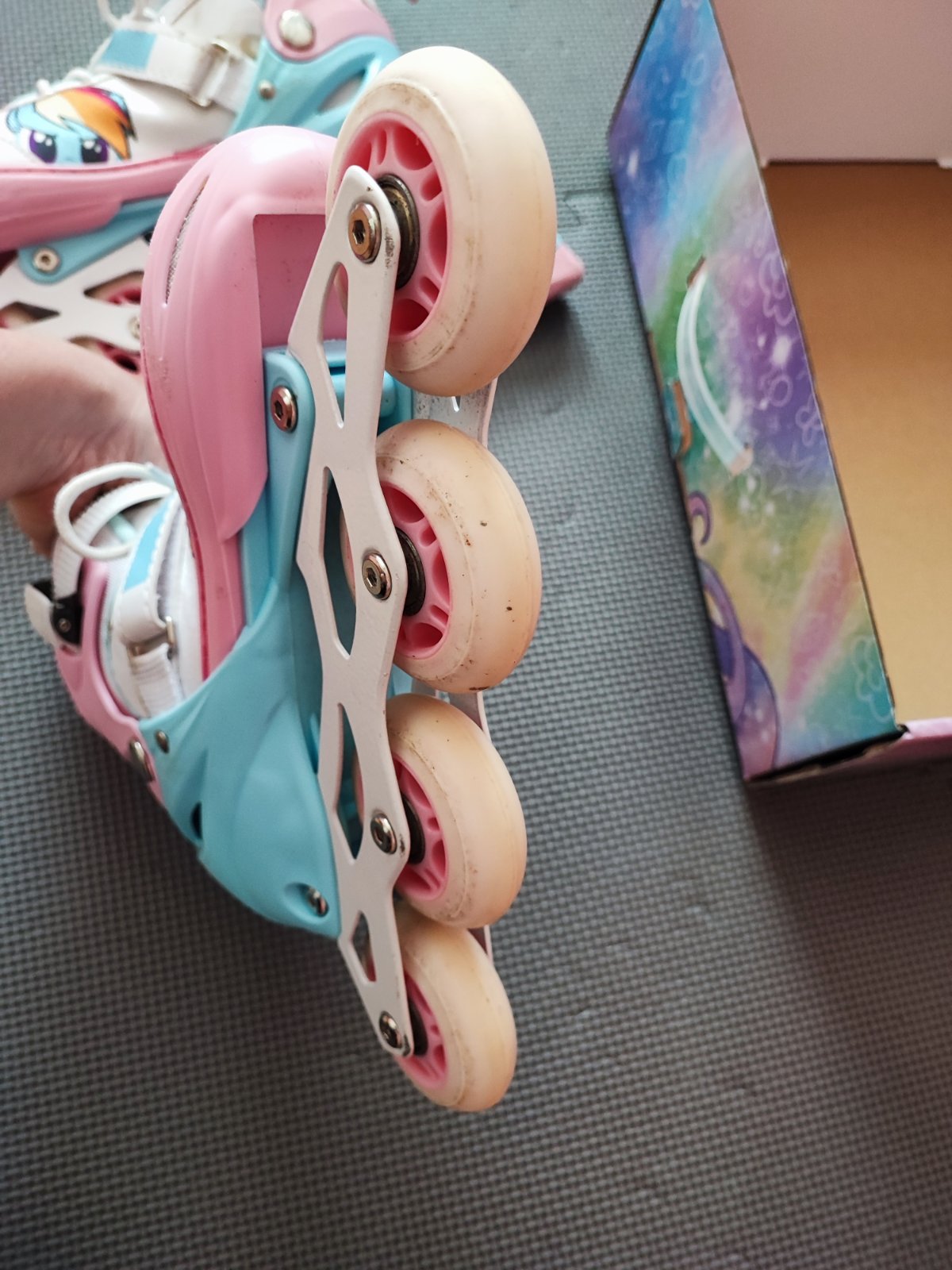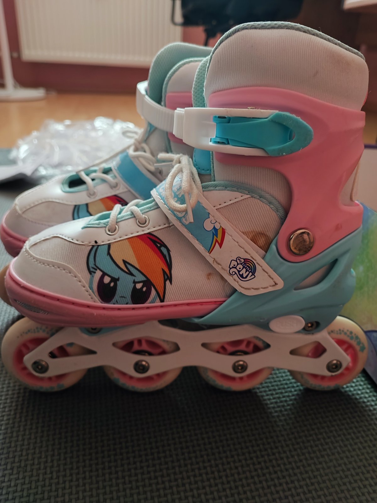 Dcéra sa na nich učila korčuľovať. Mierne šuchnutia sú. Kupovala som ich v Nay. Veľkosť je 33-37. Dá sa to posúvaním nastavovať. Na bokoch na tej látke sú stopy od tych kovových nitov. Sú plne funkčné. Šnúrky, uťahovanie, kolieska, brzda,....