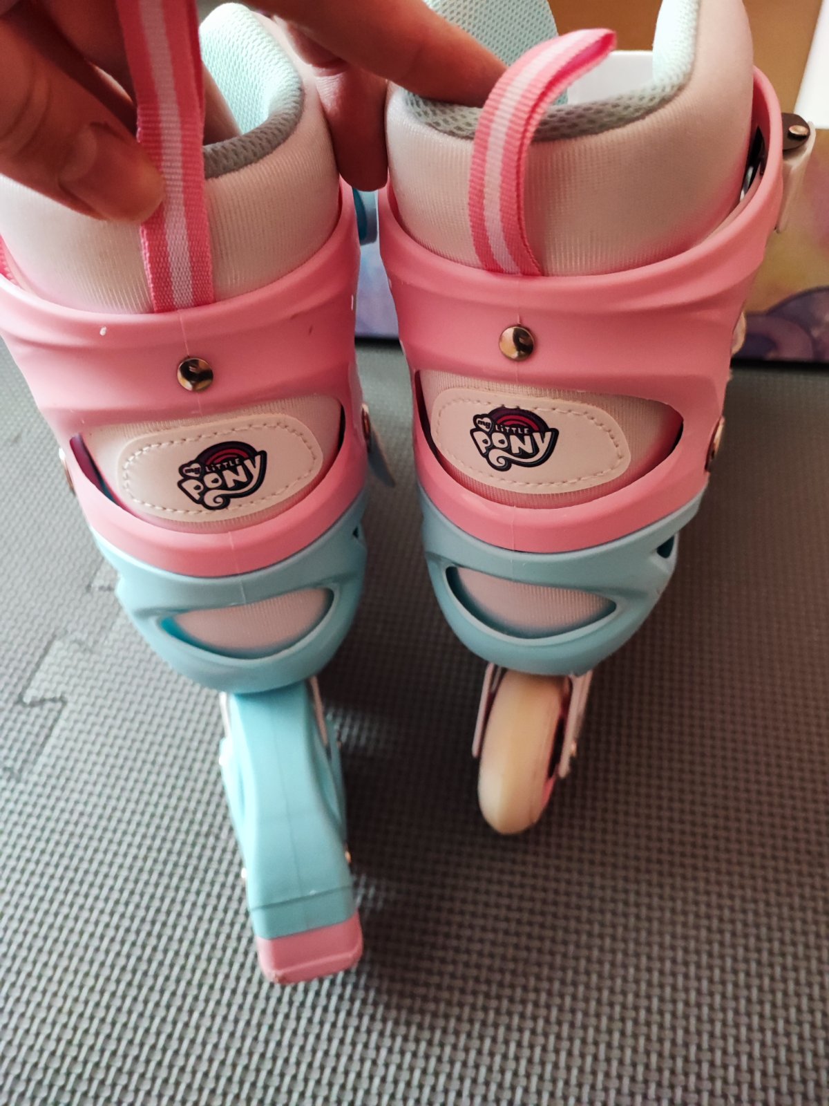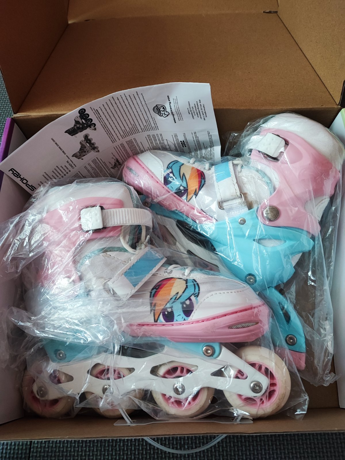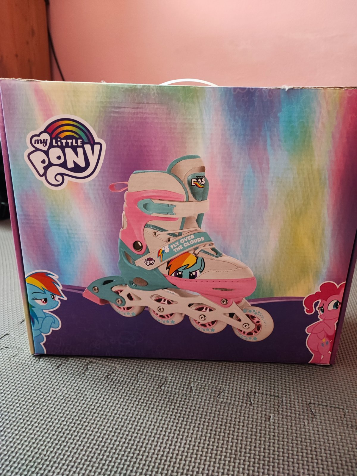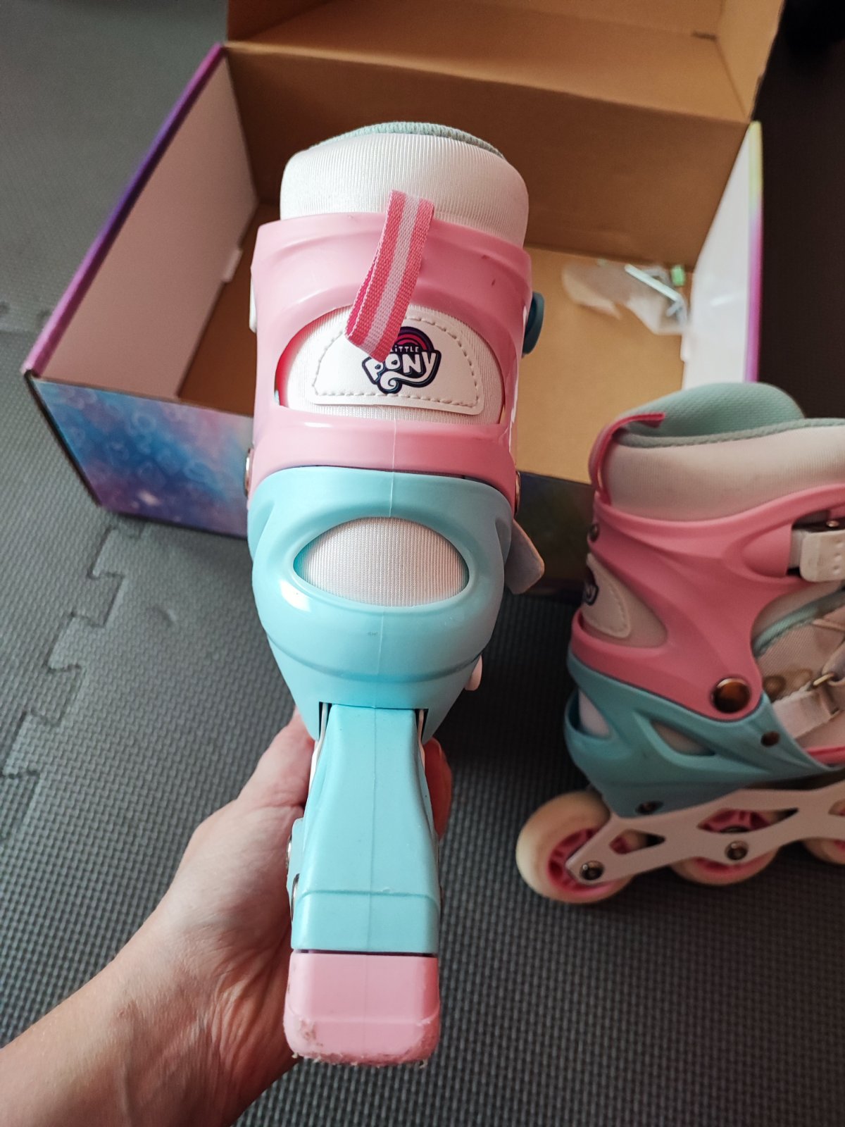 Dcéra sa na nich učila korčuľovať. Mierne šuchnutia sú. Kupovala som ich v Nay. Veľkosť je 33-37. Dá sa to posúvaním nastavovať. Na bokoch na tej látke sú stopy od tych kovových nitov. Sú plne funkčné. Šnúrky, uťahovanie, kolieska, brzda,....