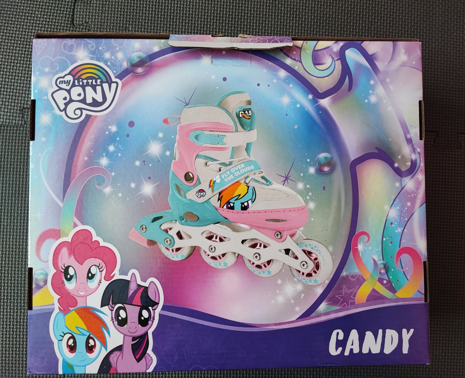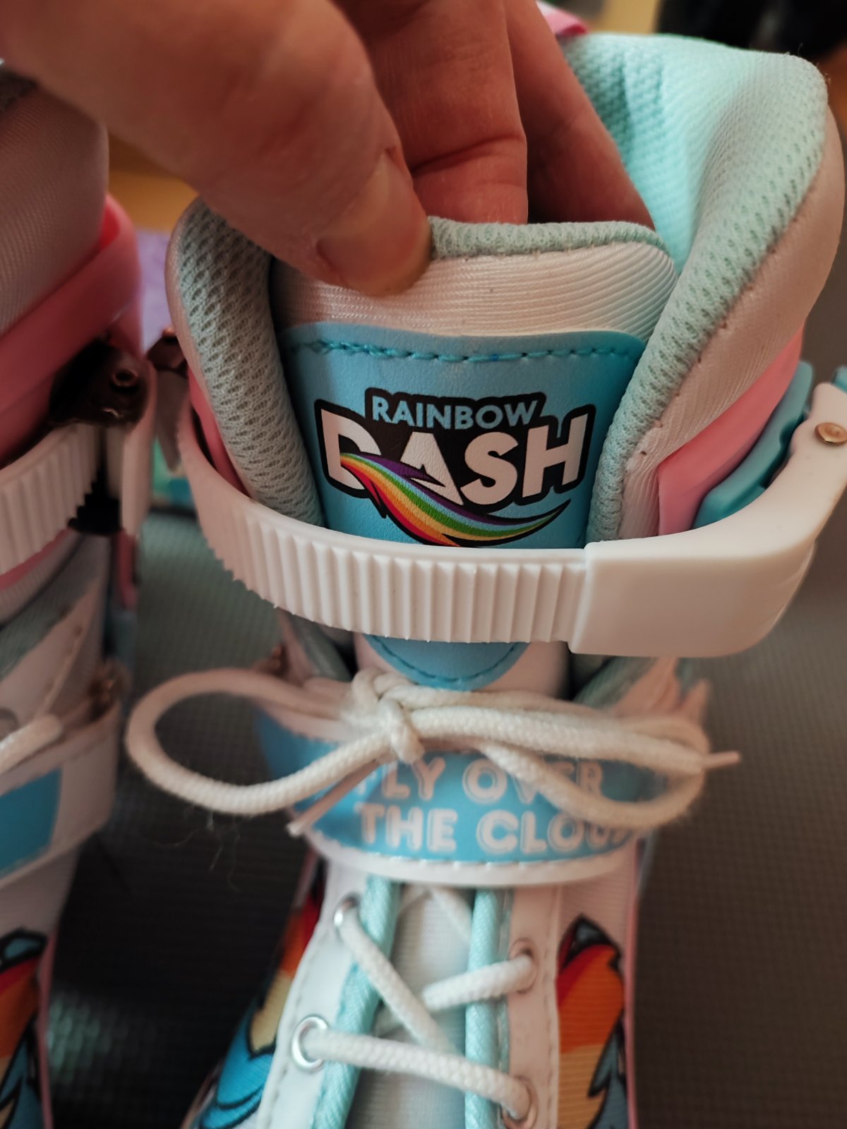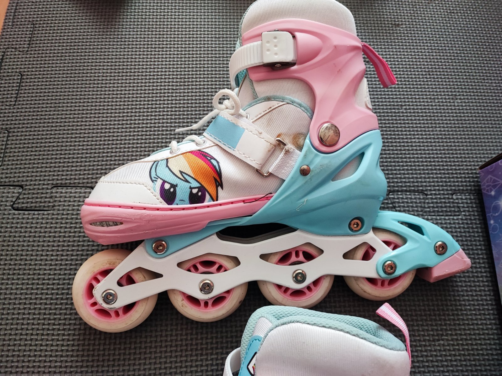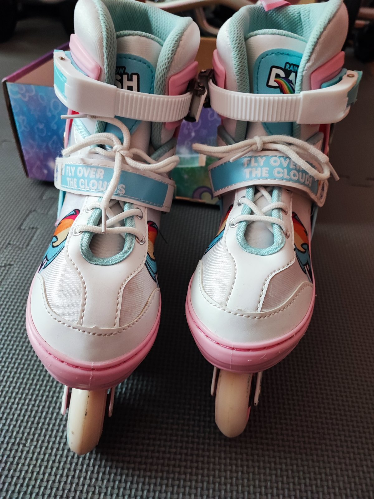 Dcéra sa na nich učila korčuľovať. Mierne šuchnutia sú. Kupovala som ich v Nay. Veľkosť je 33-37. Dá sa to posúvaním nastavovať. Na bokoch na tej látke sú stopy od tych kovových nitov. Sú plne funkčné. Šnúrky, uťahovanie, kolieska, brzda,....