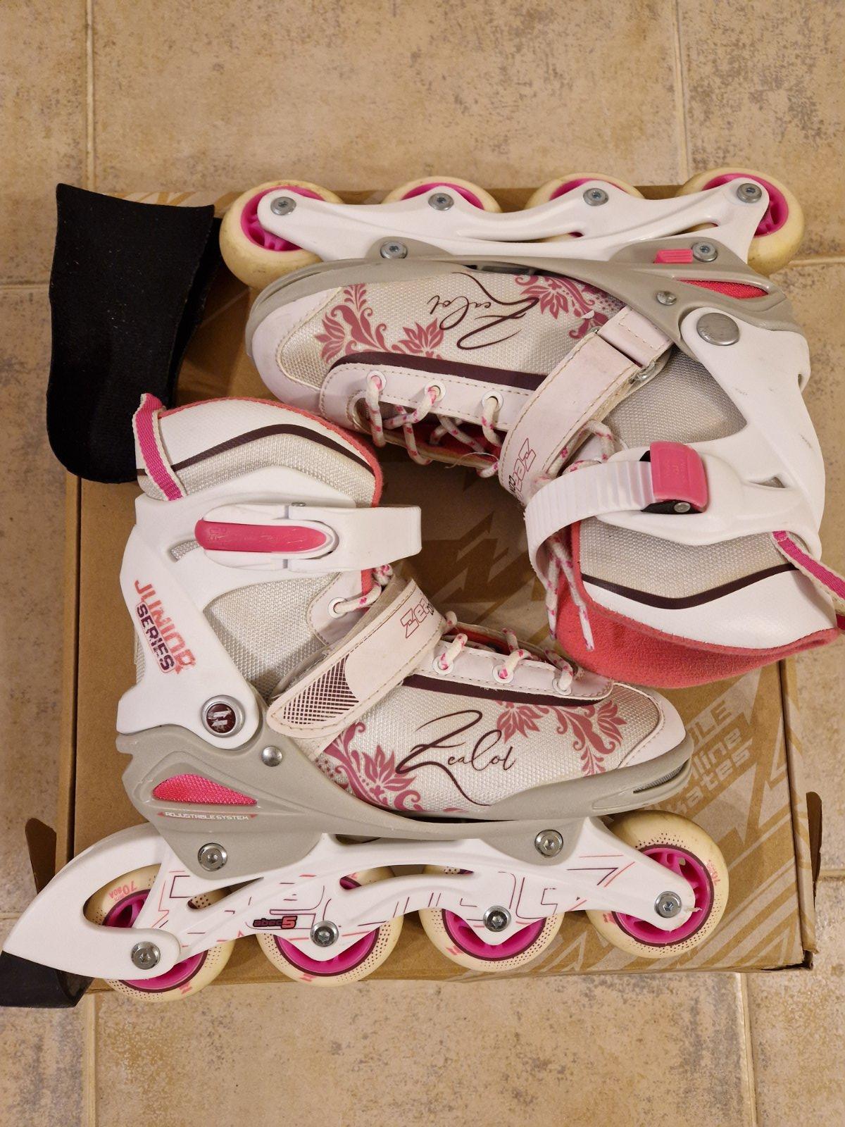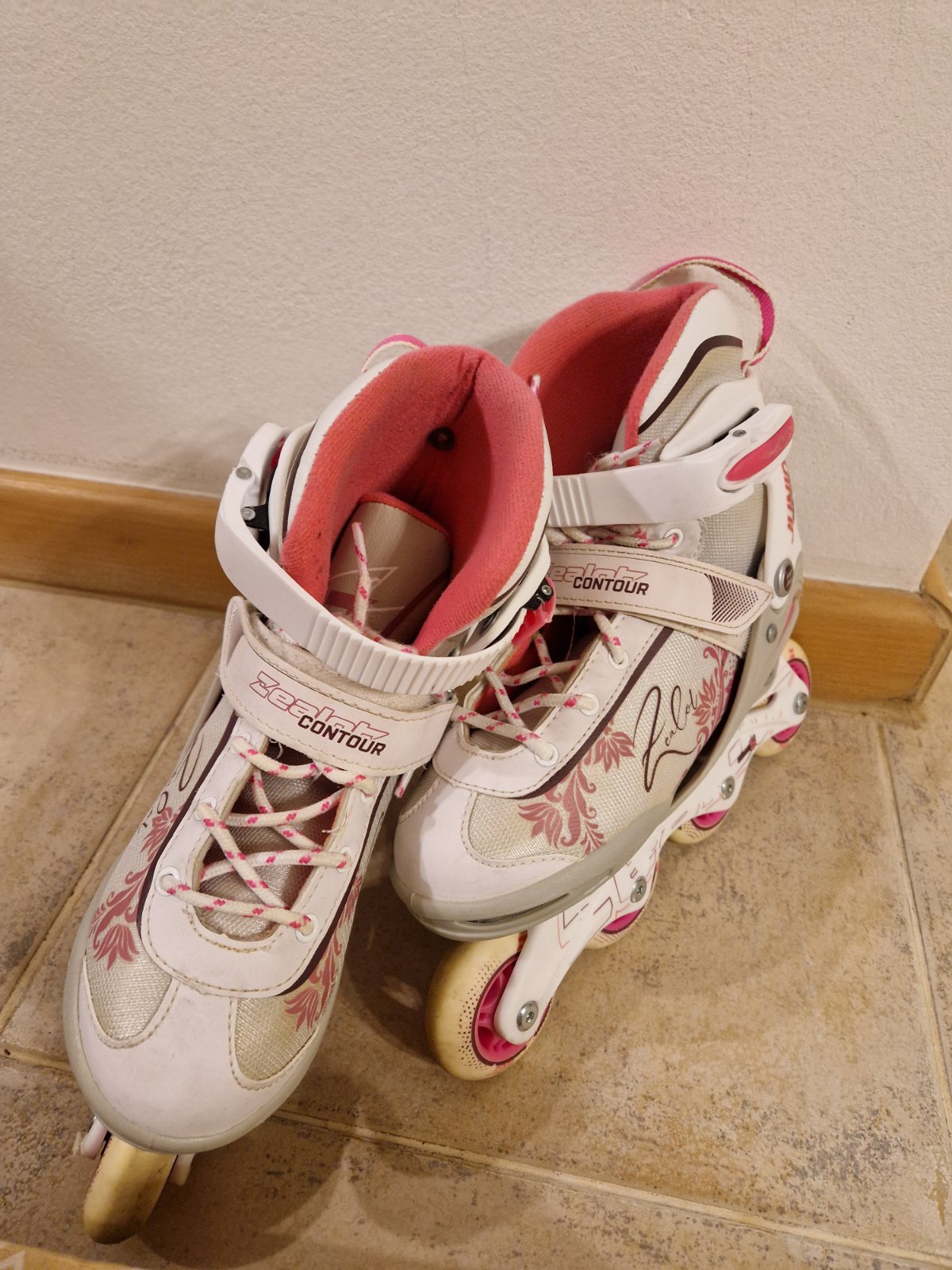 Malo nosene nastavitelne rastuce korcule pre cca dievca 8-11rokov, nastavitelne od cisla 33 do 36. Vidiet zw neposkodene, vlozky v top stave. EU 33-36, 22-24cm - udaje z povodnej krabice. Zealot inline Contour W9A.