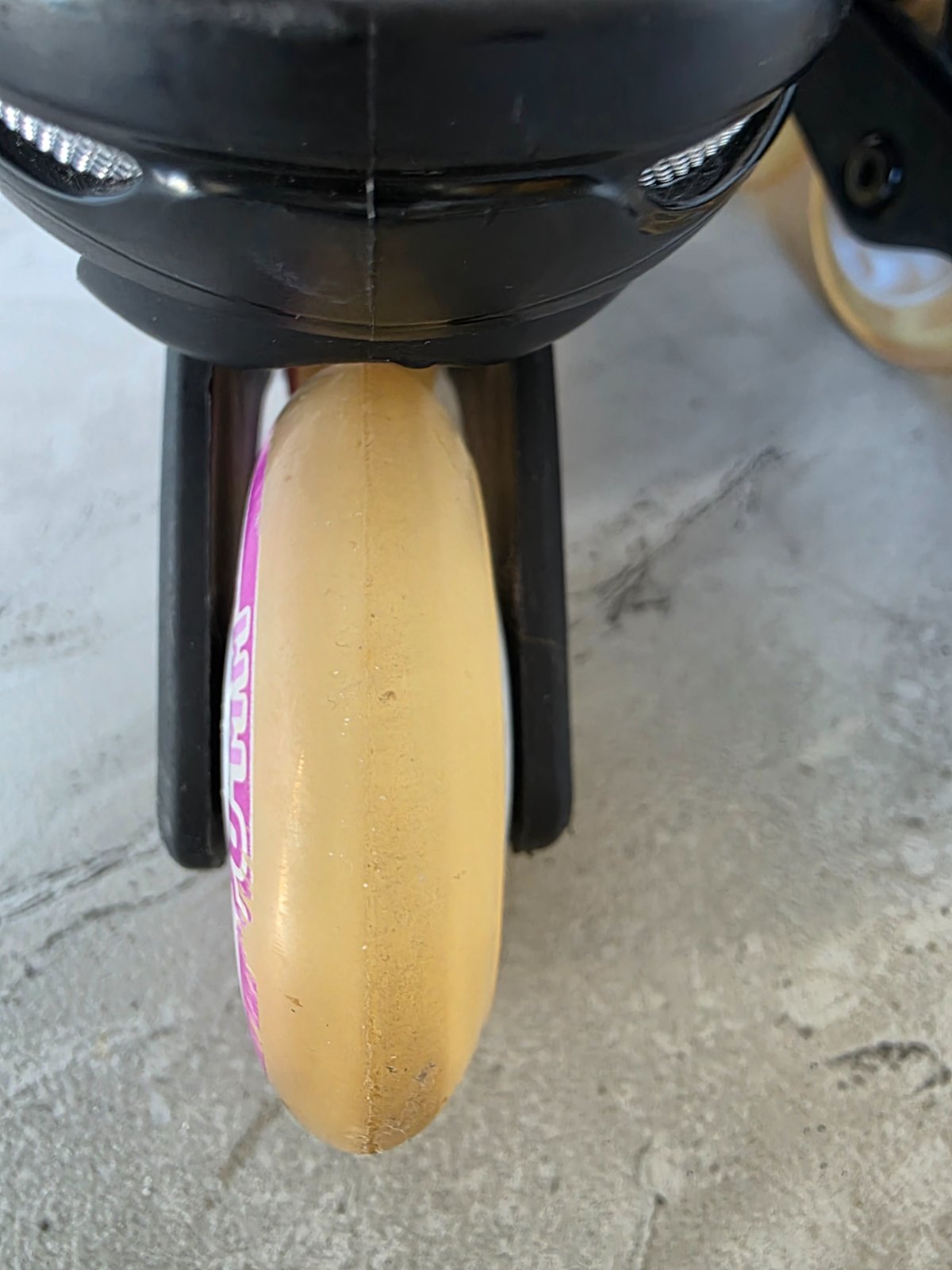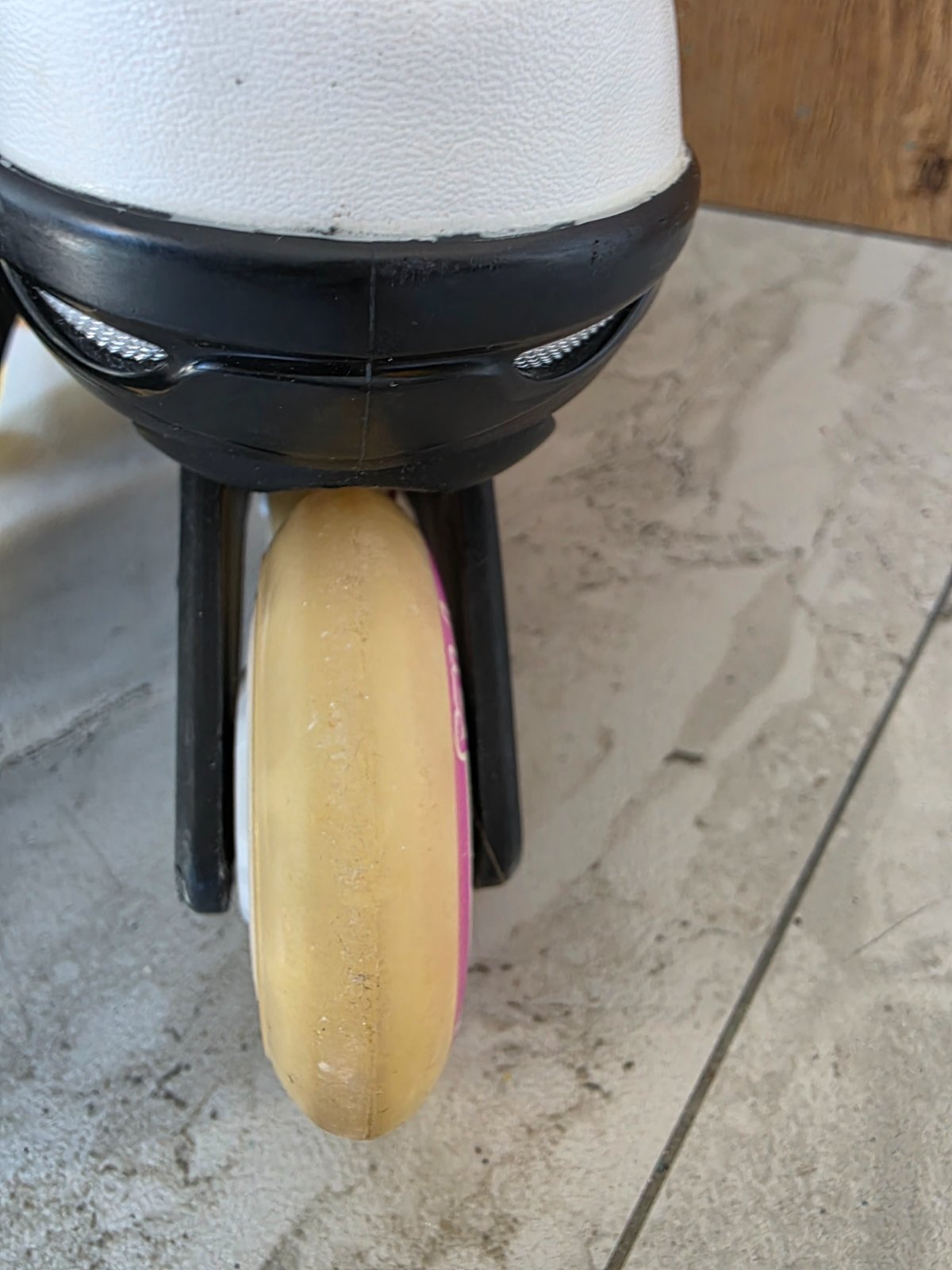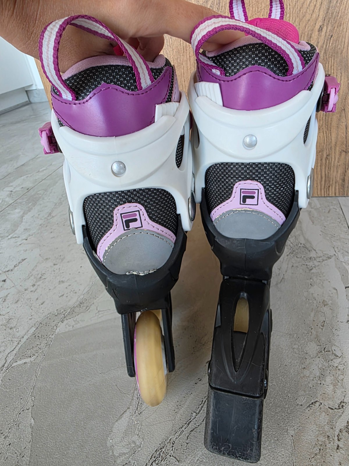 Rastúce korčule vo veľkosti 28-32, to znamená 17-19cm. Dcéra sa na nich učila, takže majú minimum chybičiek krásy. Kolieska nie sú vydraté a brzda je len minimalne opotrebovaná. Zapínanie je tiež plne funkčné.