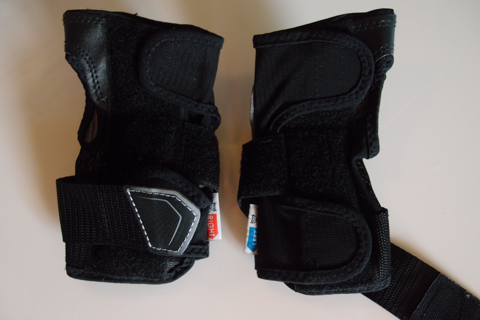 3 elastické pásky na suchý zips umožňujú jednoduché nastavenie veľkosti. Plastové škrupiny na dlani (odnímateľné) a zápästí. Kupované v Decathlone.
