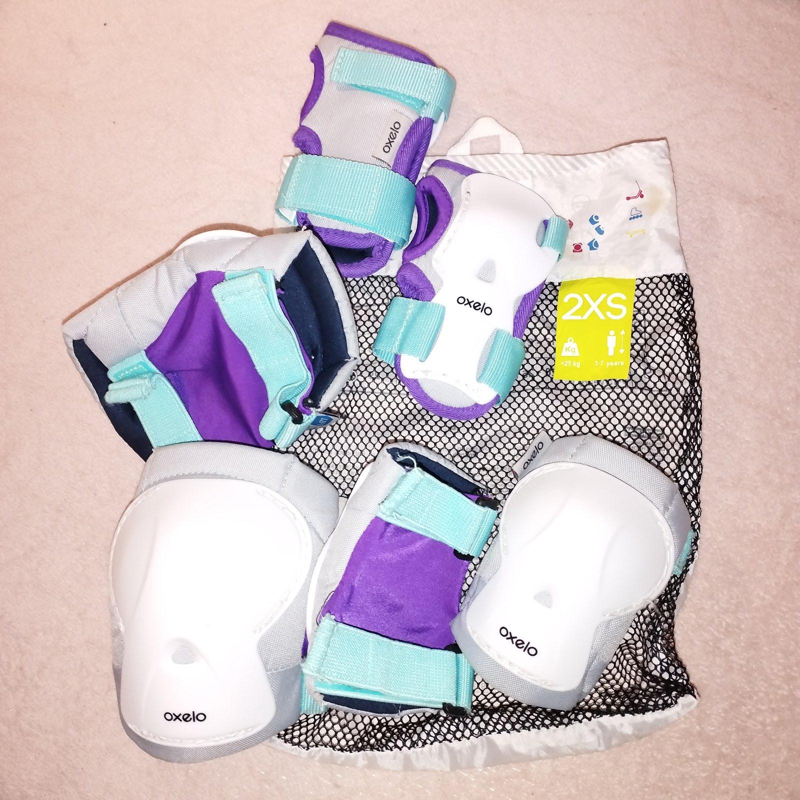 Krásne chrániče na kolobežku či korčule pre dievčatko 3-7r, do 25kg použité boli len párkrát, kombinácia biela s tyrkysovou a fialovou, v peknom používanom stave
