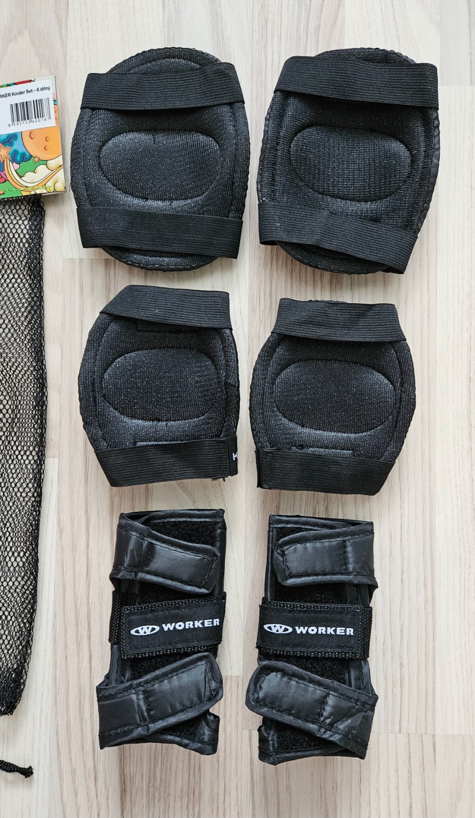 Ponúkam 6 dielnu sadu detských chráničov Worker - na kolená, lakte a dlane, používané, vo veľmi dobrom stave, iba na plastových dopadových plochách sú jemné škrabance, čomu sa nedá vyhnúť, inak bez poškodený, suché zipsy dobre držia.