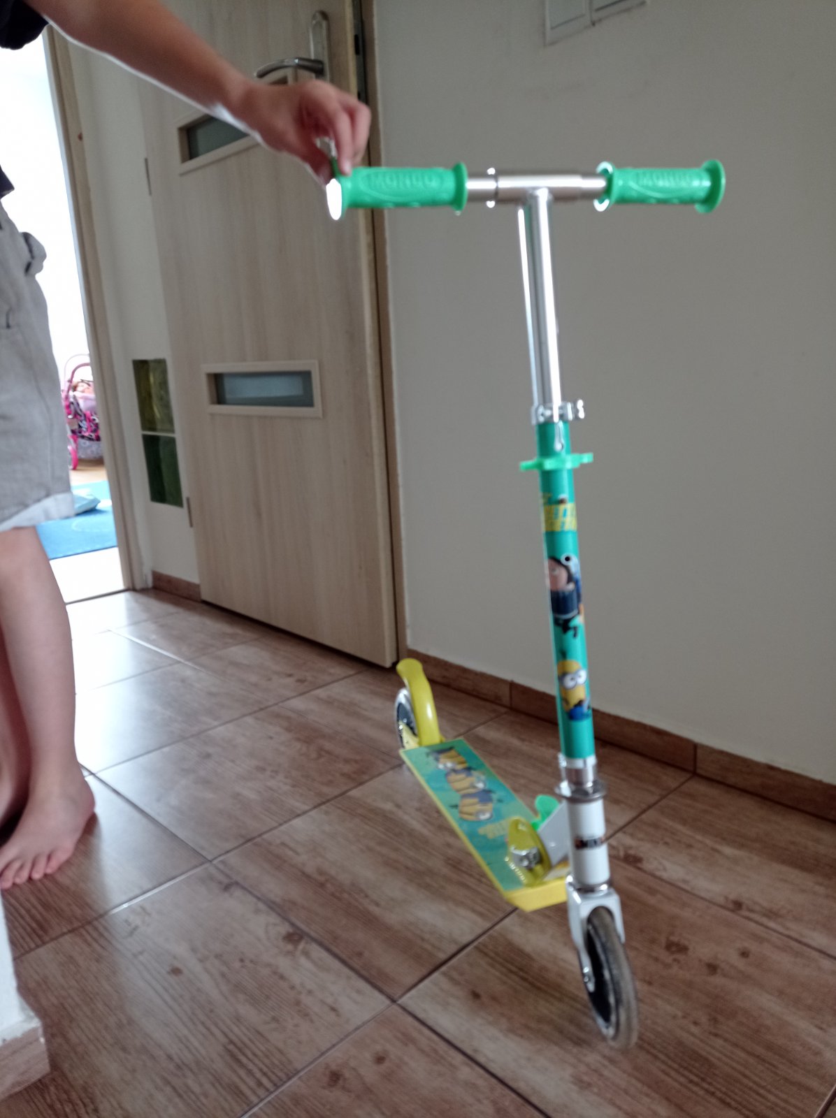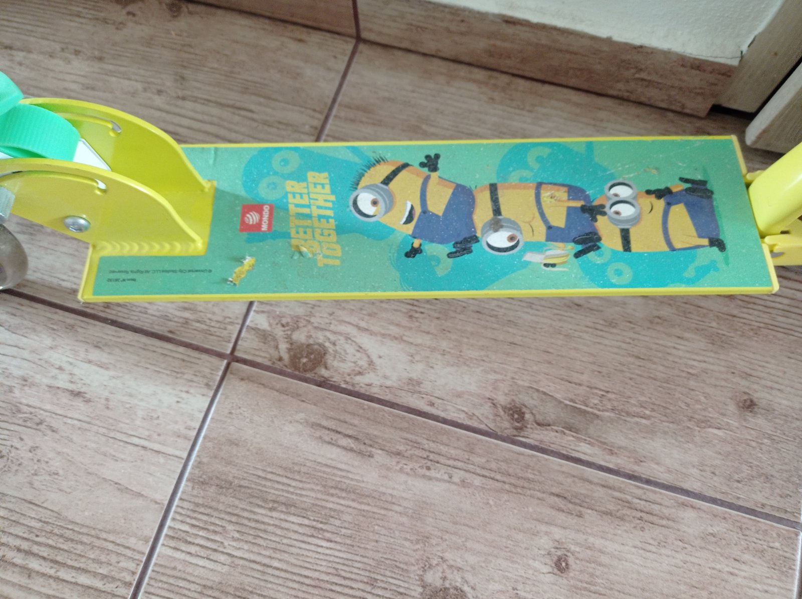 Ponúkam na predaj kolobežku, zakúpená v Lidli. Pôvodná cena 19,90 €. Používaná jedným dieťaťom. Bežné známky používania, inak dobrý stav. Na ploche pre nohy je jemné oškretie obrázka, nemá vplyv na funkčnosť (viď foto). Len osobný odber, prosím.